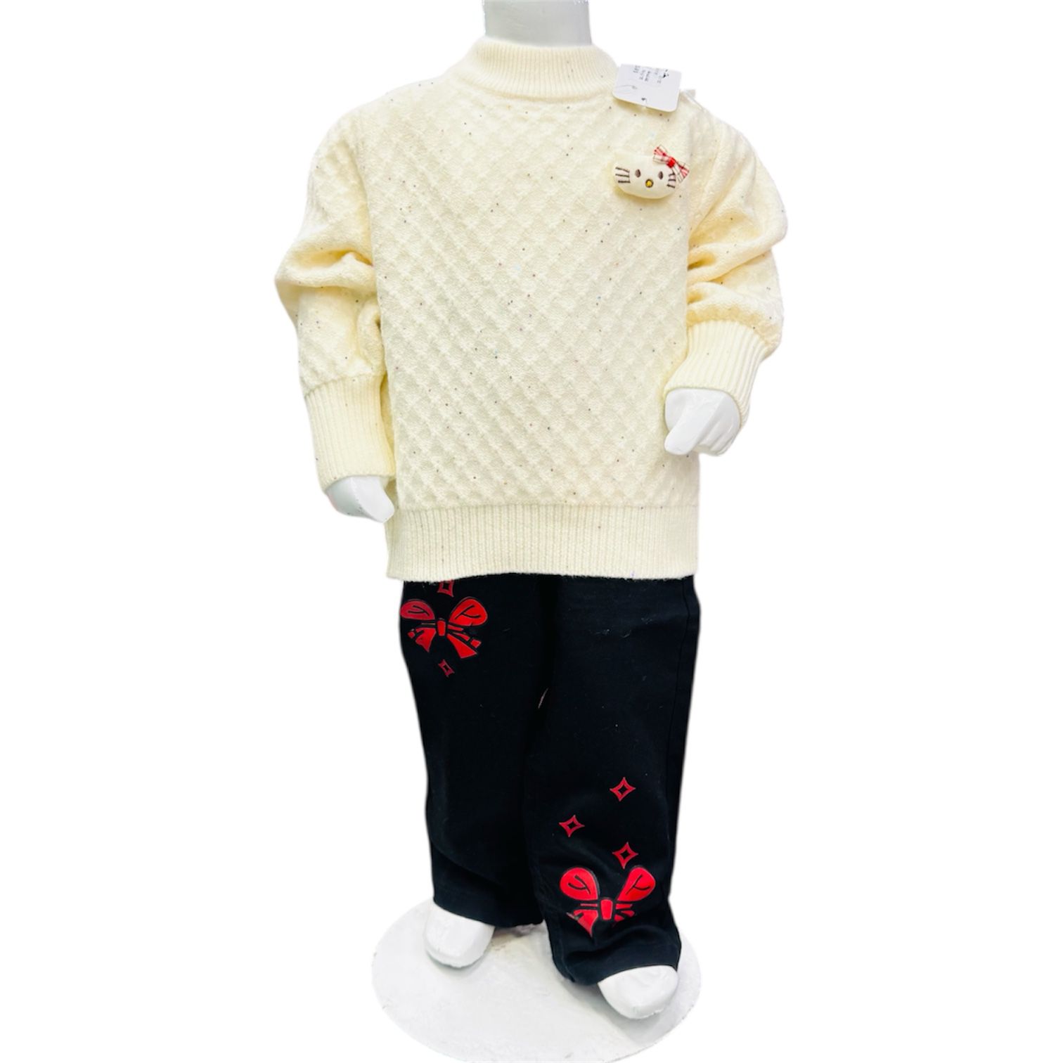 Elegant girls winter outfit with a cream quilted knit sweater and black bow-print pants for cozy everyday style.