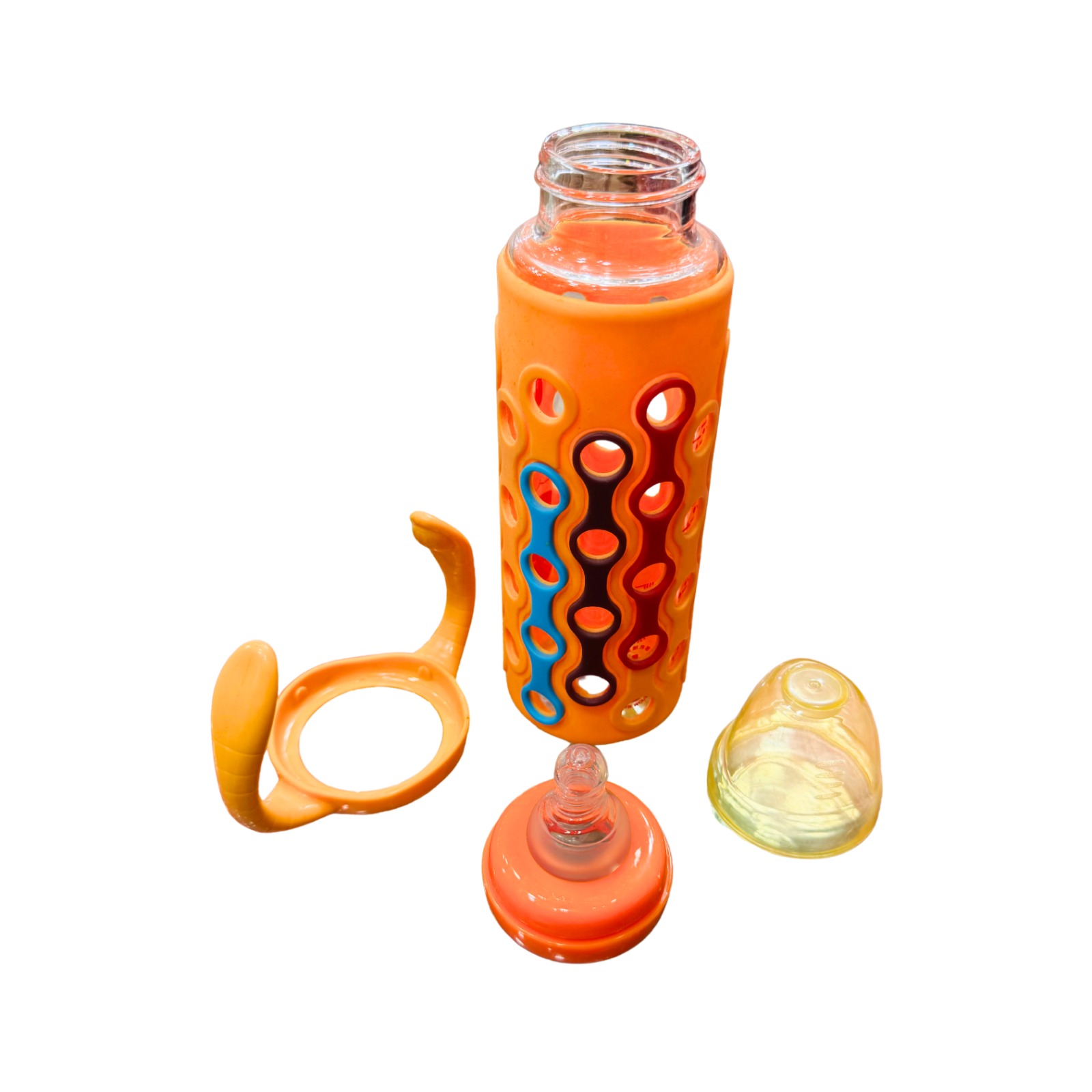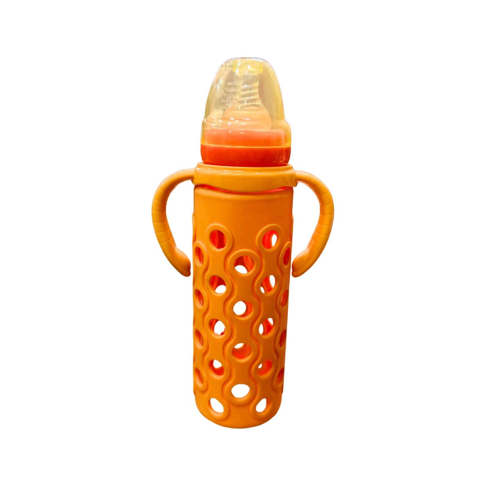 This Baby Feeding Bottle with Protective Sleeve & Dual Handles is designed to make feeding time safe, easy, and comfortable for both babies and parents. The bottle features a soft silicone nipple for natural feeding and a protective outer sleeve that provides better grip and helps prevent breakage.