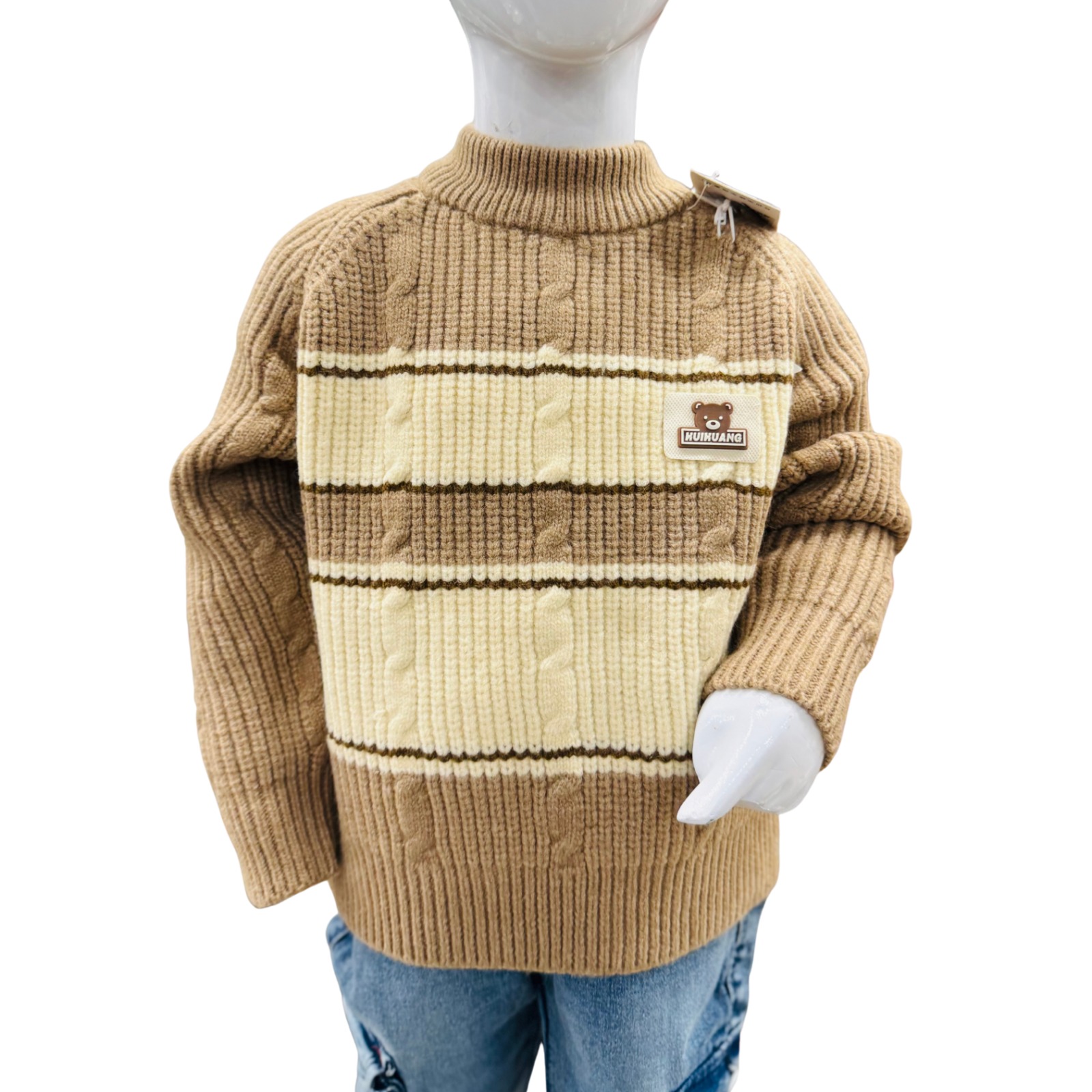 Be the first to review “Boys Brown & Beige Cable Knit Winter Sweater with Denim Jeans Set”