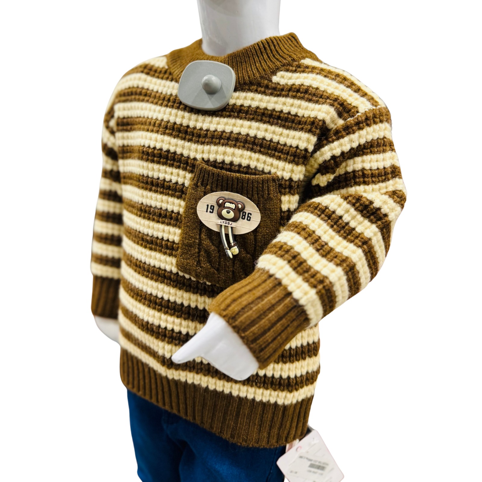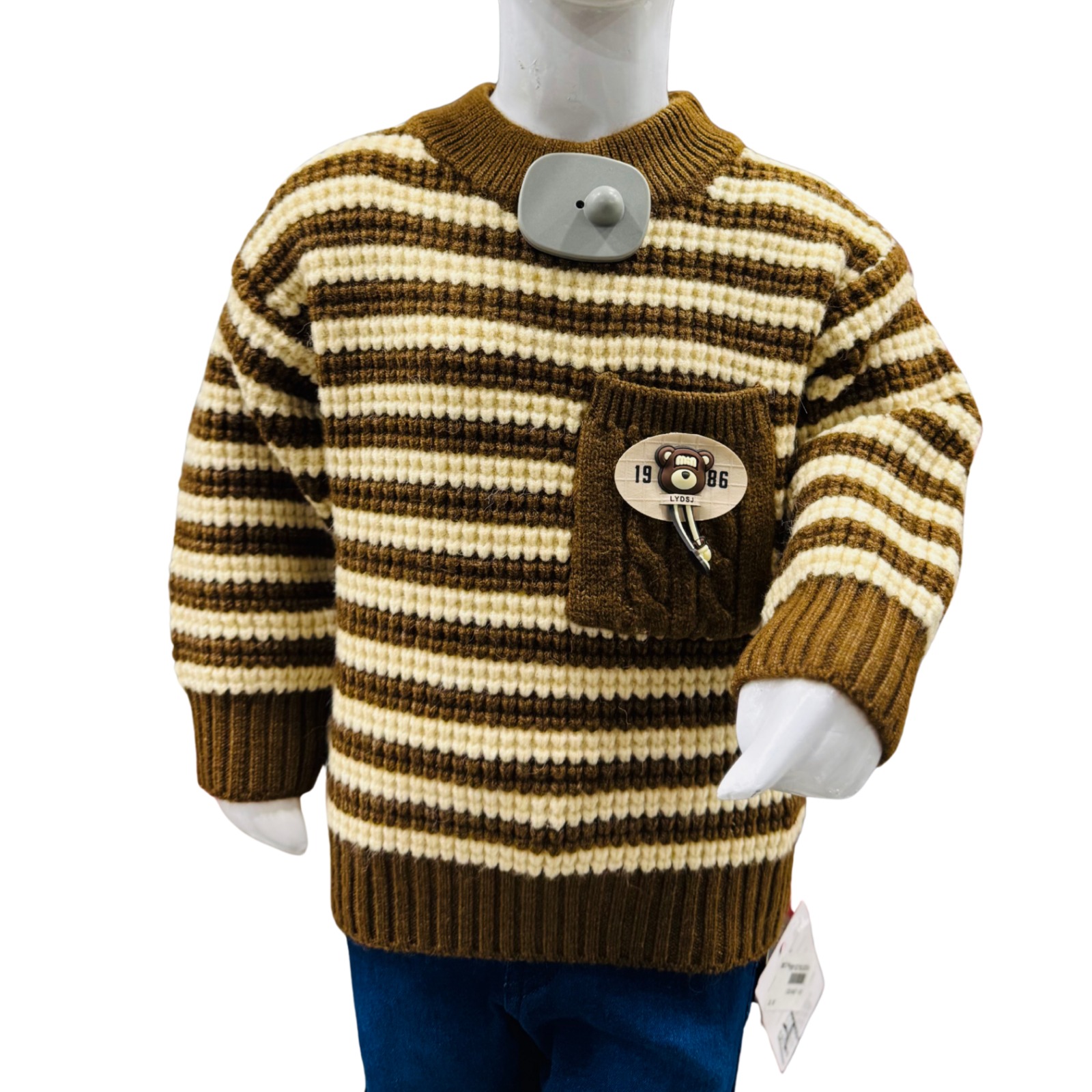 A warm and stylish boys’ winter outfit featuring a brown and cream striped knitted sweater with a cute pocket patch, paired with soft and durable denim jeans.