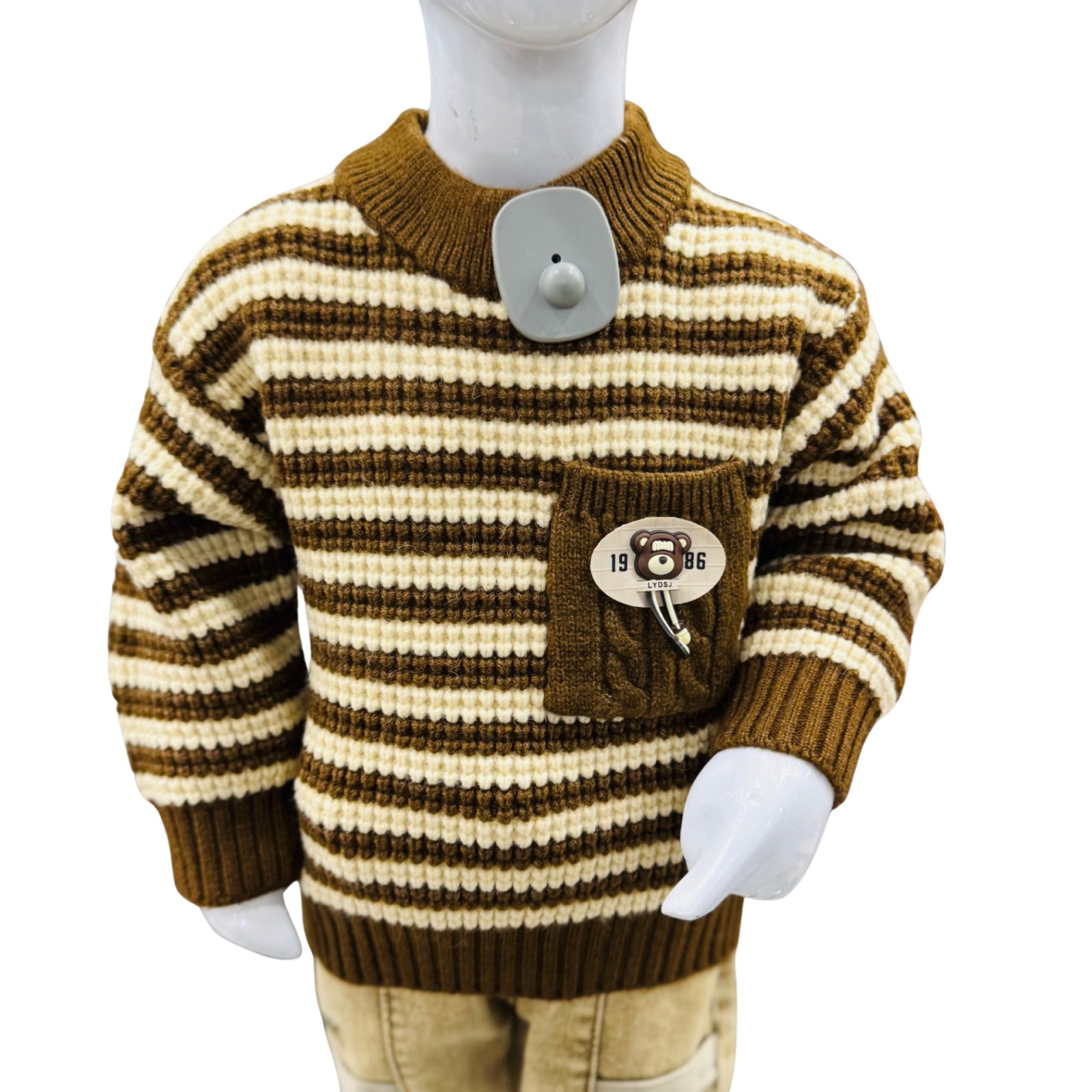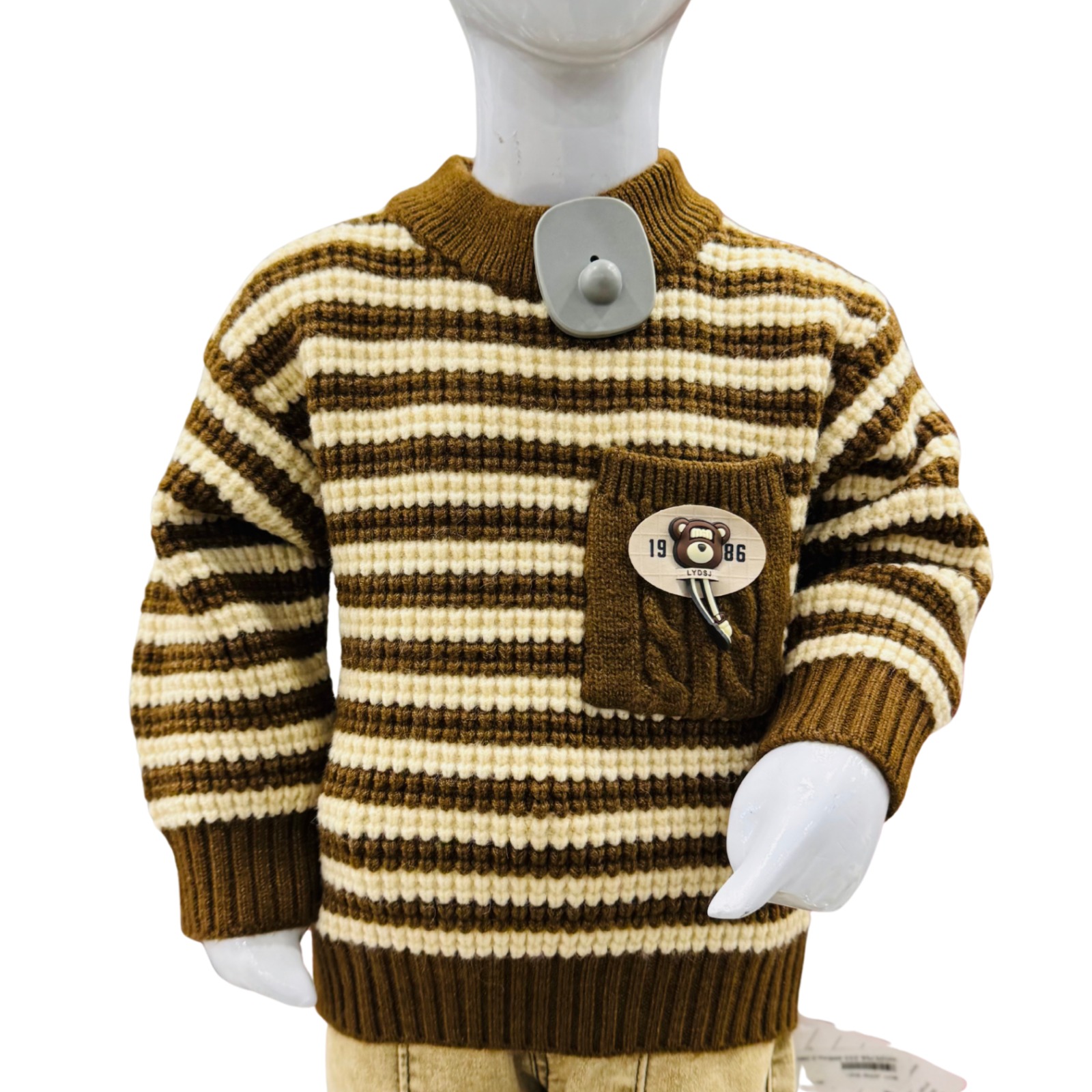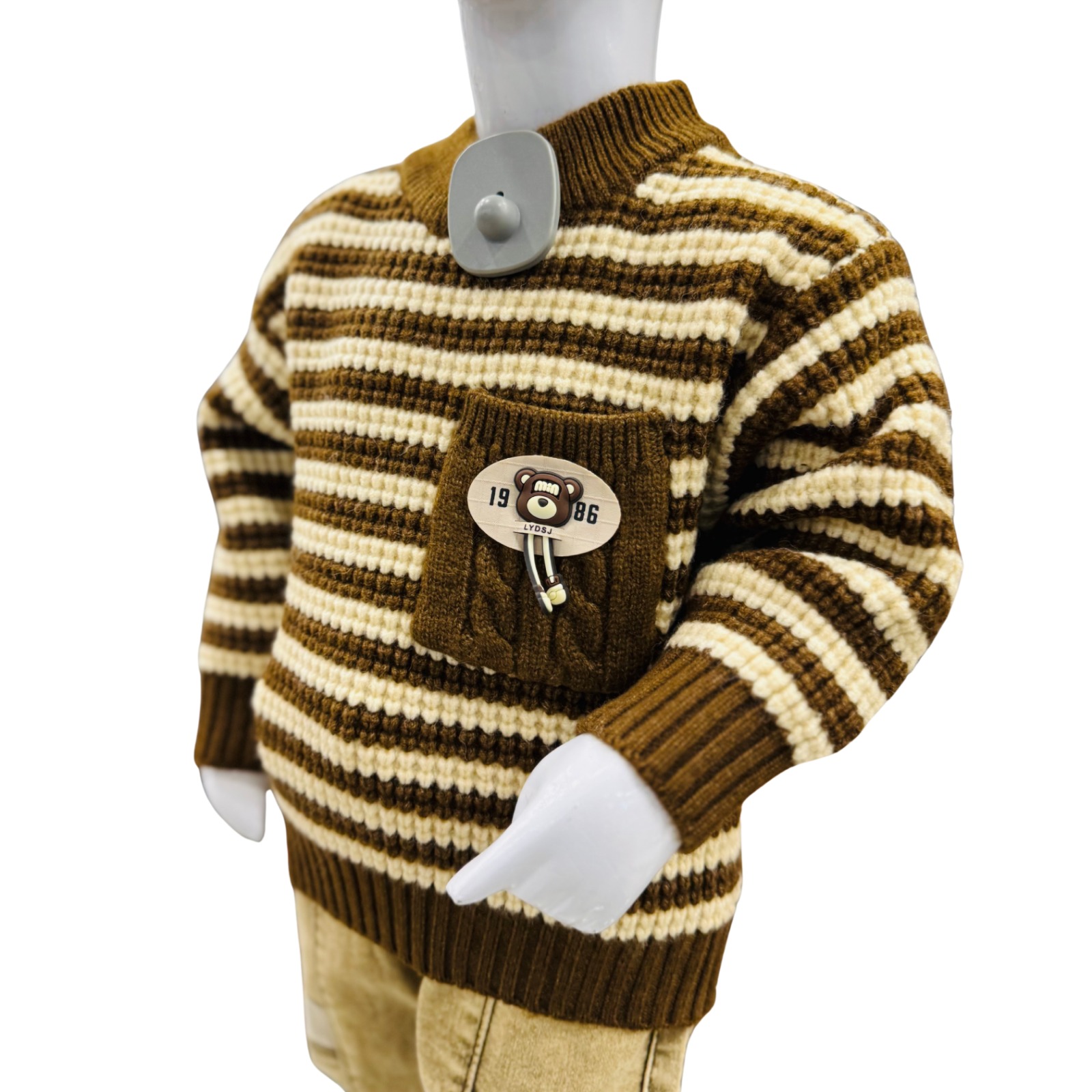 Keep your little boy cozy and stylish this winter with our Boys Brown Striped Winter Sweater & Denim Pants Set. The premium-quality knit sweater comes with a classic striped design in warm brown and beige tones, giving a charming and modern winter look. Its soft fabric and ribbed cuffs provide comfort and warmth throughout the day.