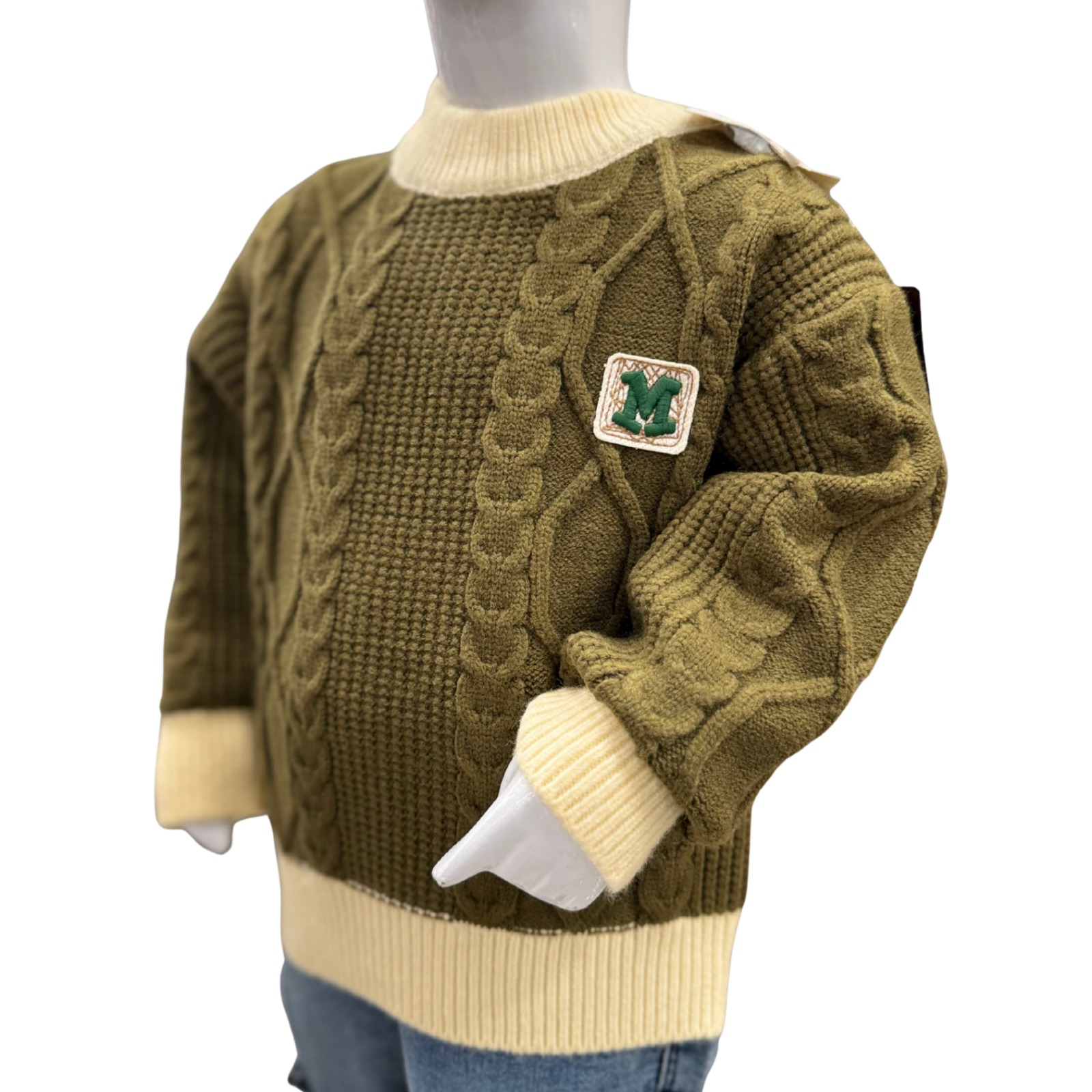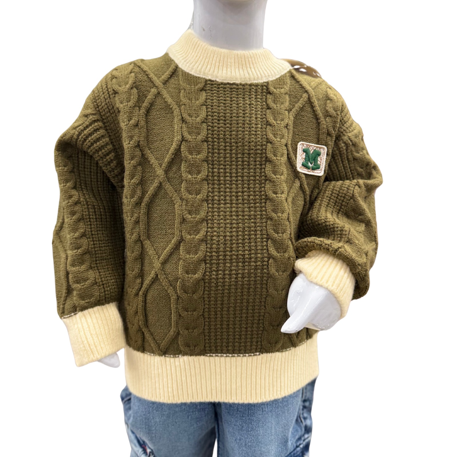 Keep your child warm and stylish this winter with this Boys Cable Knit Winter Sweater Set. The sweater is crafted from high-quality wool-blend knit fabric in a rich olive green color, designed with classic cable knit patterns that add a premium and cozy feel. The contrast cream ribbed neckline, cuffs, and hem give the sweater a refined winter look.