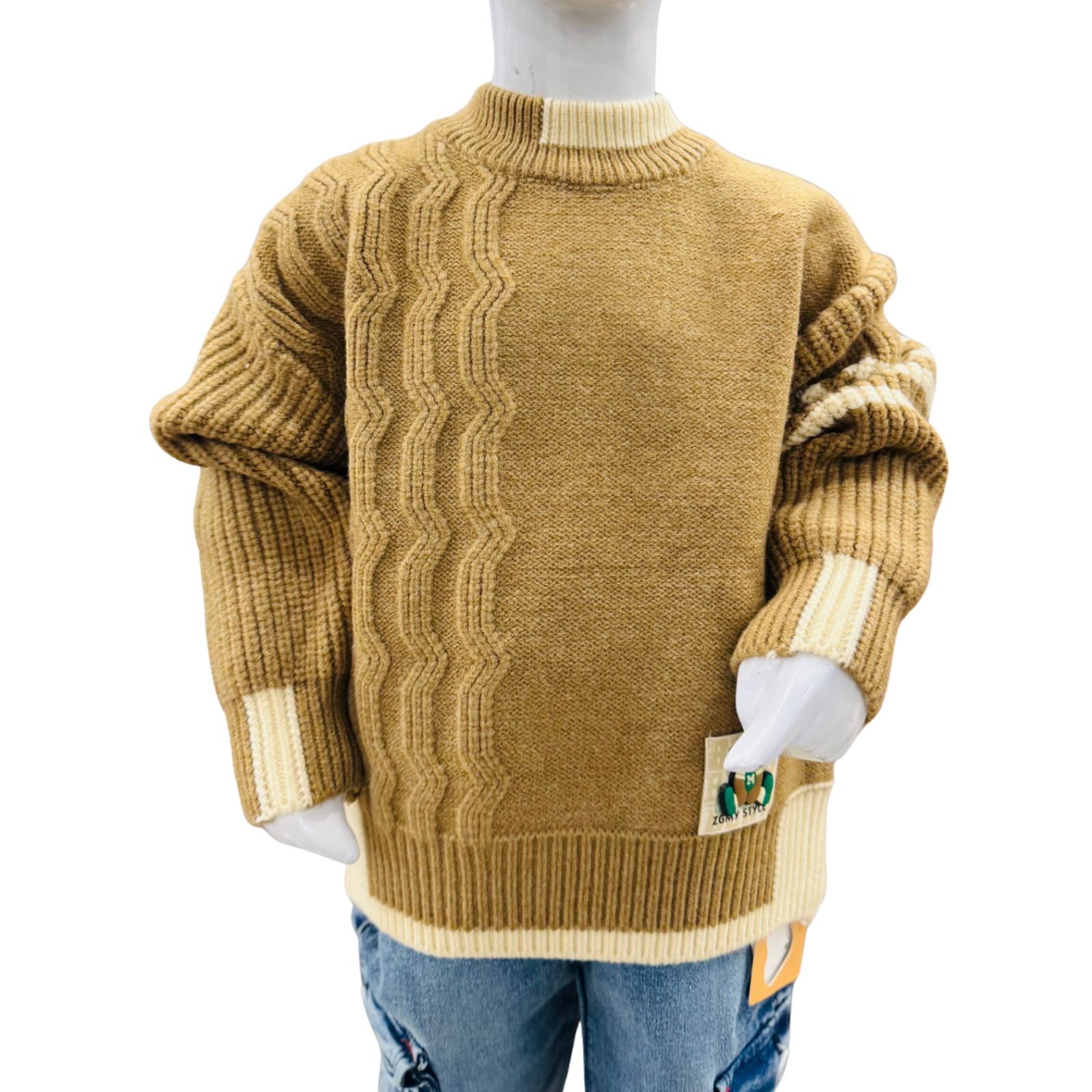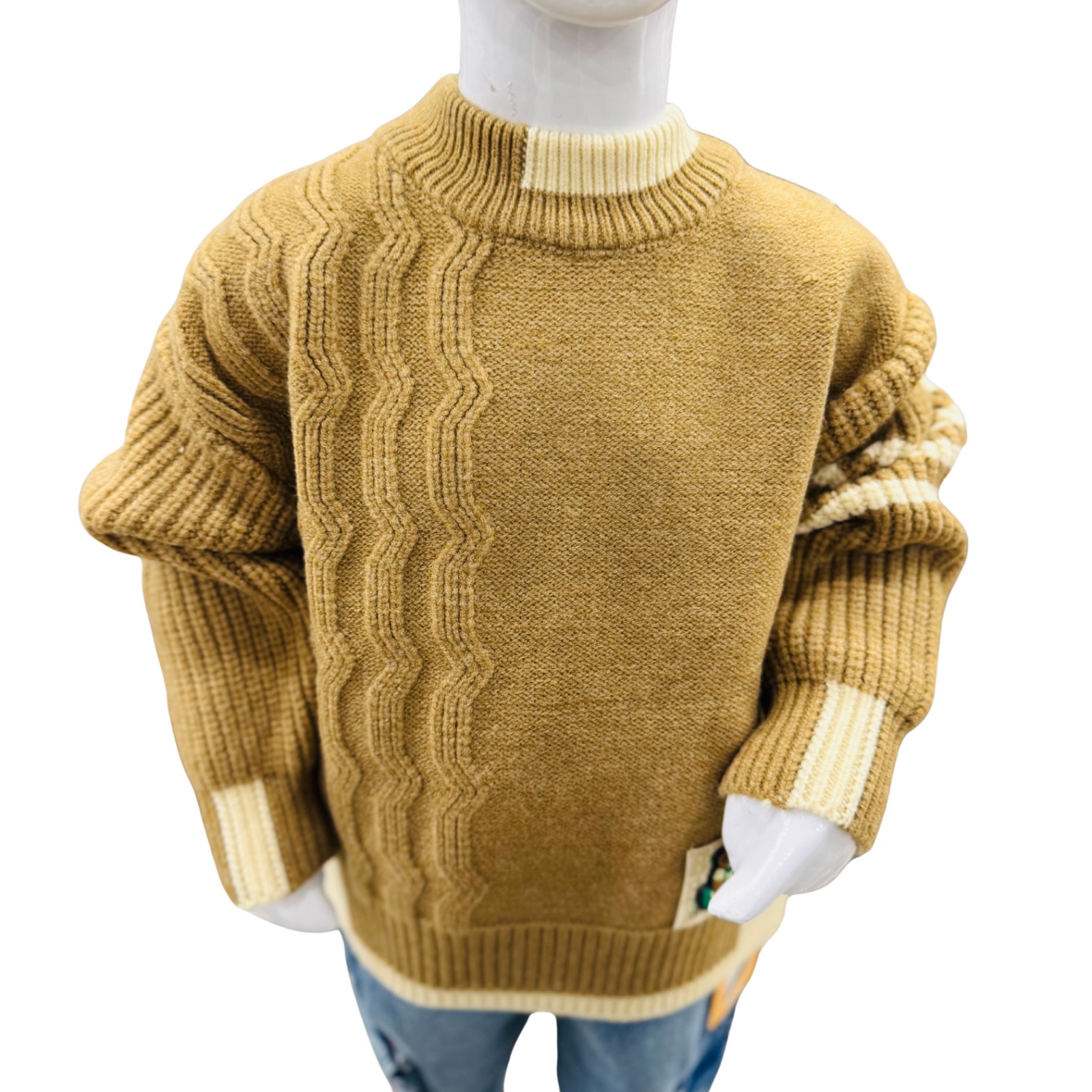 This Boys Camel Brown Cable-Knit Winter Sweater Outfit delivers both warmth and style for the chilly season.