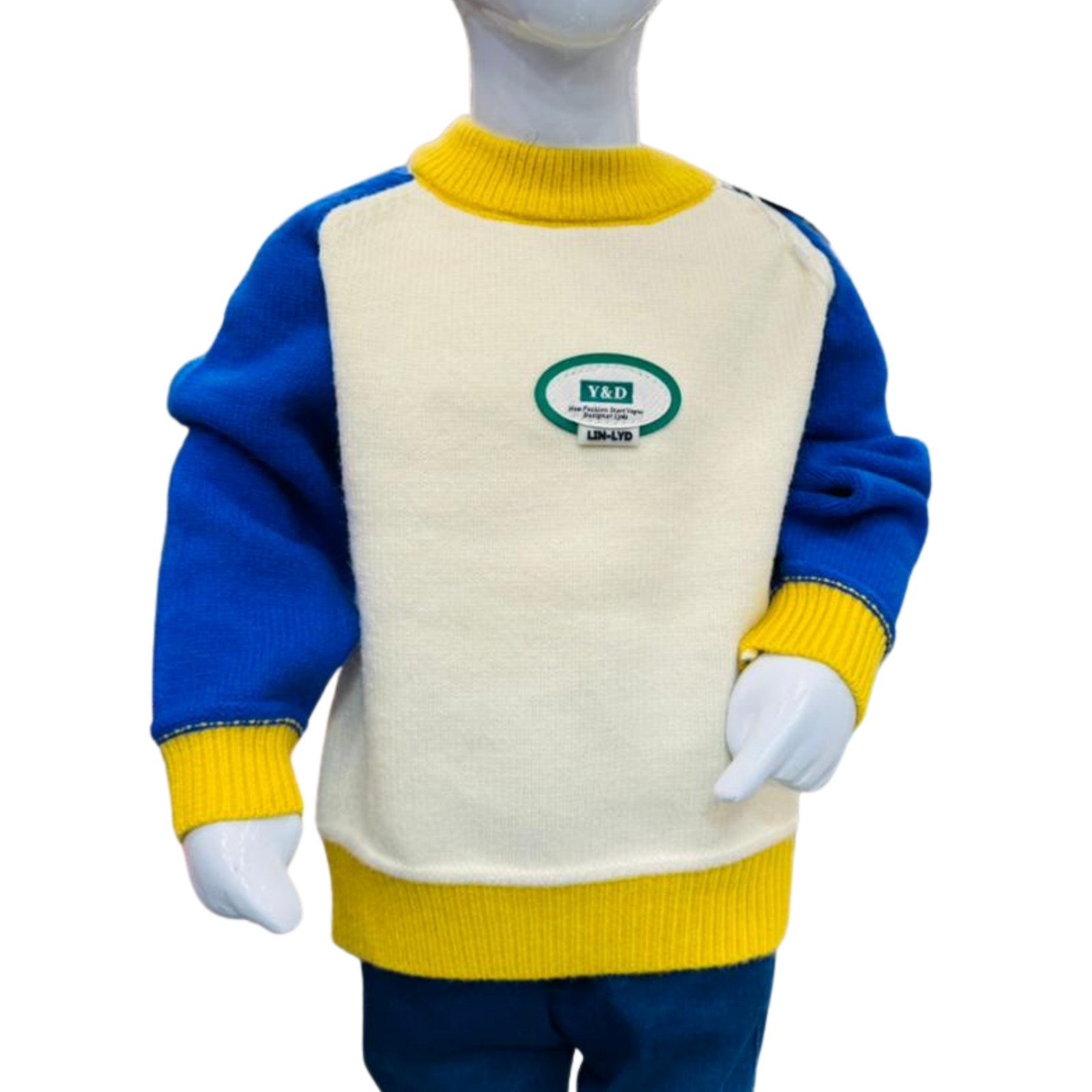 Stylish boys winter sweatshirt with cream front, blue sleeves, and yellow ribbed neckline and cuffs.