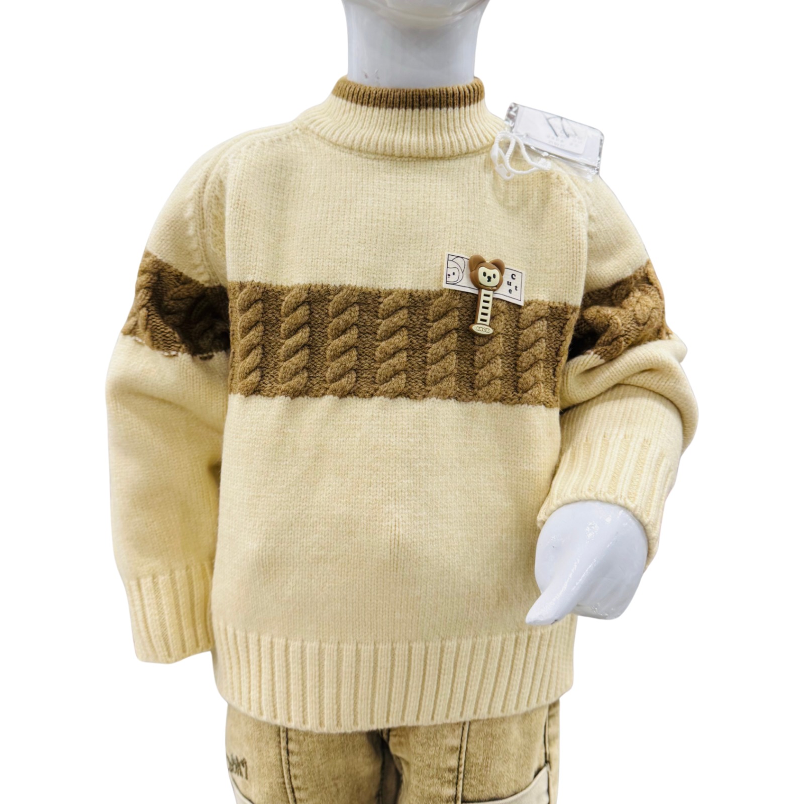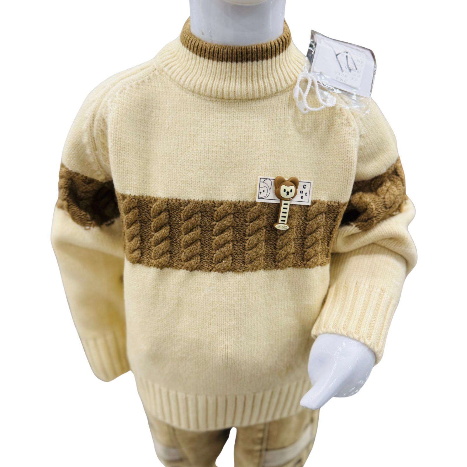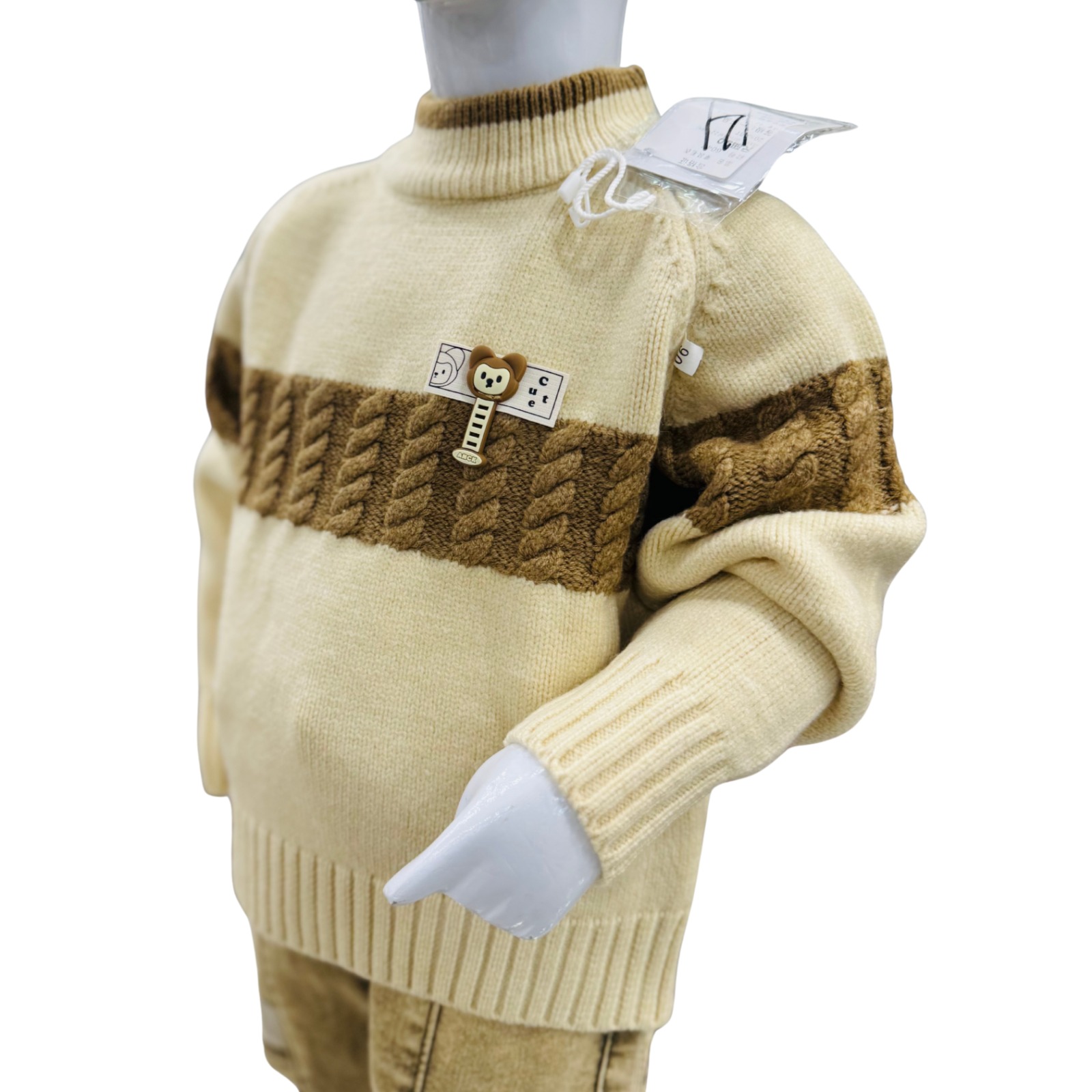 Premium boys winter outfit featuring a soft cream knitted sweater with brown textured stripe detail, paired with stylish printed cotton pants for everyday winter wear.