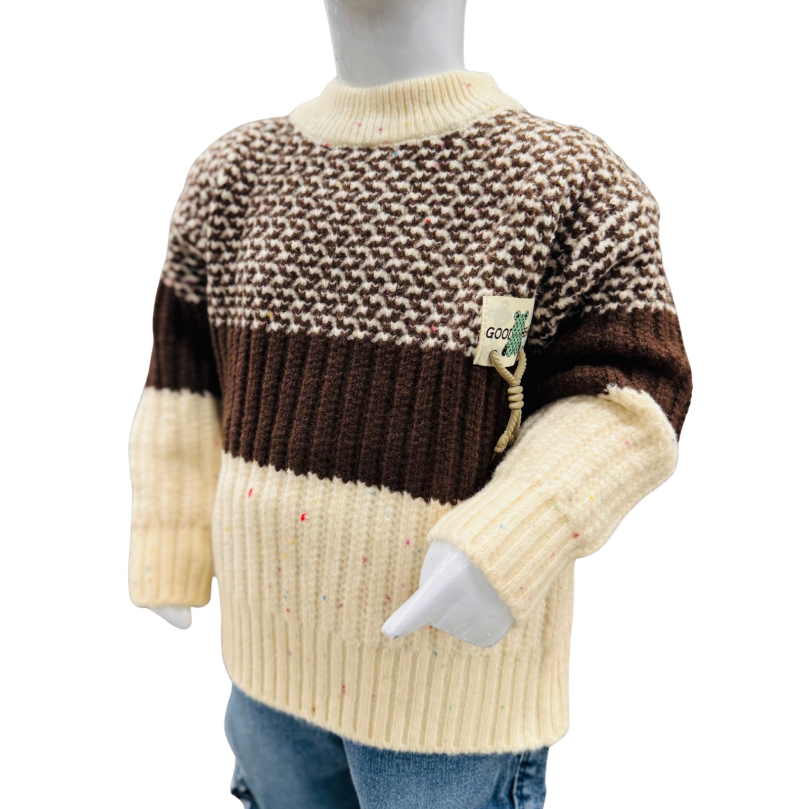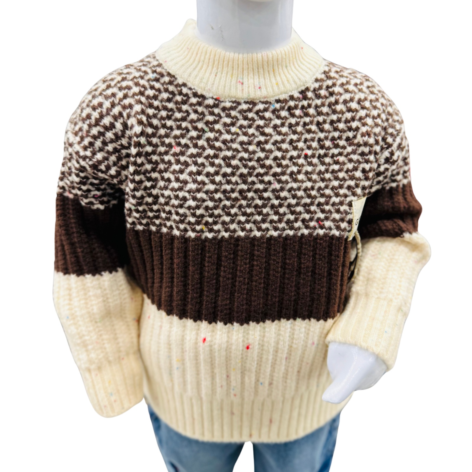 The sweater features a beautiful triple-tone pattern with cream, brown, and textured knit detailing on the upper section. The ribbed cuffs, hem, and neck ensure a snug and comfortable fit.