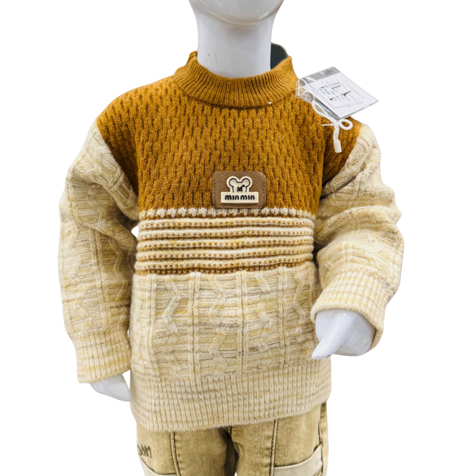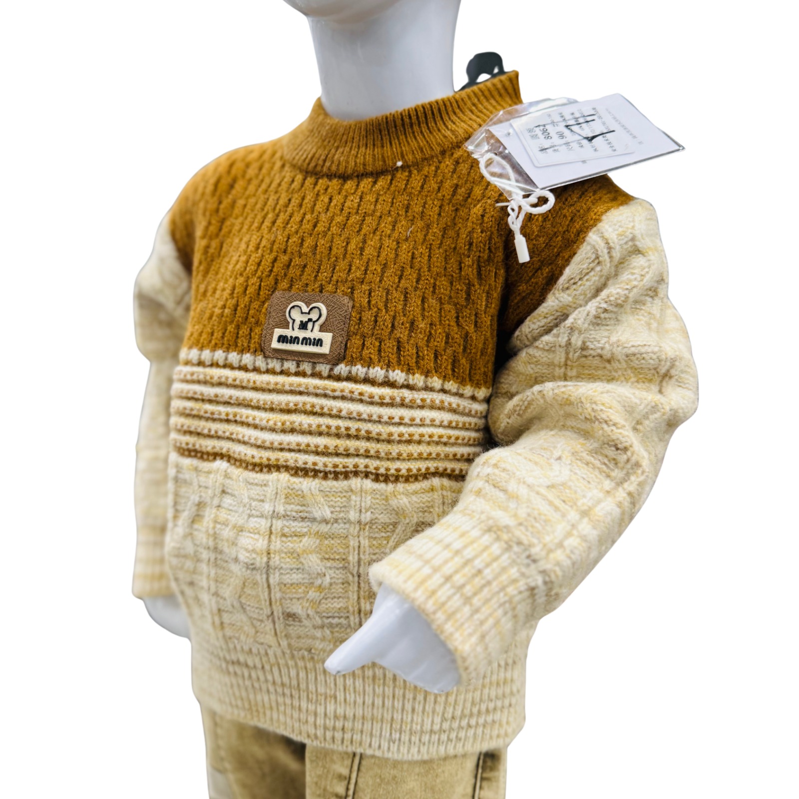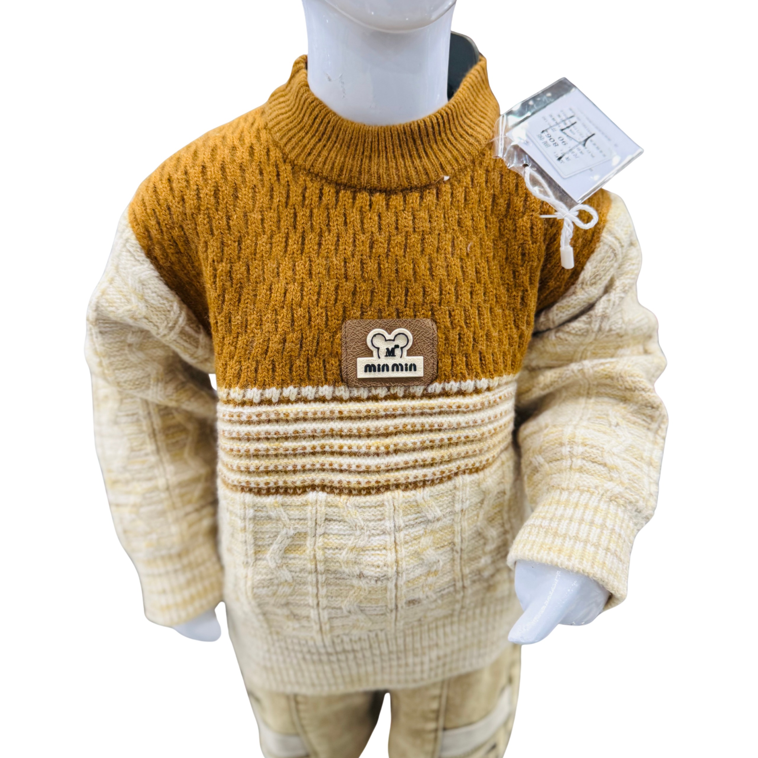 Stylish boys winter outfit featuring a premium knitted sweater in mustard & cream tones, paired with trendy printed cotton pants for a warm and fashionable winter look.