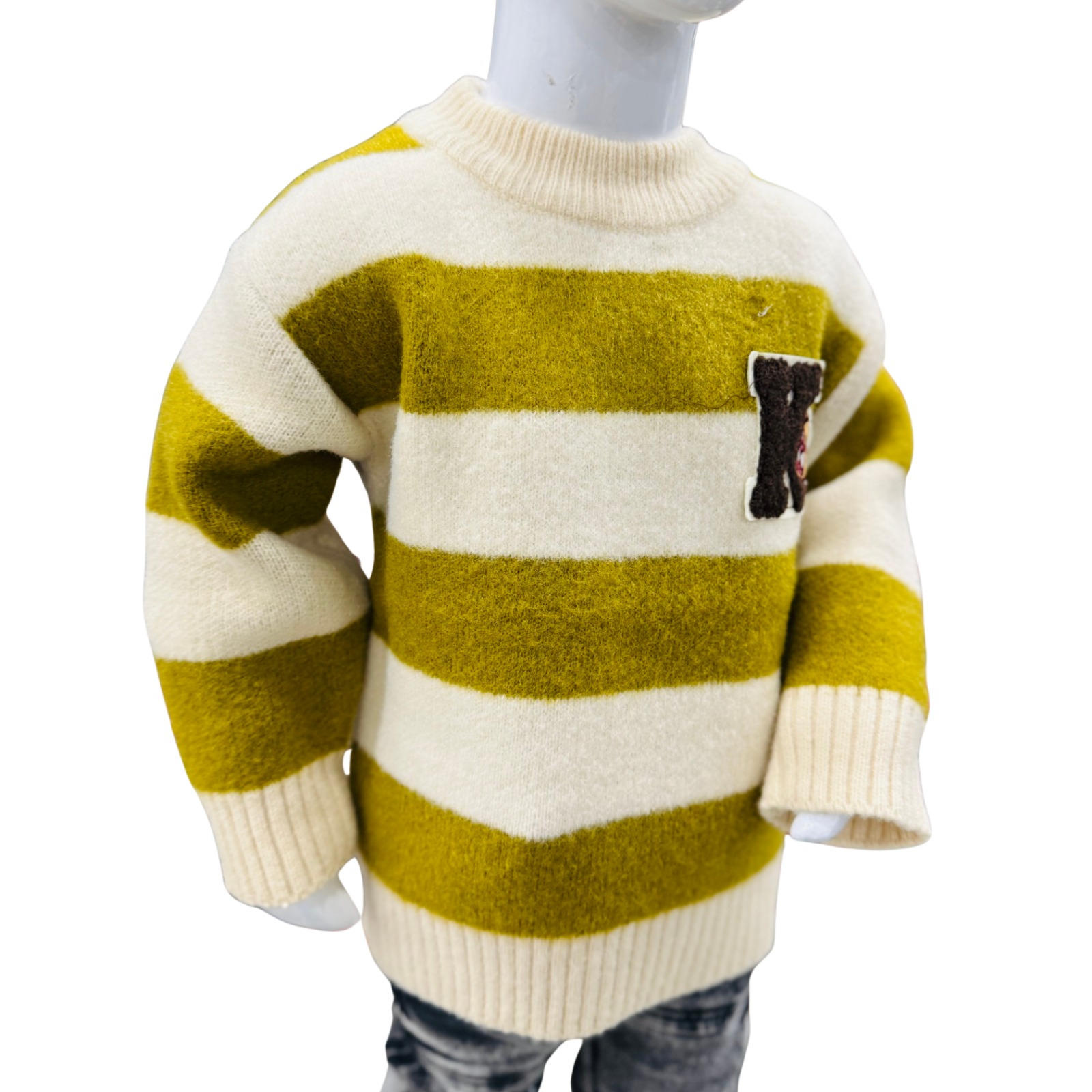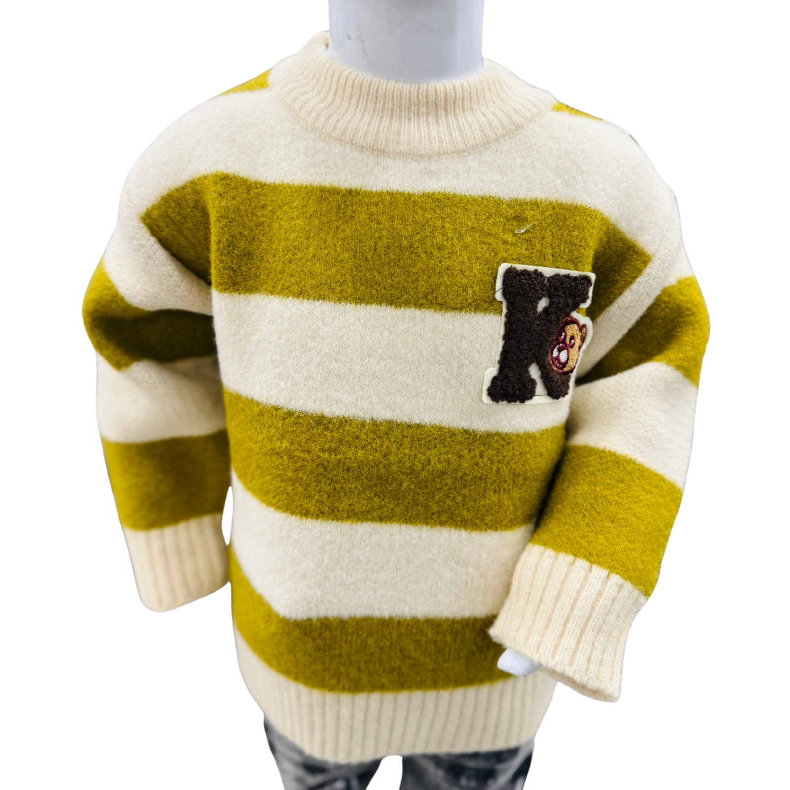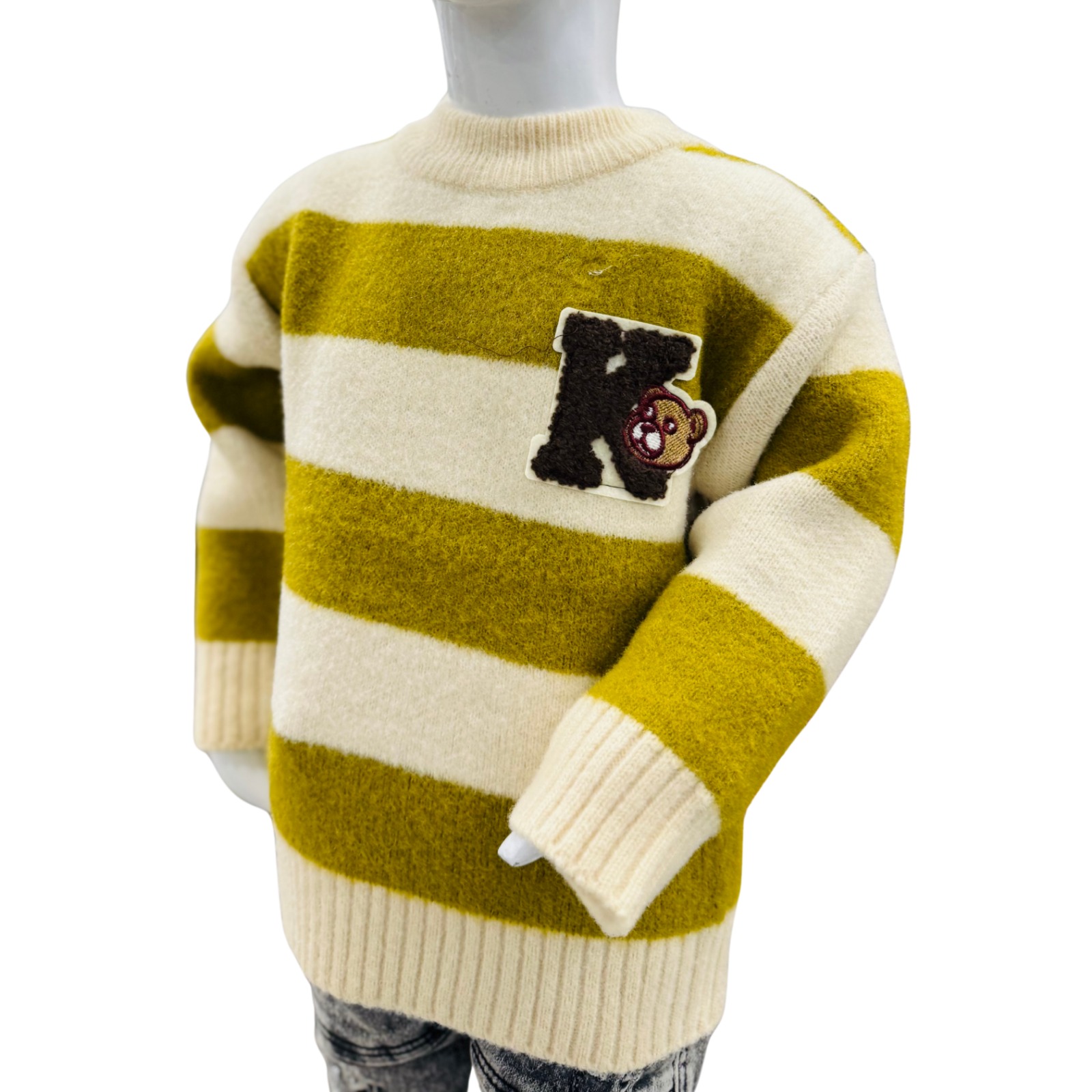 The sweater features bold horizontal stripes in olive and cream tones along with a cute teddy-themed chest patch for an adorable winter look. Made from a premium wool-blend fabric, it ensures warmth, softness, and all-day comfort.