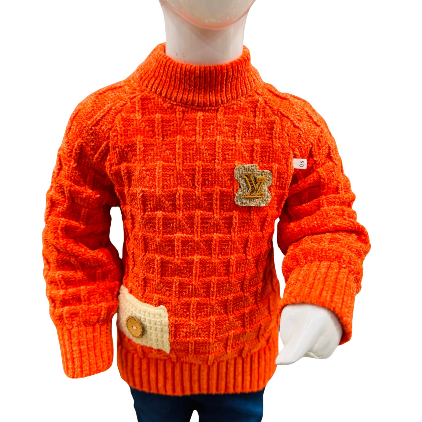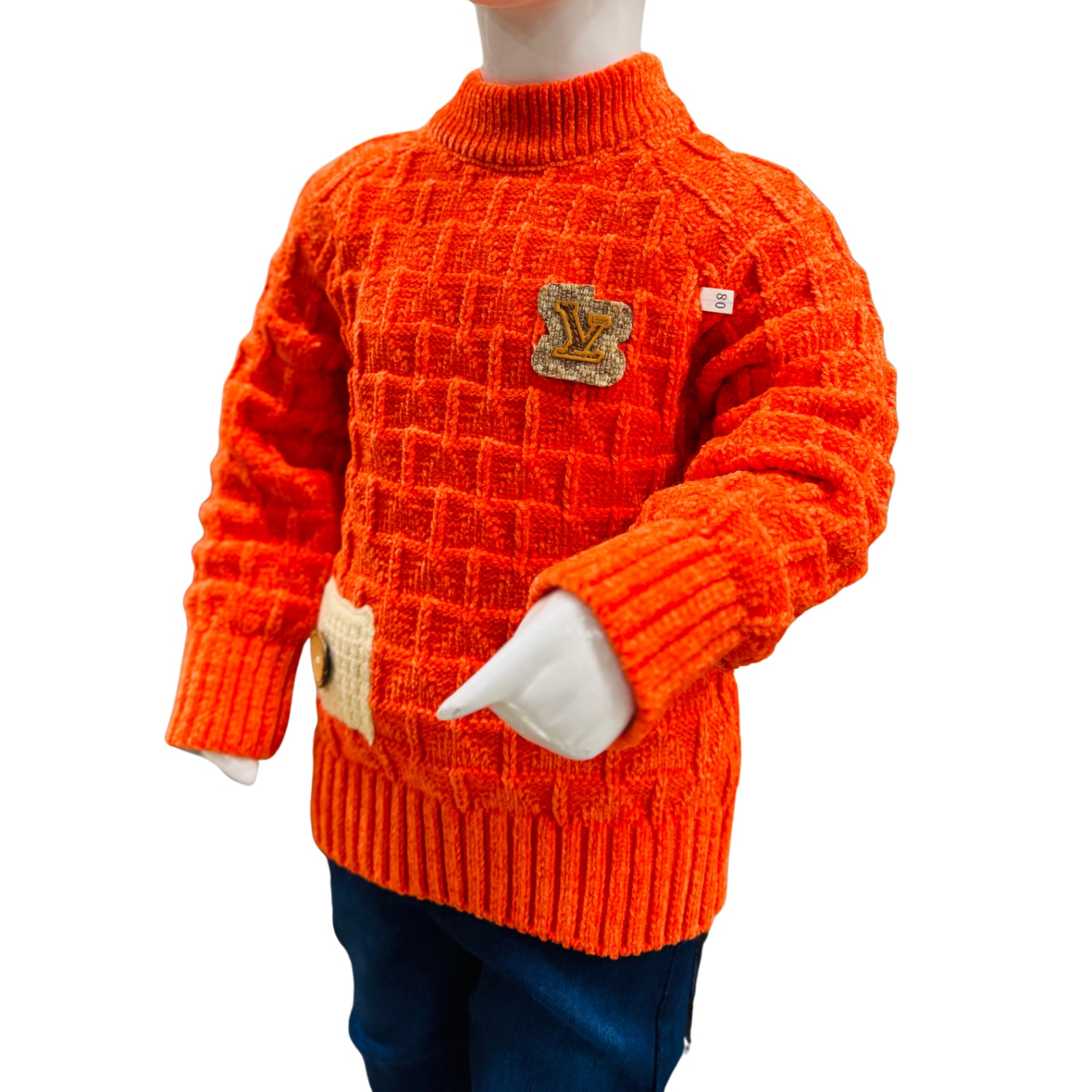 Bright and stylish boys winter outfit featuring a textured orange knit sweater paired with comfortable navy blue pants for a warm and trendy winter look.
