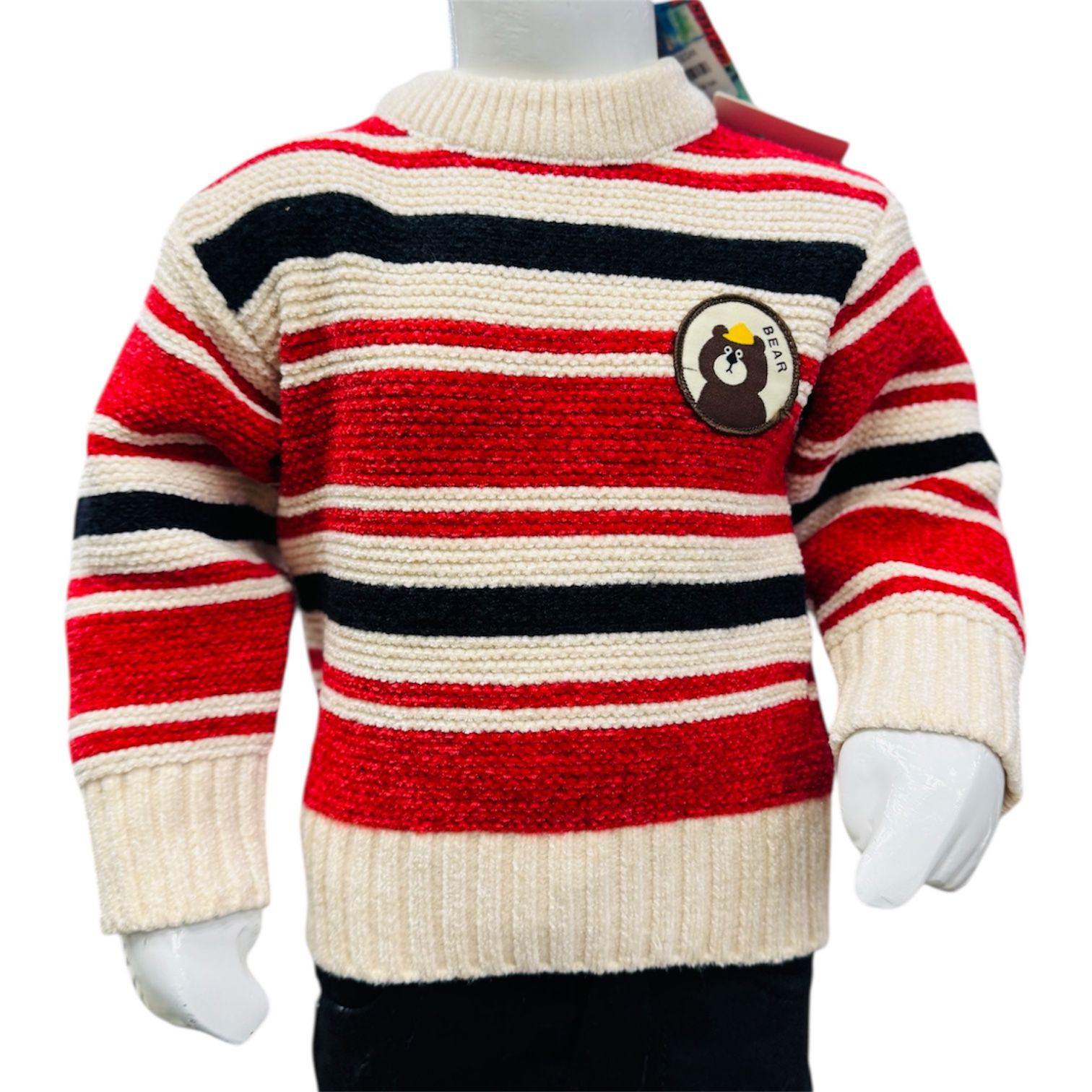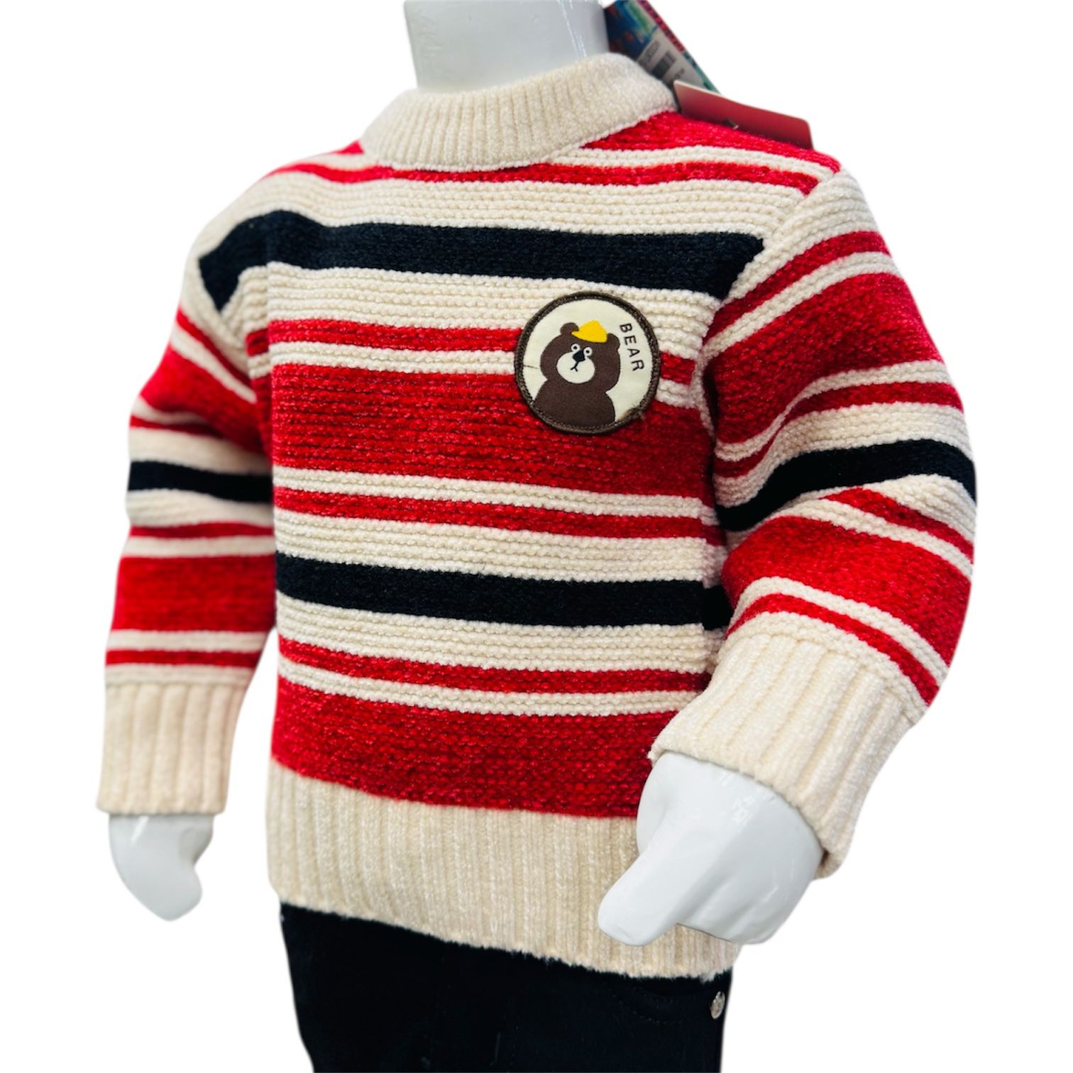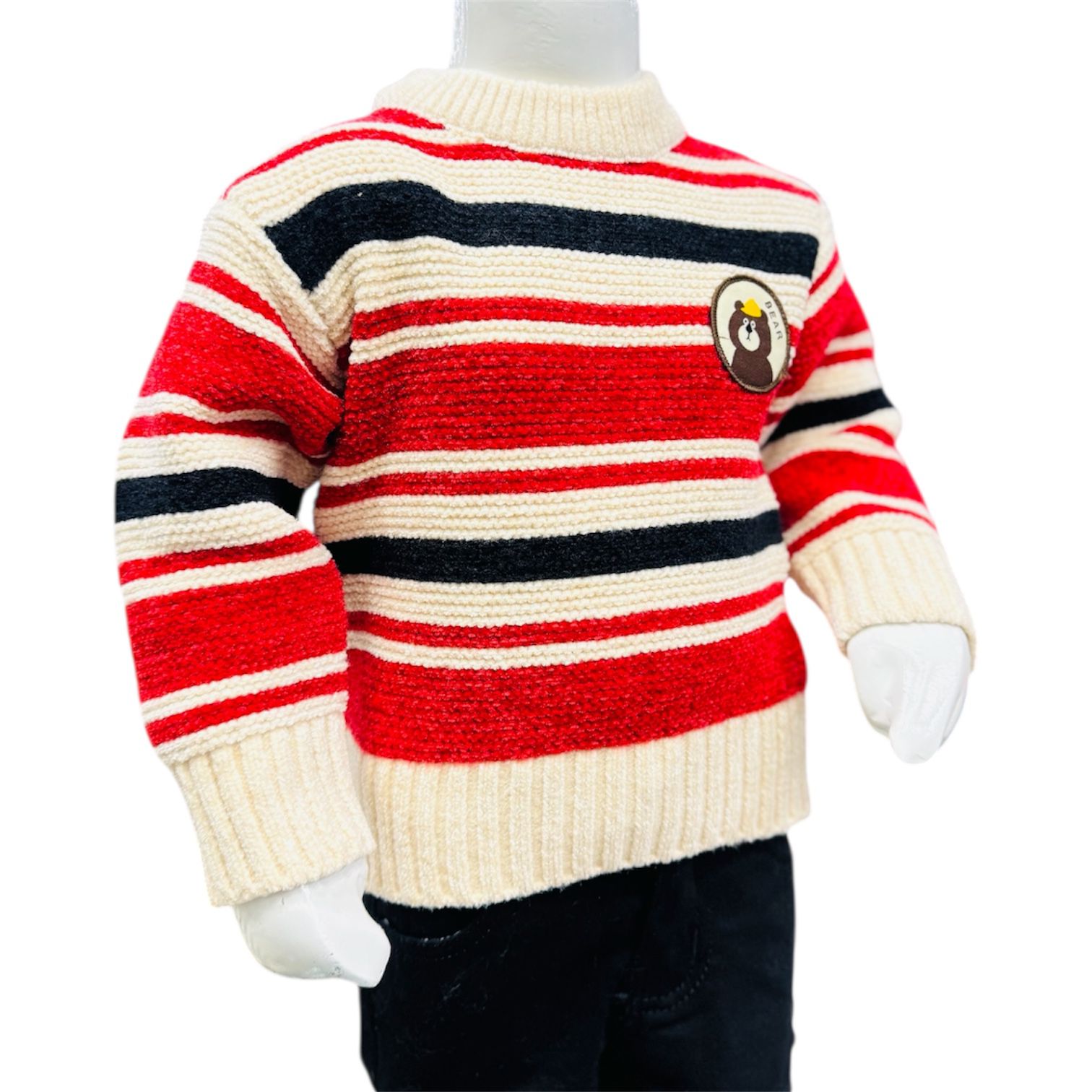 The knit sweater features bold horizontal stripes in red, cream, and black, giving it a modern winter look. A cute cartoon-style badge on the chest adds playful charm, while the ribbed neckline, cuffs, and hem ensure a comfortable and snug fit.