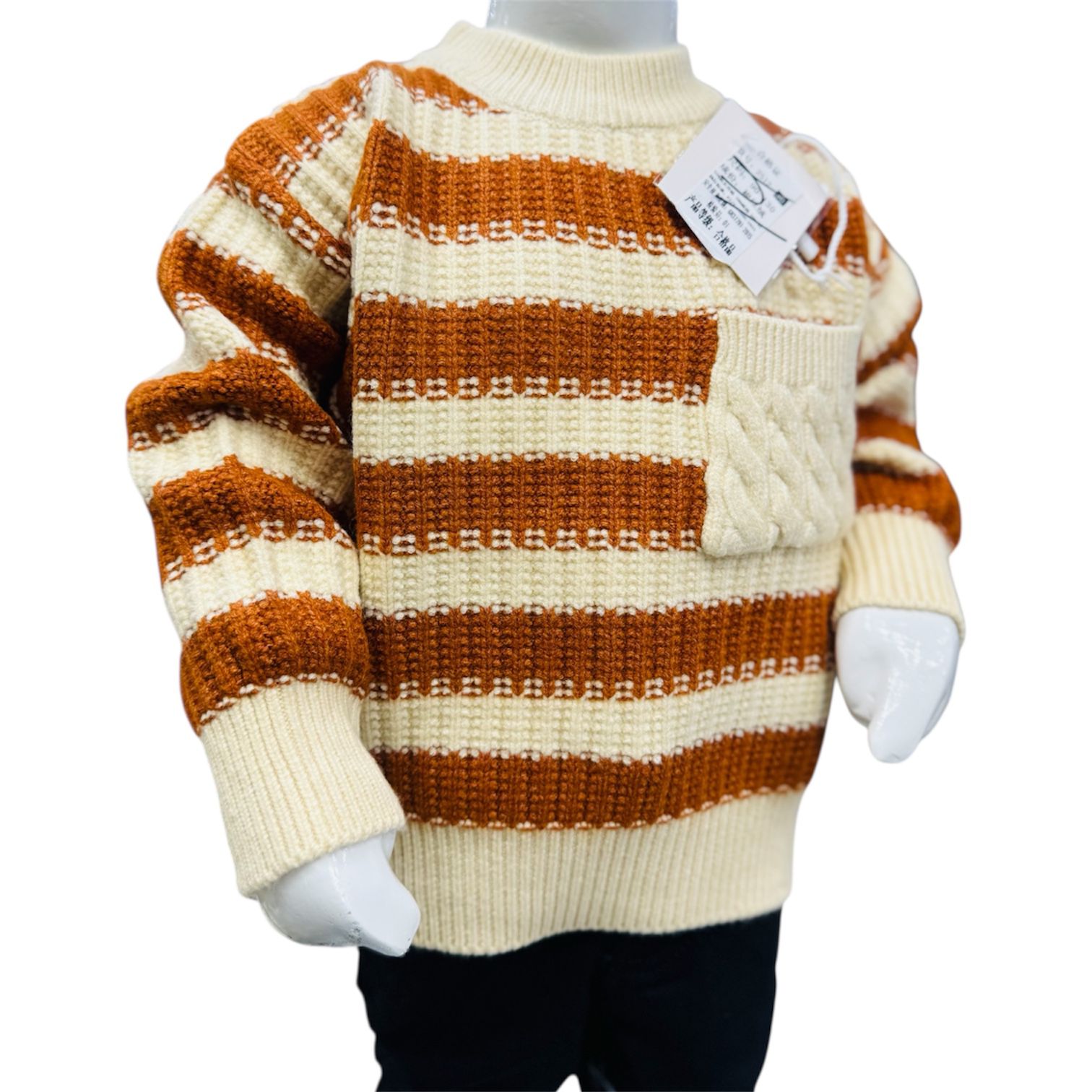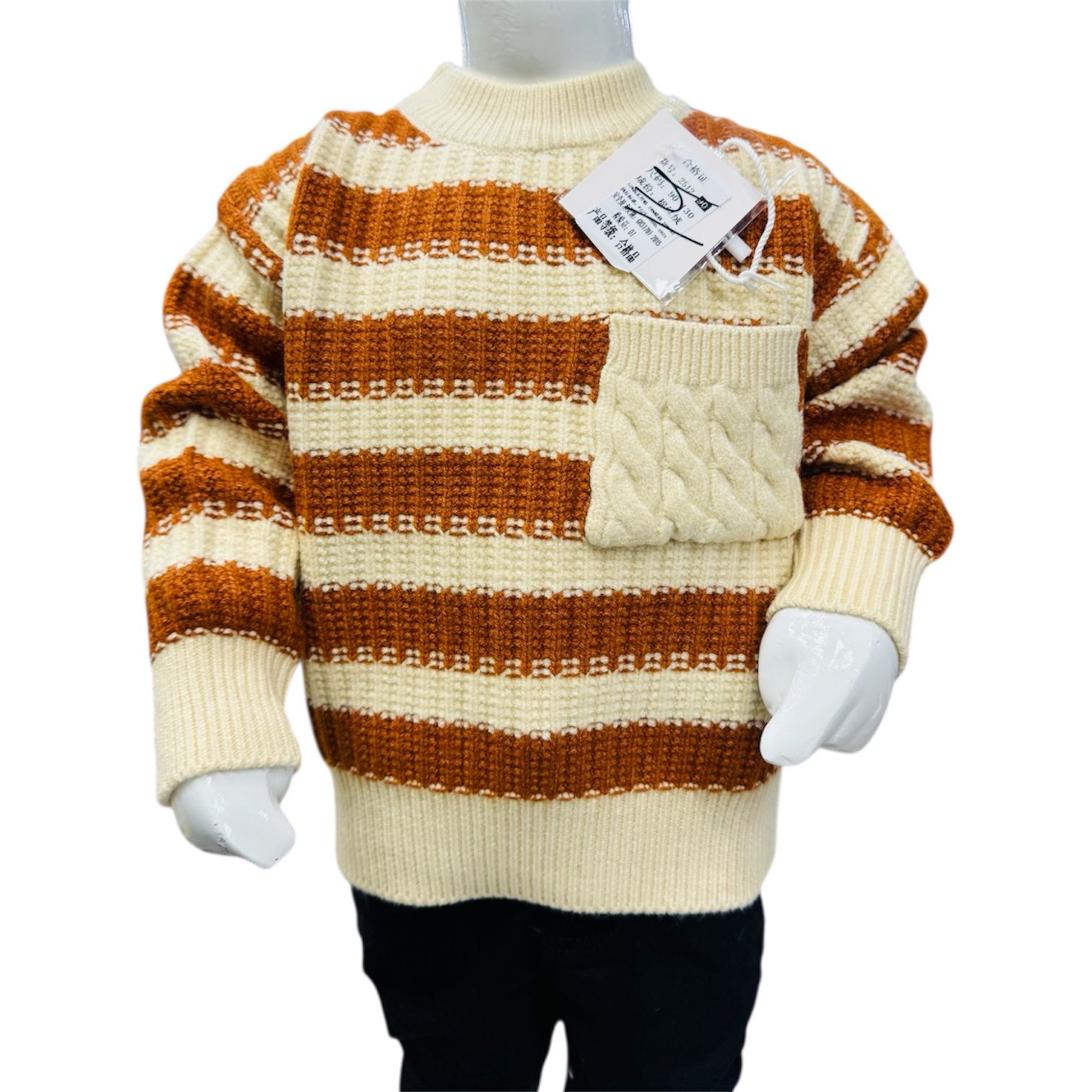 Stylish winter outfit for boys featuring a cream and rust brown striped knit sweater with cable-knit pocket, paired with comfortable black pants.