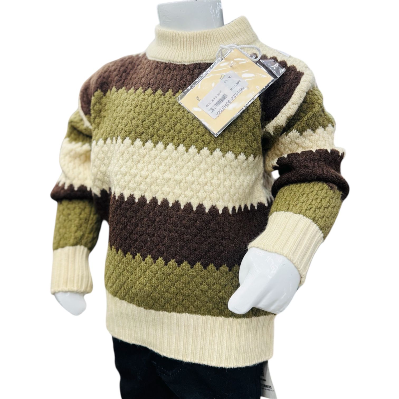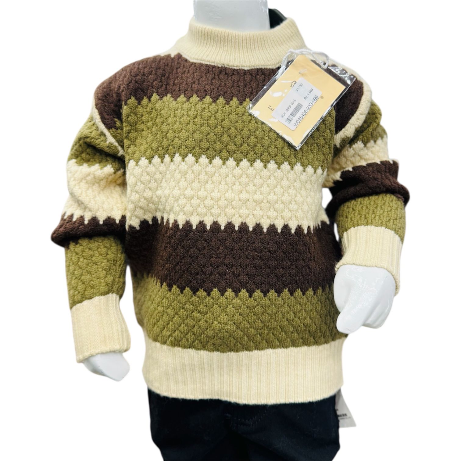 The sweater features a beautiful textured knit pattern with horizontal color blocks in olive green, brown, and cream, giving it a premium and elegant look. The high neck design offers extra warmth, while ribbed cuffs and hem ensure a snug and secure fit. The soft knitted fabric feels gentle on the skin and keeps your child cozy all day long.