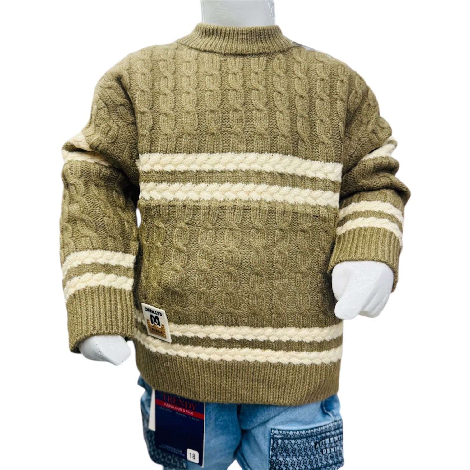 Keep your child warm and fashionable throughout the winter season with our Boys Winter Cable Knit Sweater & Denim Jeans Set. This premium winter outfit features a beautifully crafted cable knit sweater in an elegant olive brown shade, designed with subtle contrast stripe detailing that adds a classic yet trendy look.