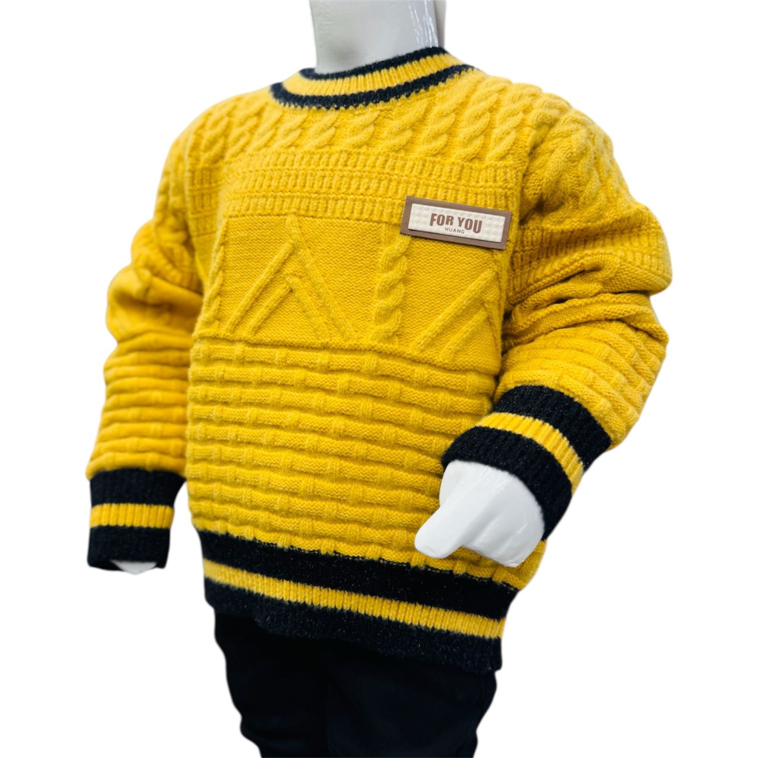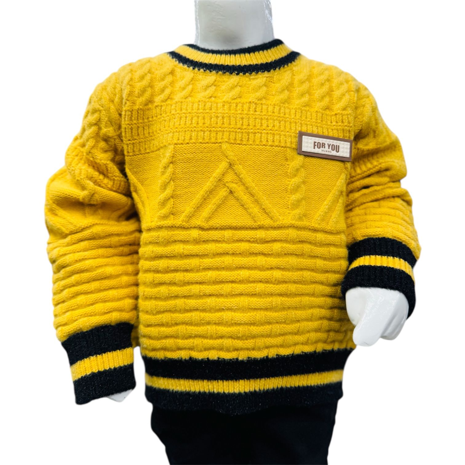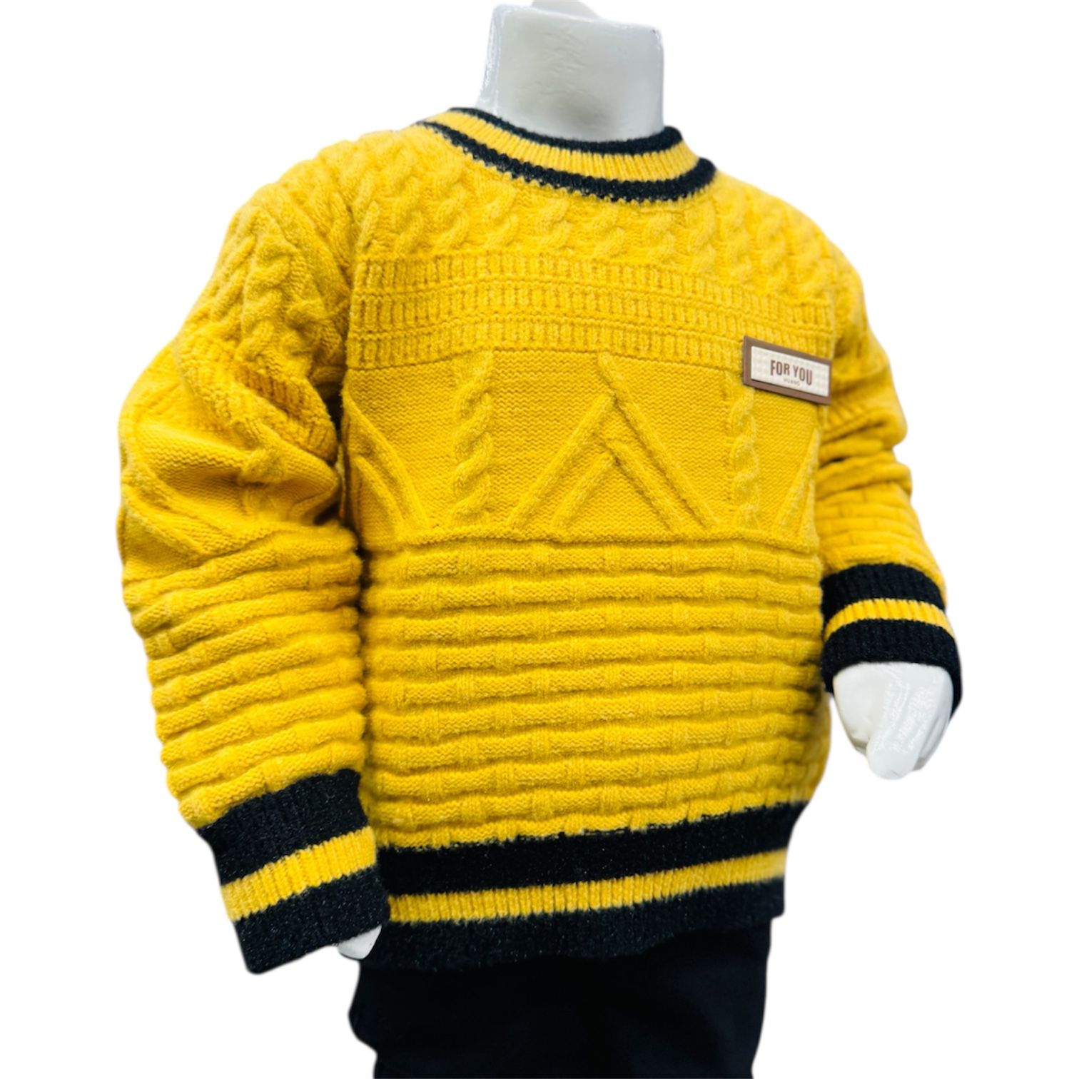 The mustard yellow knitted sweater features an eye-catching textured knit pattern with a modern geometric design on the front. Ribbed neckline, cuffs, and hem with black contrast stripes provide a snug fit and a trendy finish. A small “For You” label on the chest adds a stylish detail.