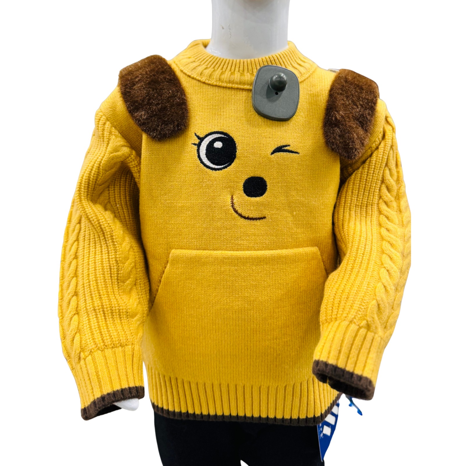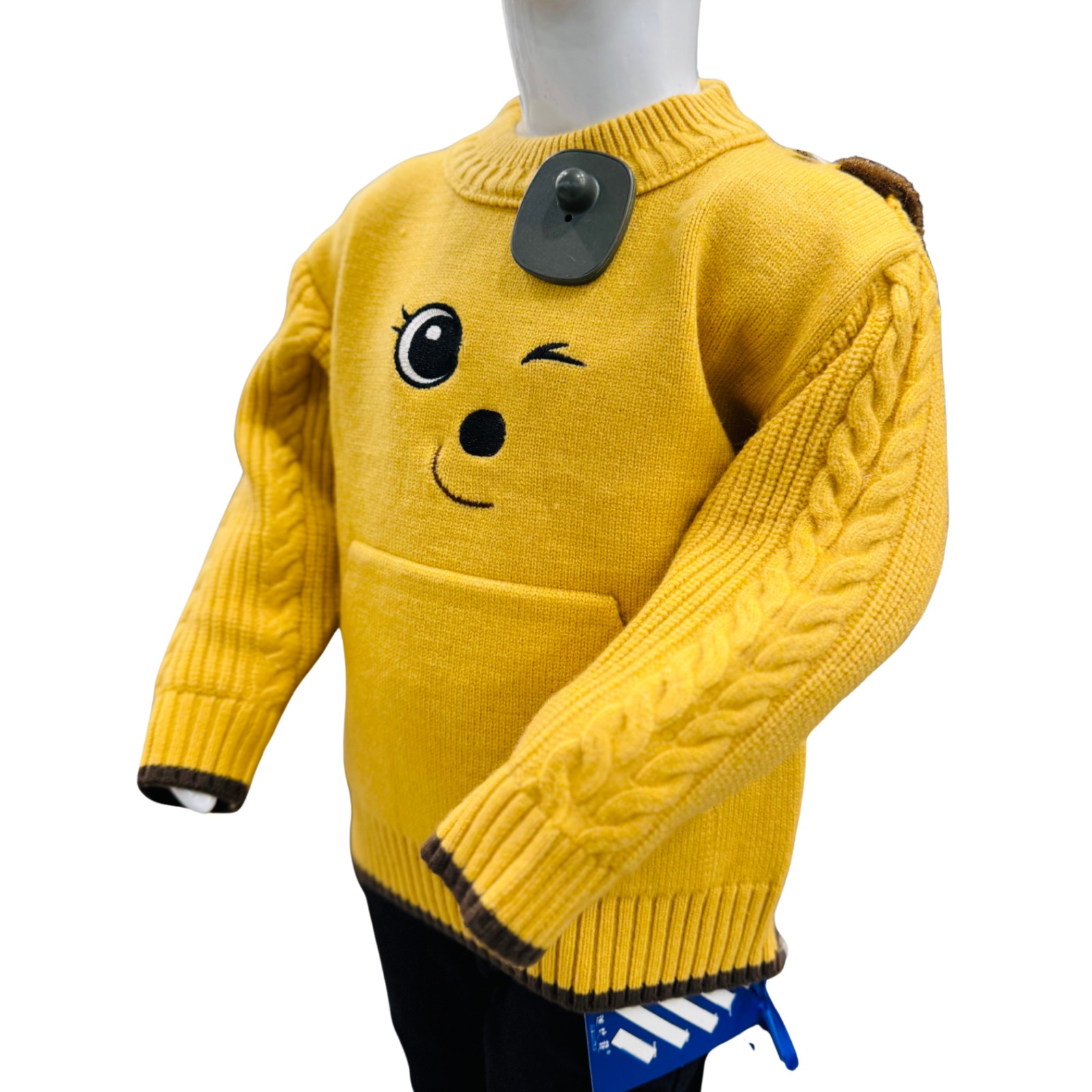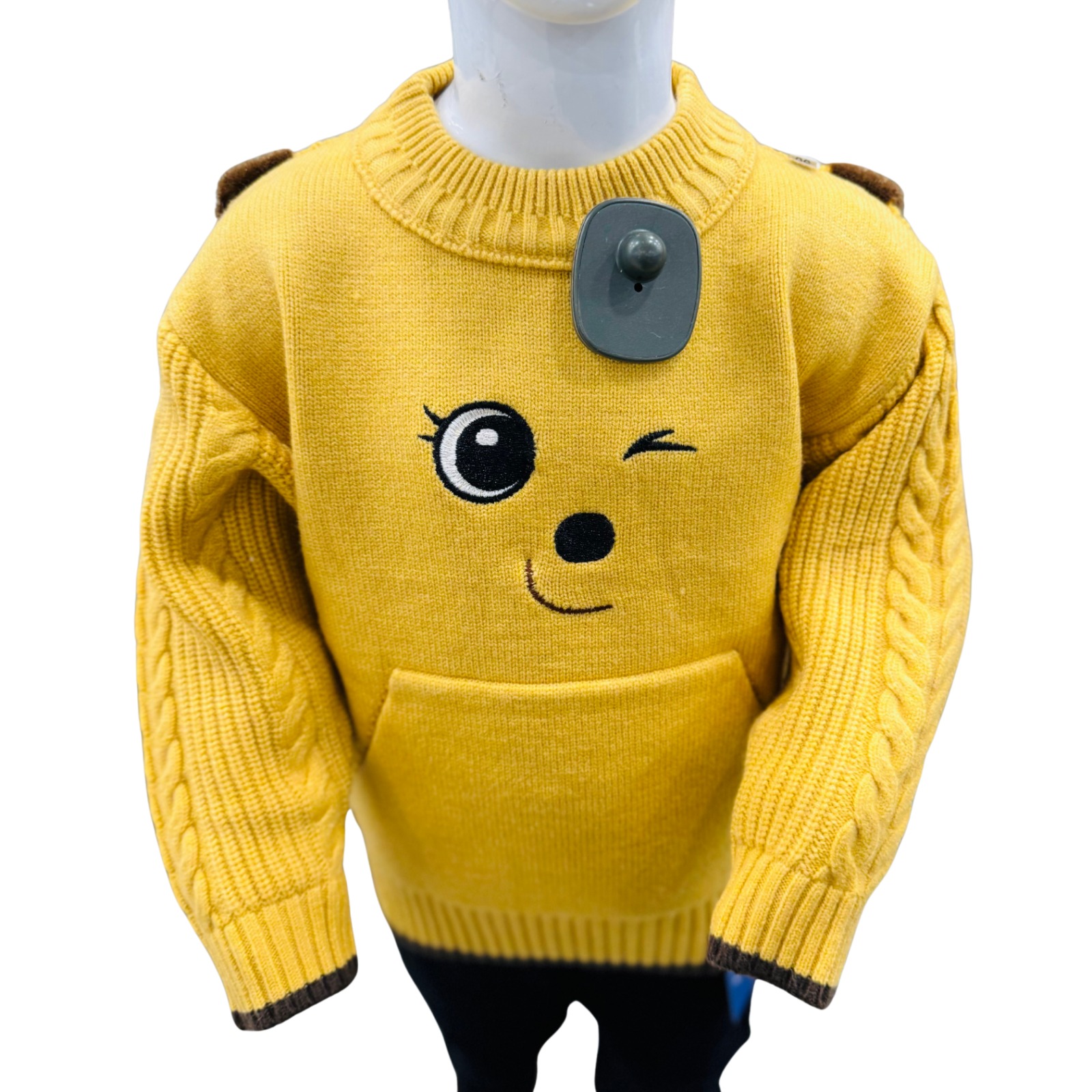 This kids winter sweater comes in a cheerful yellow color with a cute smiley face cartoon print that adds fun to your child’s winter look. Crafted from soft knit fabric, it provides warmth and comfort throughout the day. The full sleeves with ribbed cuffs and a relaxed fit make it perfect for casual wear, school, or outdoor winter activities.