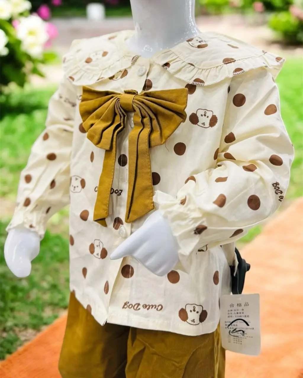 Adorable puppy print cotton shirt with brown trousers — soft, comfy, and perfect for your little girl’s everyday style!