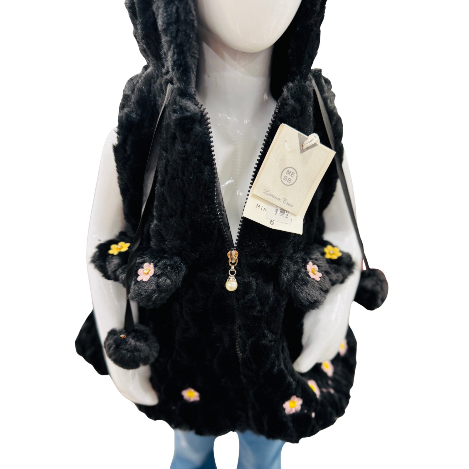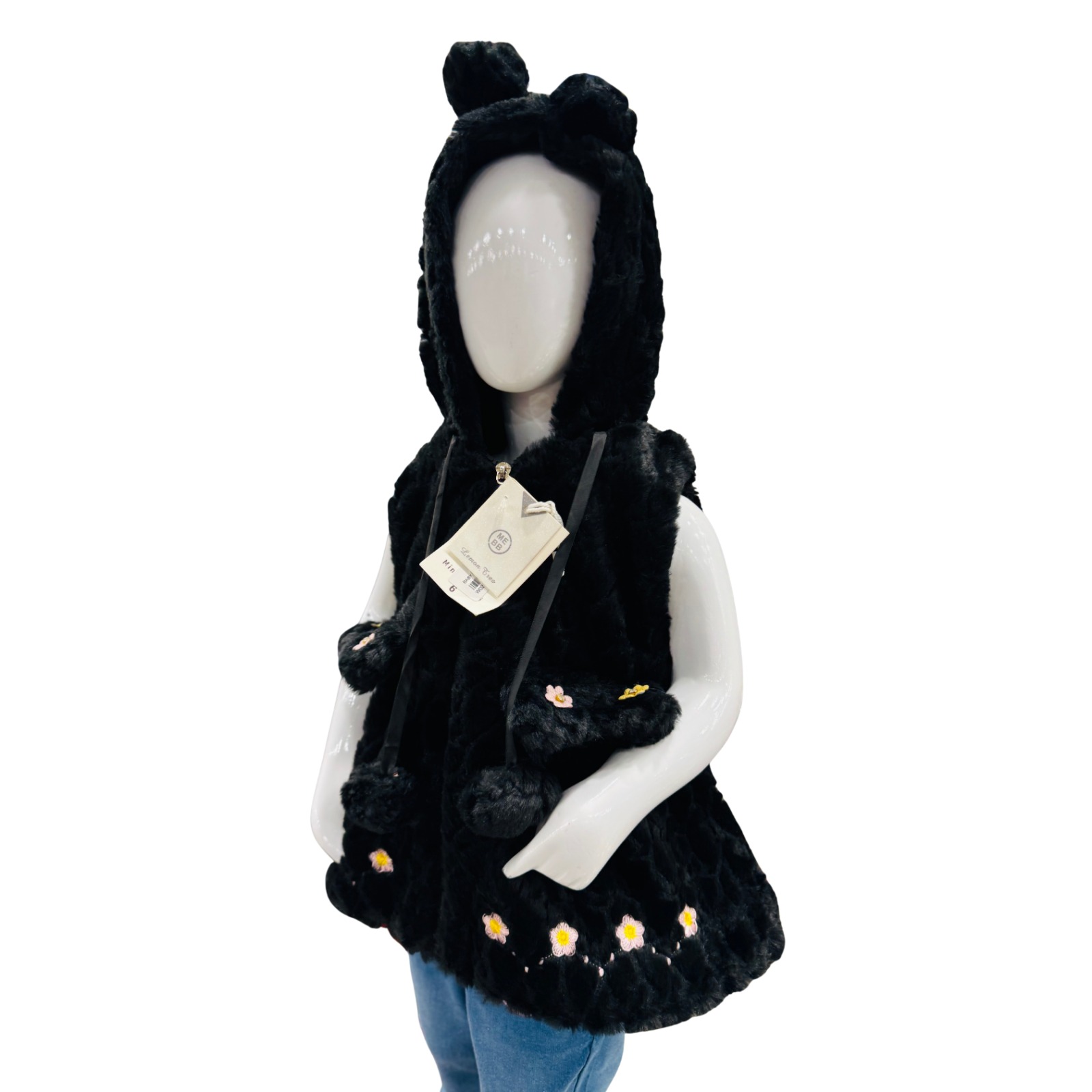 A cozy and stylish black furry hooded vest for girls featuring cute bear ears and delicate floral detailing, perfect for winter layering.