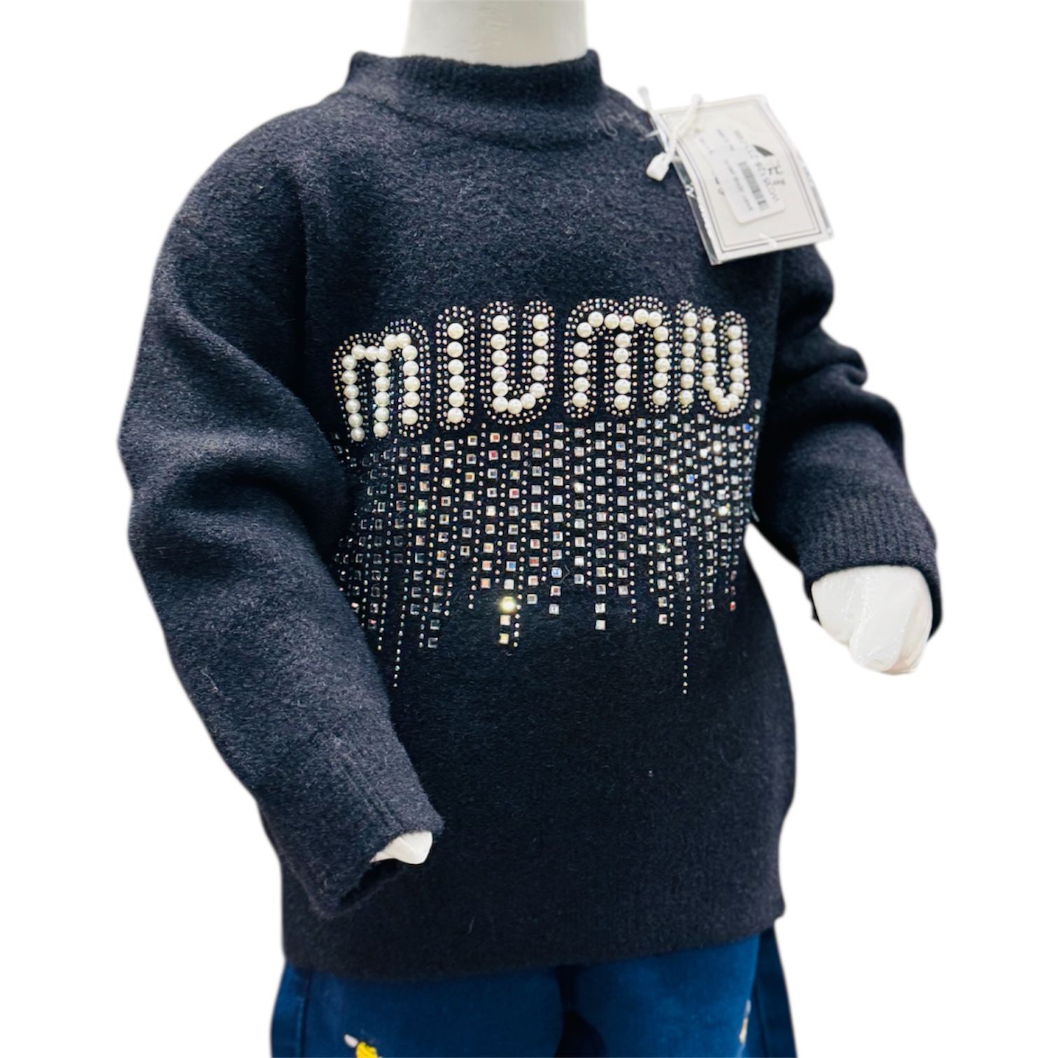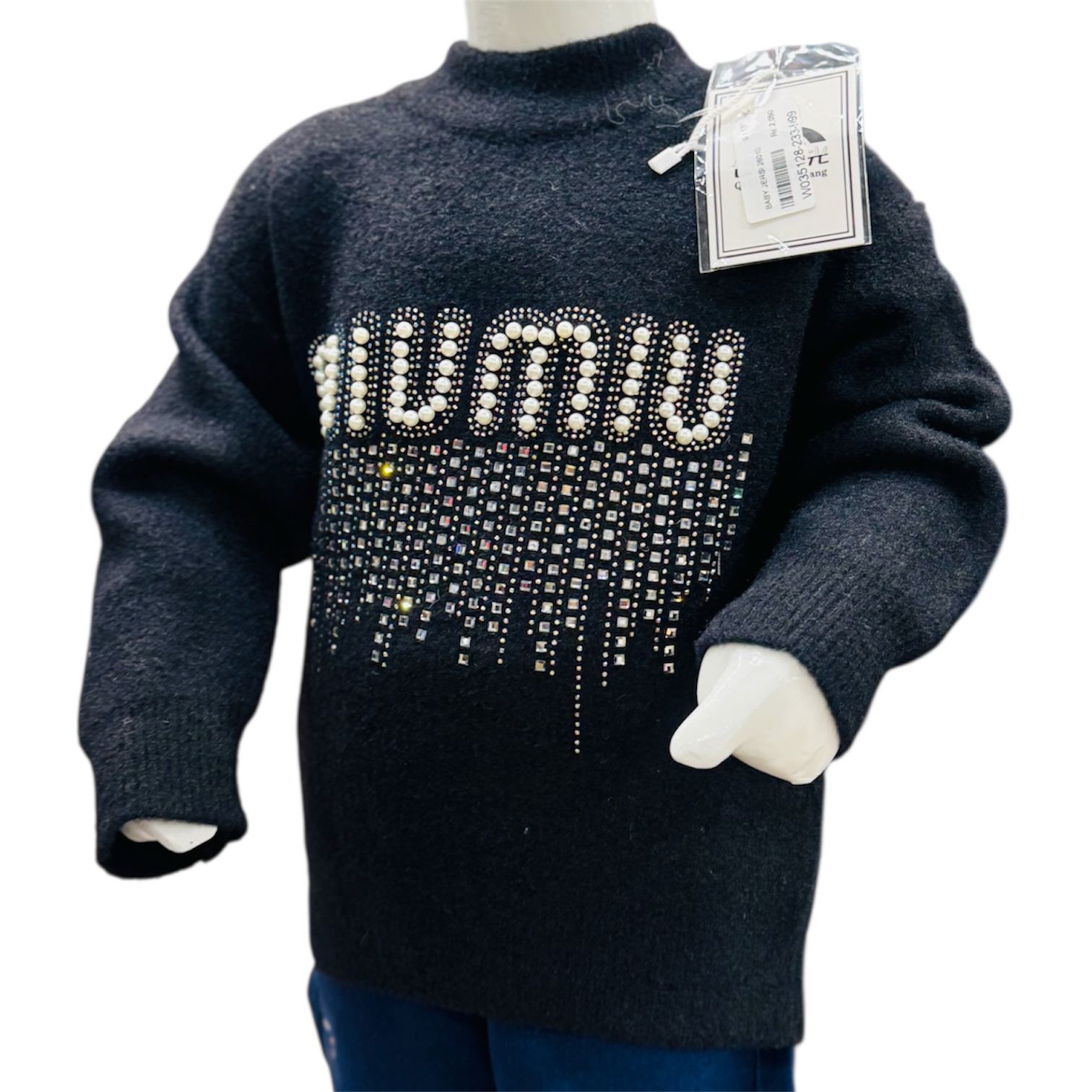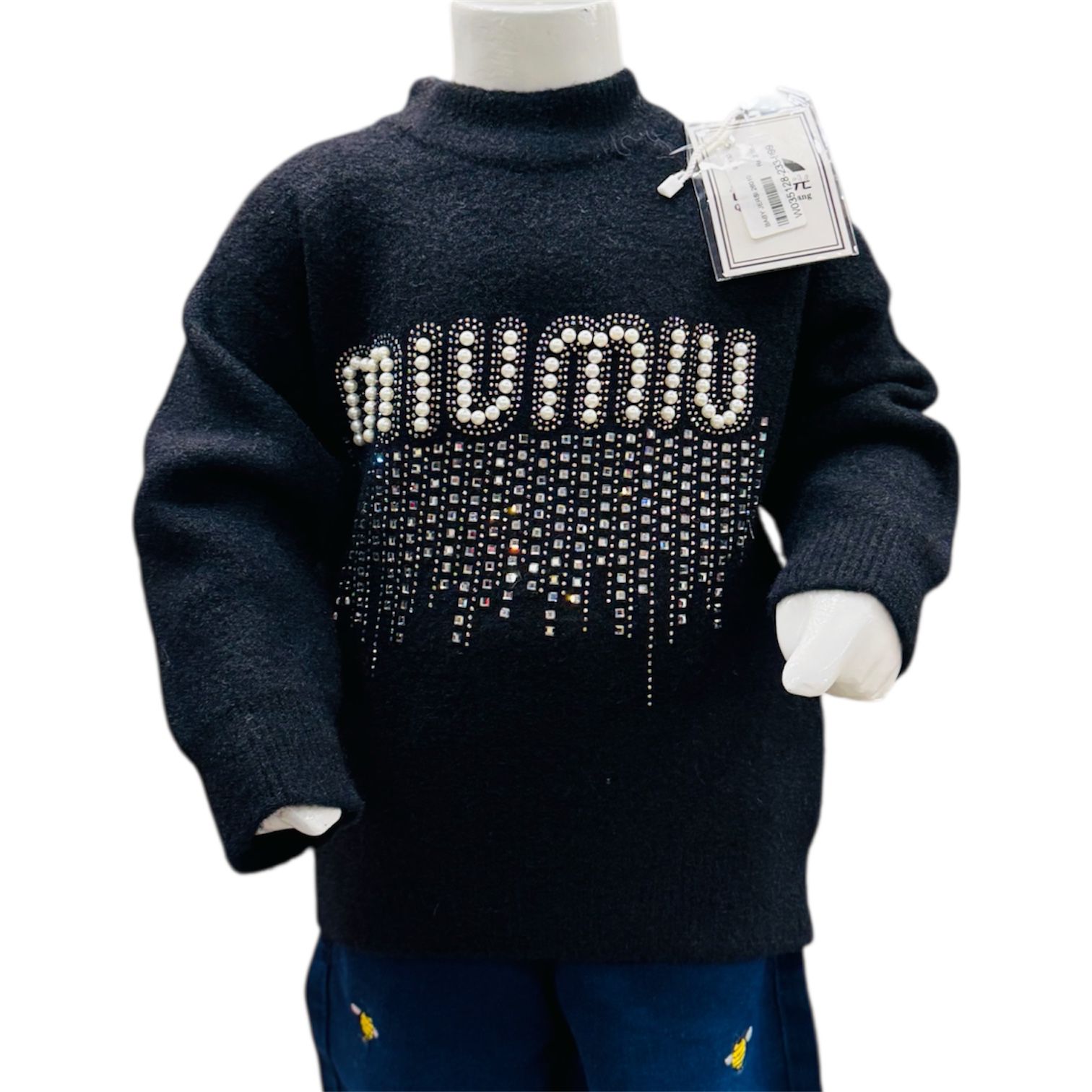 The black knit sweater features an eye-catching embellished text design on the front, decorated with shiny studs that create a trendy and elegant look. Its soft knit fabric and ribbed neckline ensure warmth and comfort during cold weather, making it perfect for daily wear or special outings.