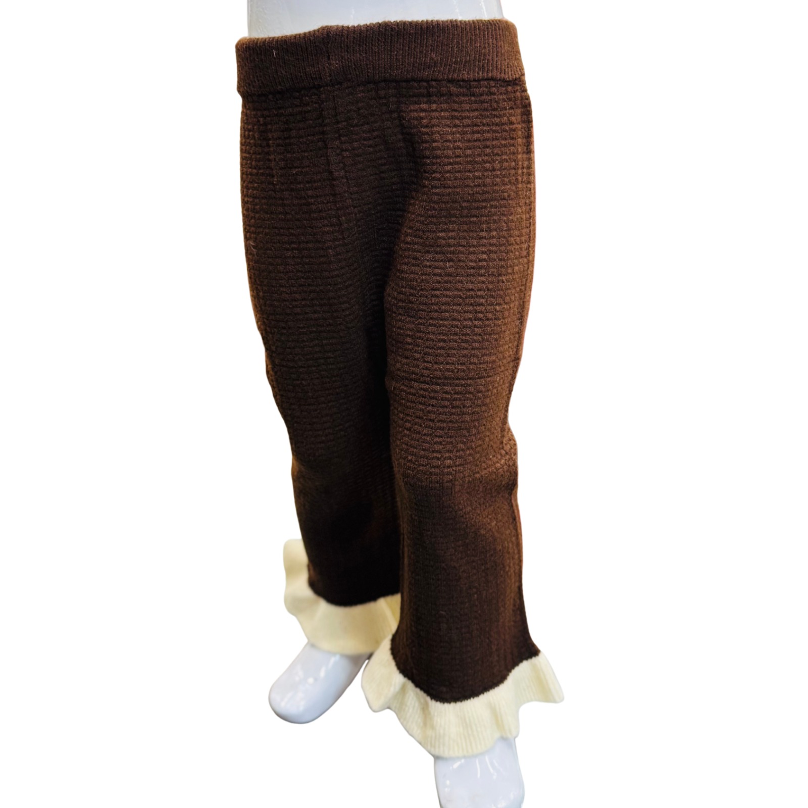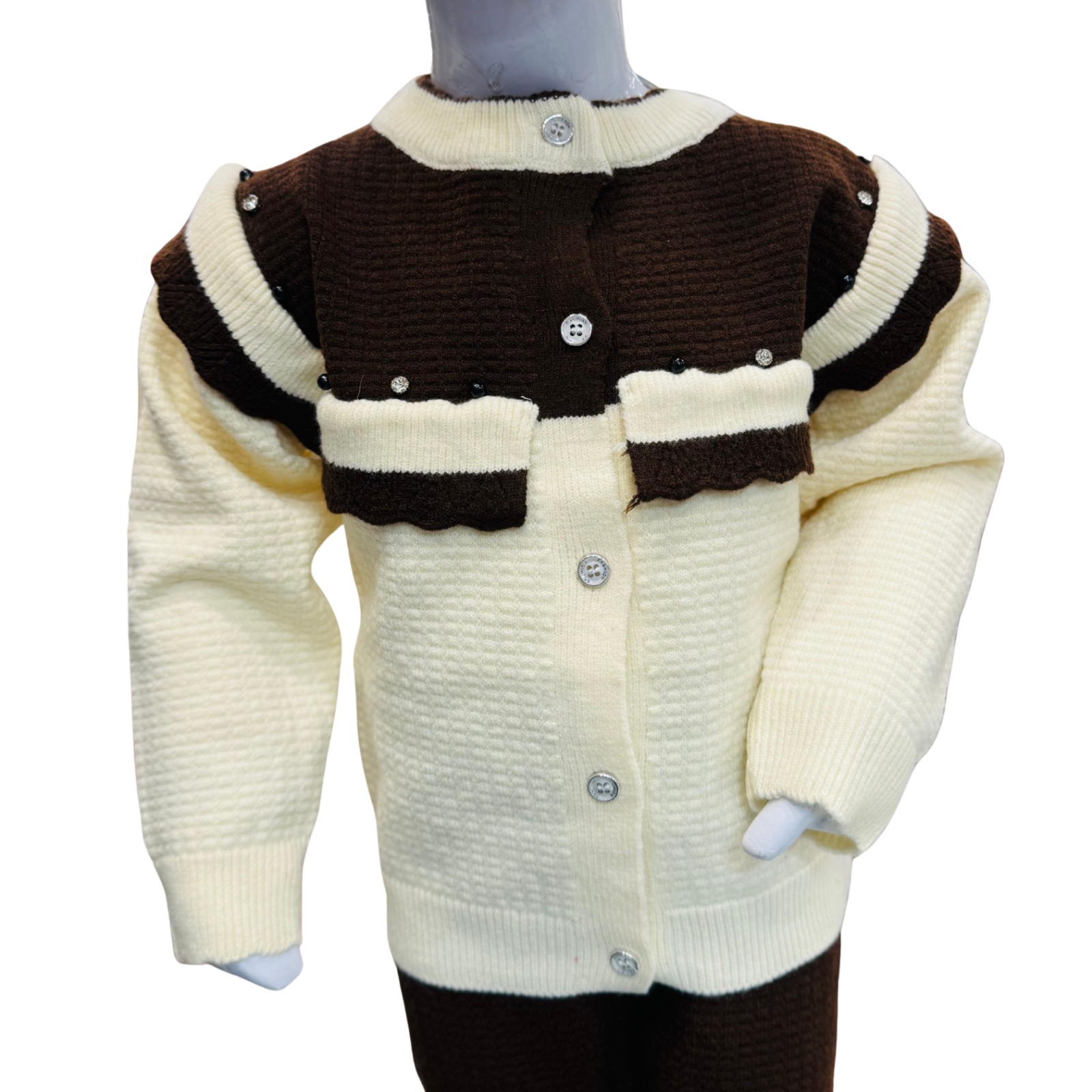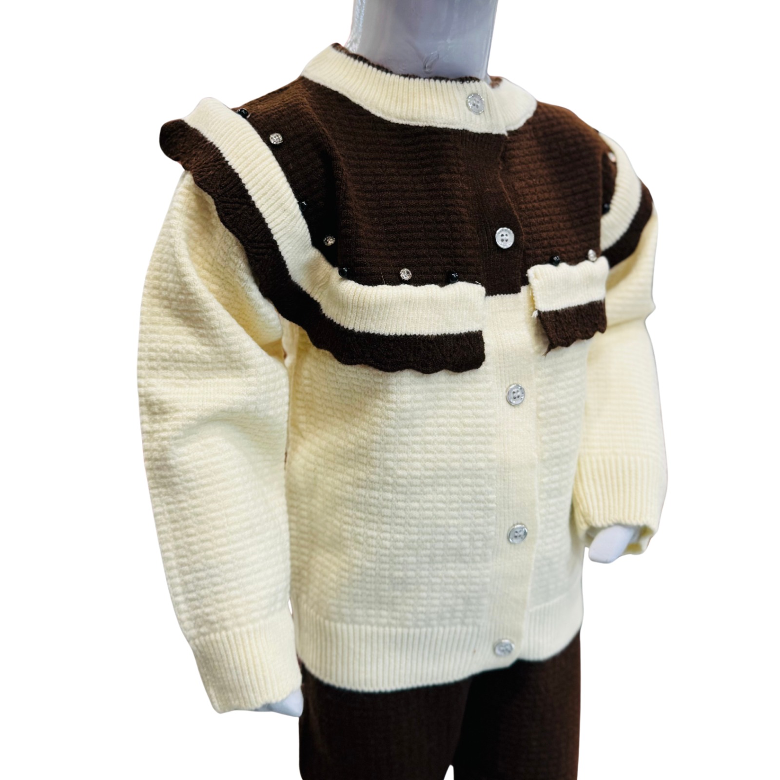 Girls Cream & Brown Knitted Winter Cardigan Set with Ruffle Pants