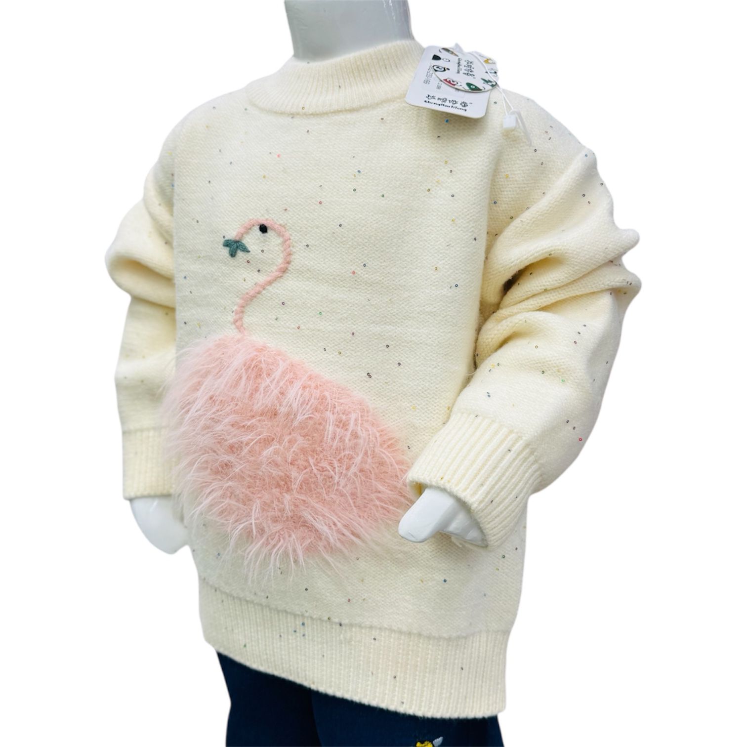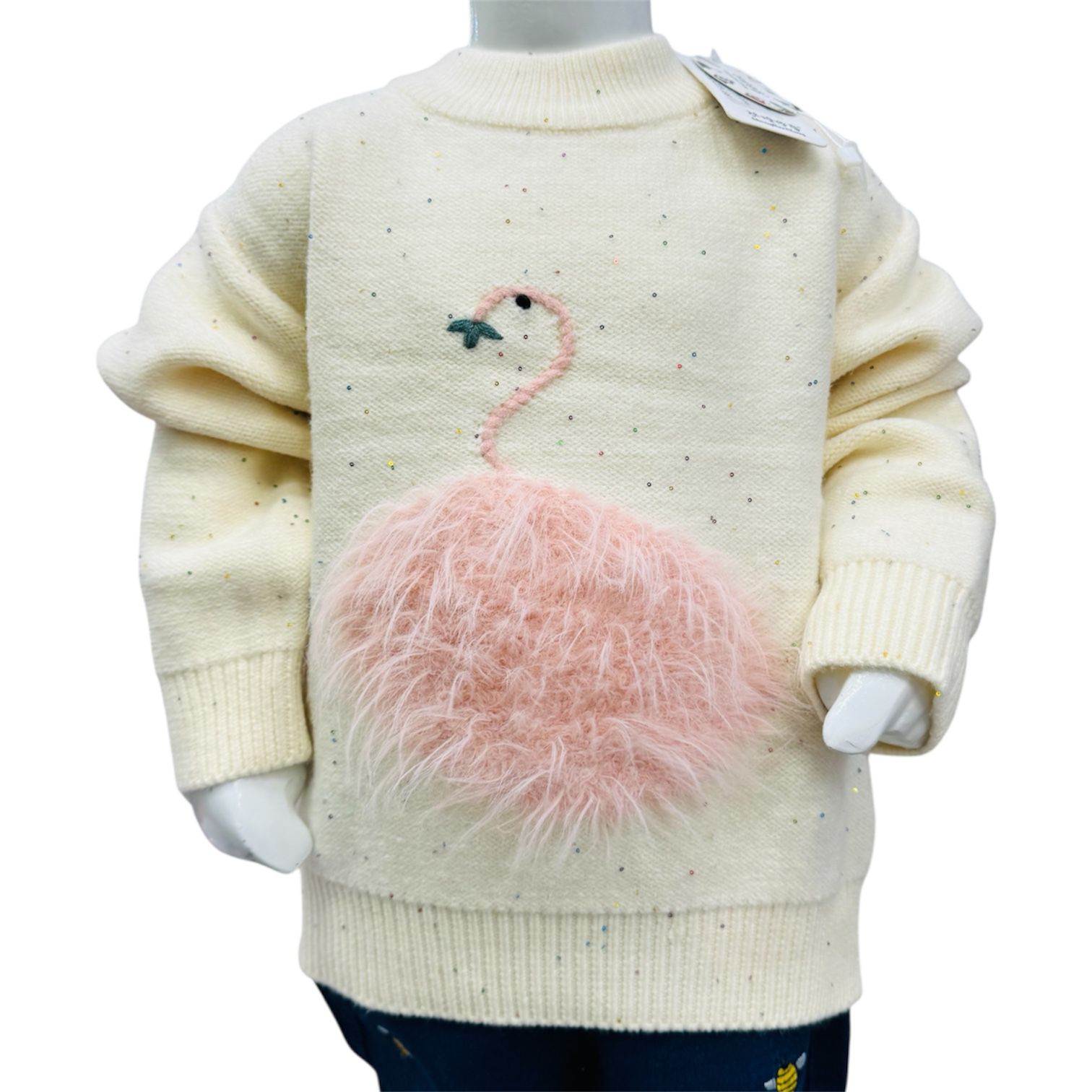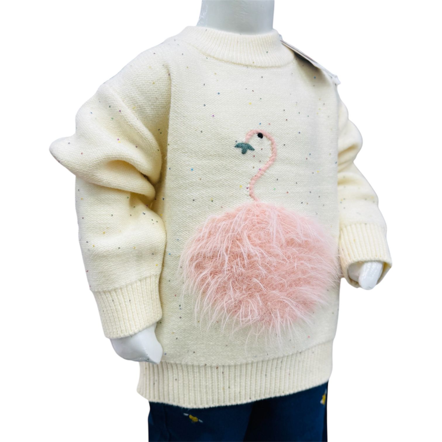 The cream-colored knitted sweater features a charming flamingo design on the front, highlighted with a soft, furry pink texture that gives a playful and premium look. The sweater is finished with ribbed cuffs, hem, and neckline for a snug and cozy fit.