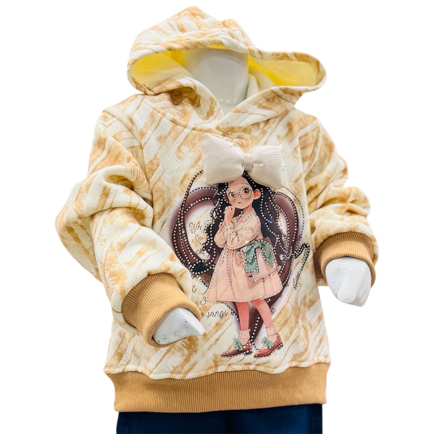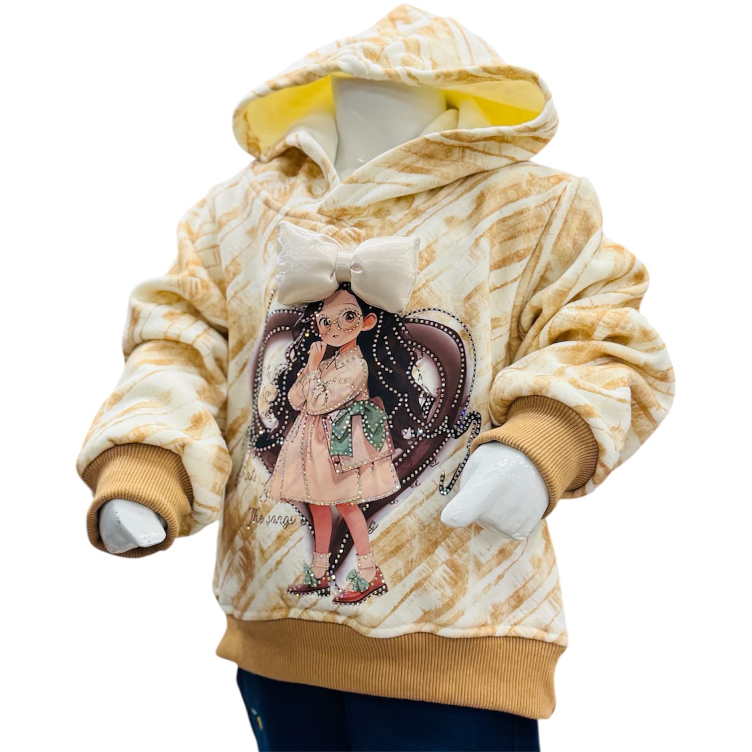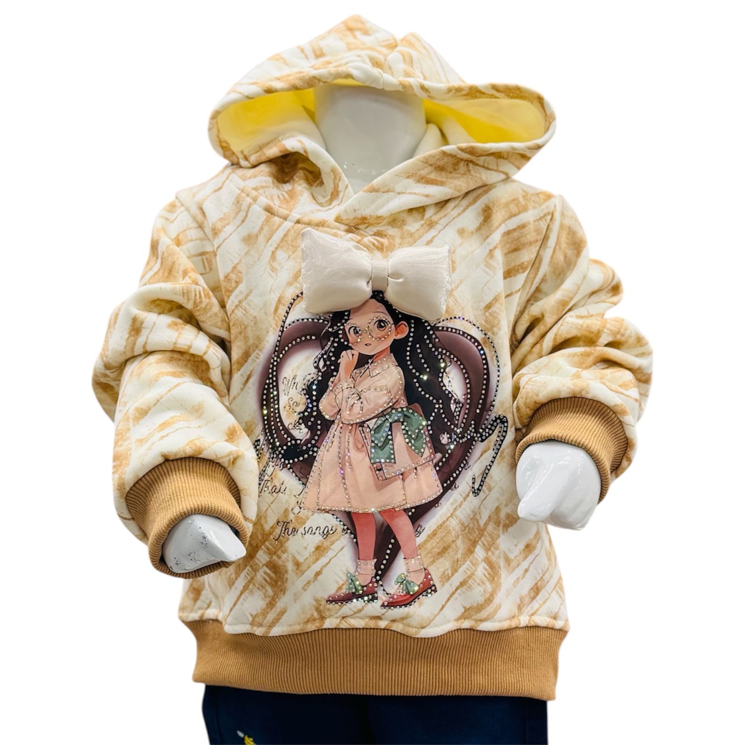 Beautiful girls winter hoodie set featuring a soft cream hoodie with cartoon print and matching warm pants.