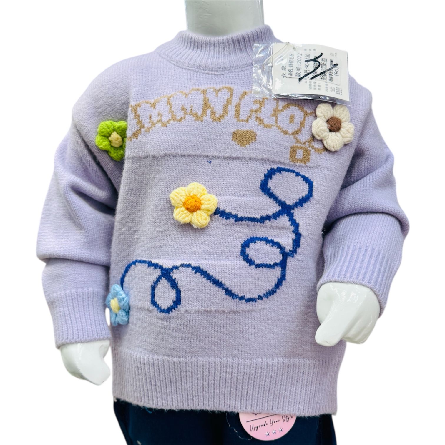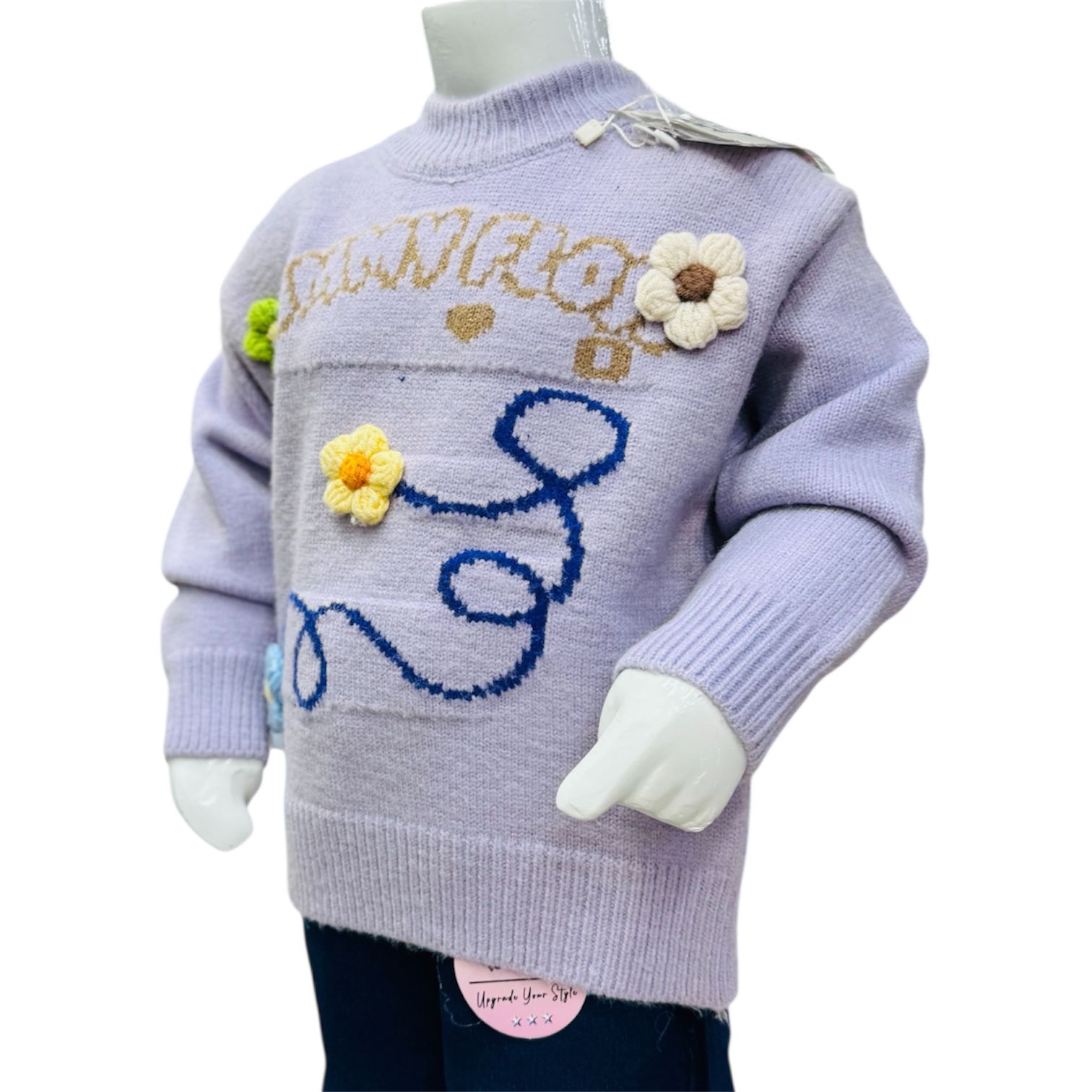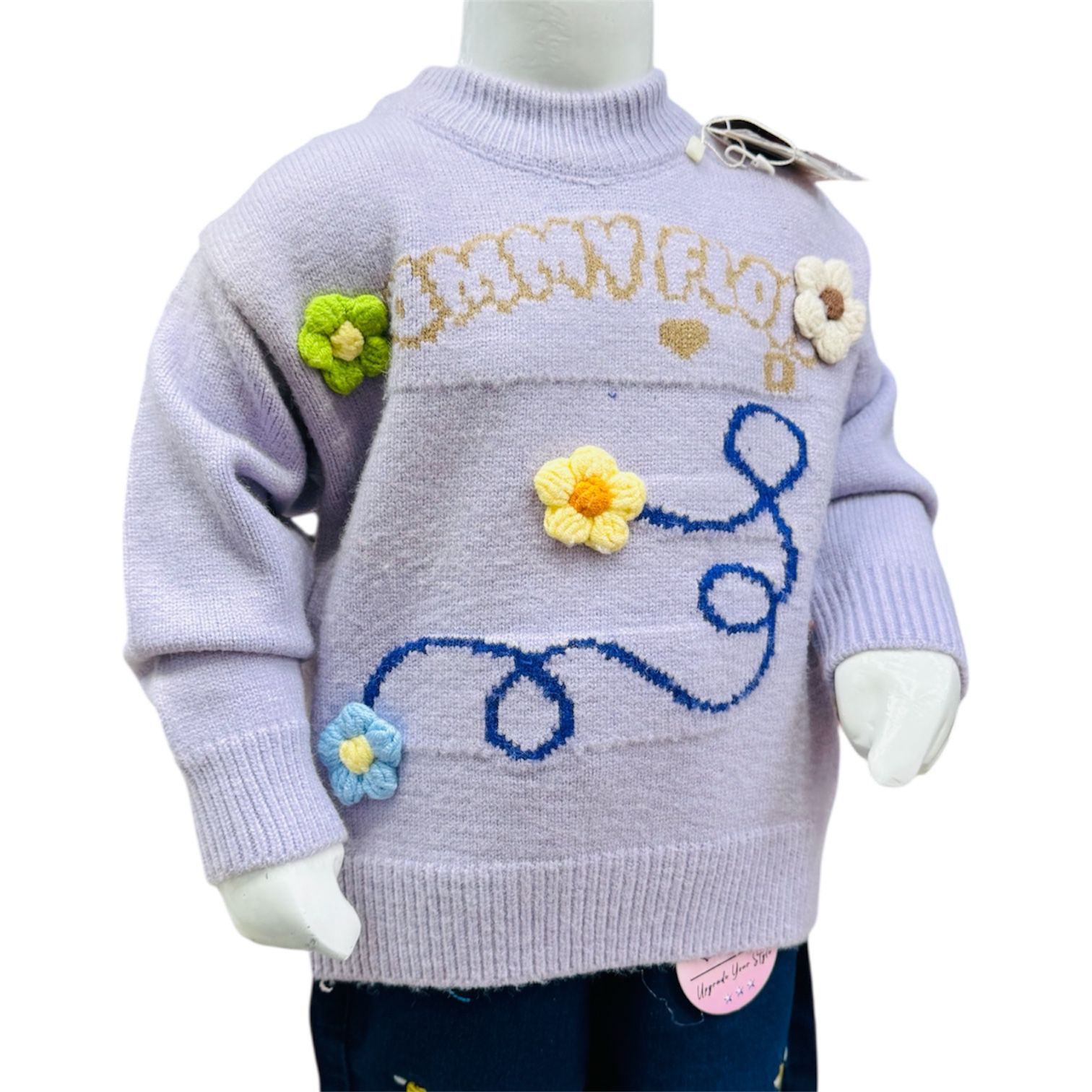The lavender-colored sweater features a high-neck ribbed collar, delicate text detailing, and beautiful hand-style 3D floral appliqués with embroidered swirl patterns, giving it a classy and fashionable winter look. Ribbed cuffs and hem provide a snug and cozy fit.