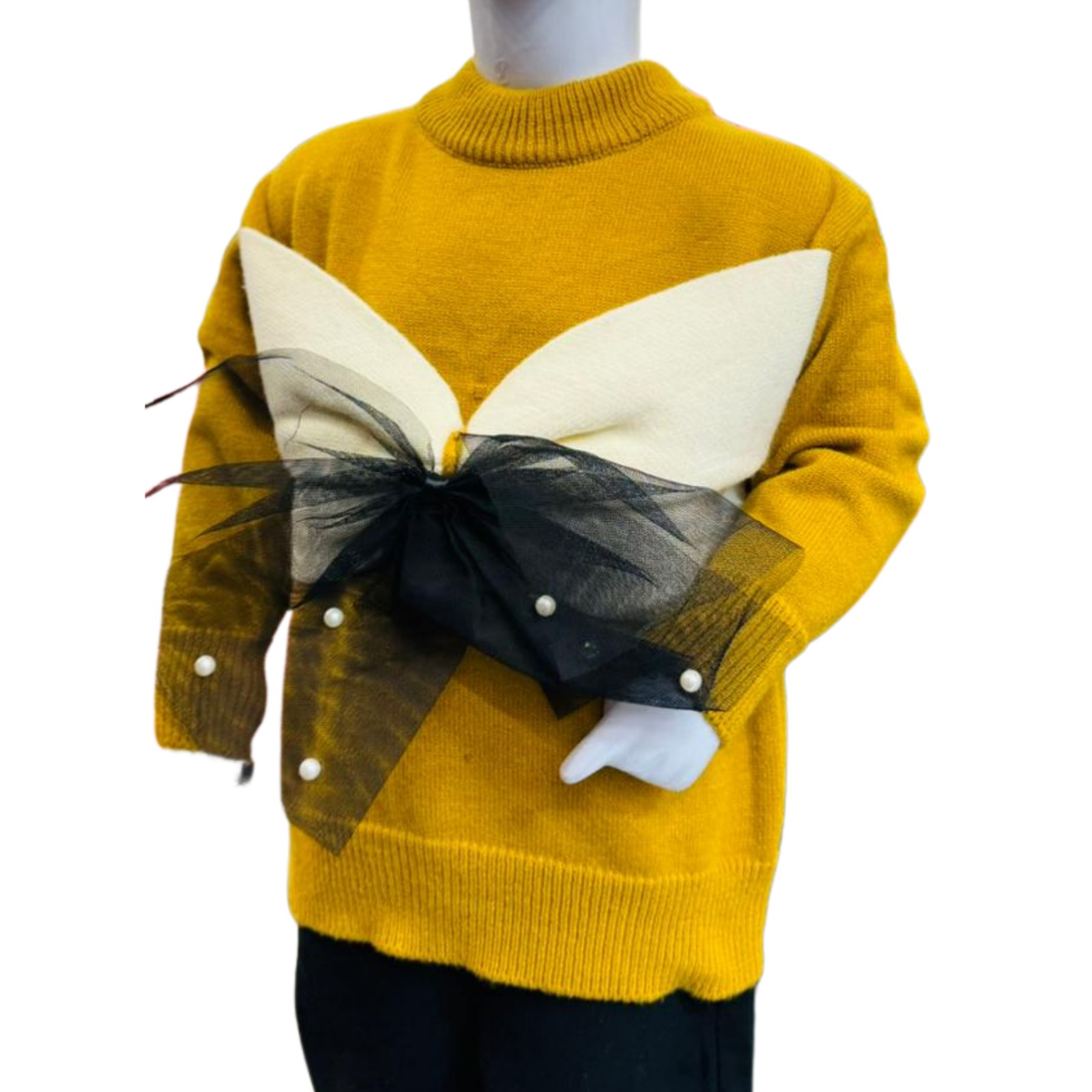 The mustard-colored sweater features a unique large bow design on the front, enhanced with soft net fabric and pearl-style detailing, giving it a fashionable and premium look. The high neckline and ribbed cuffs provide extra warmth during chilly days.