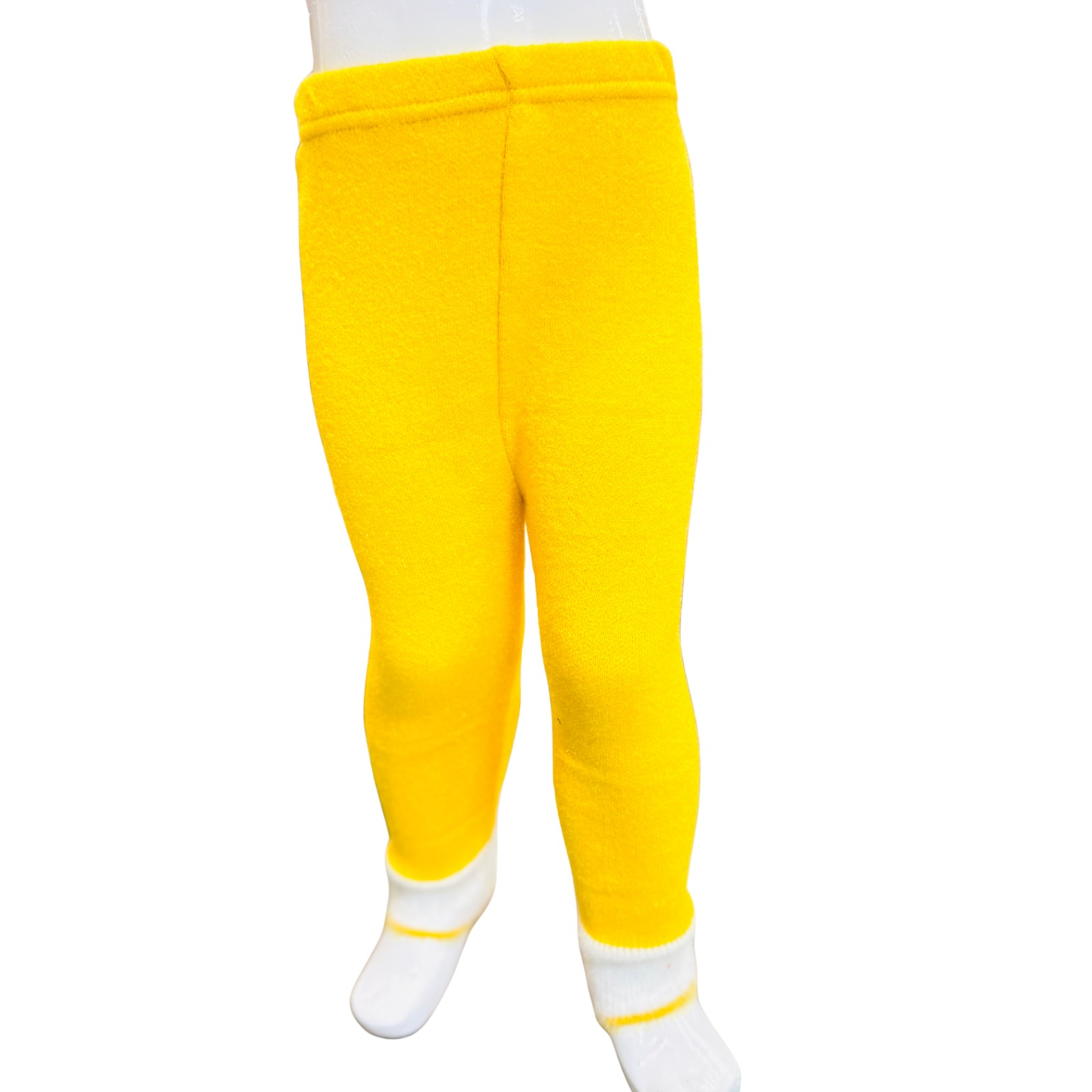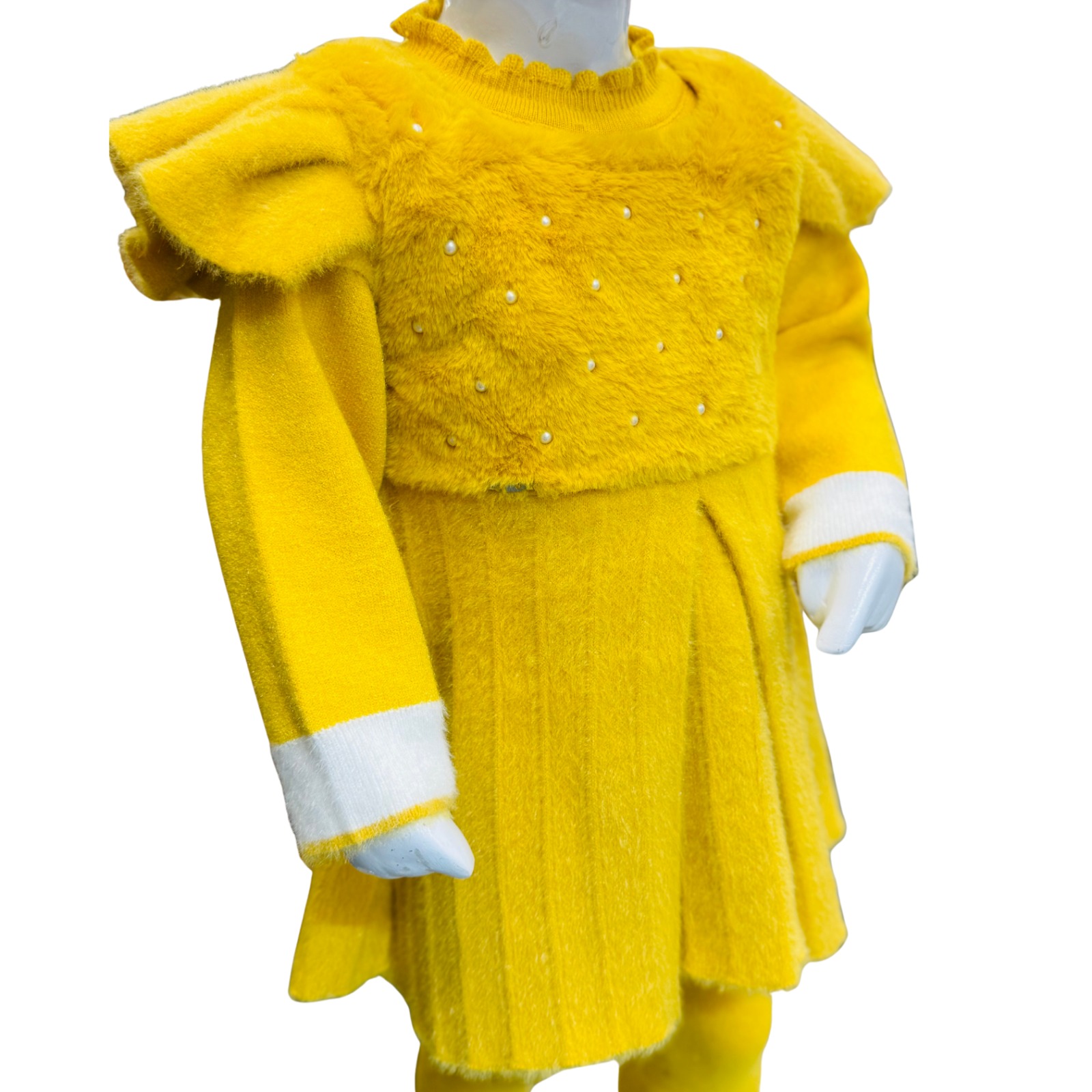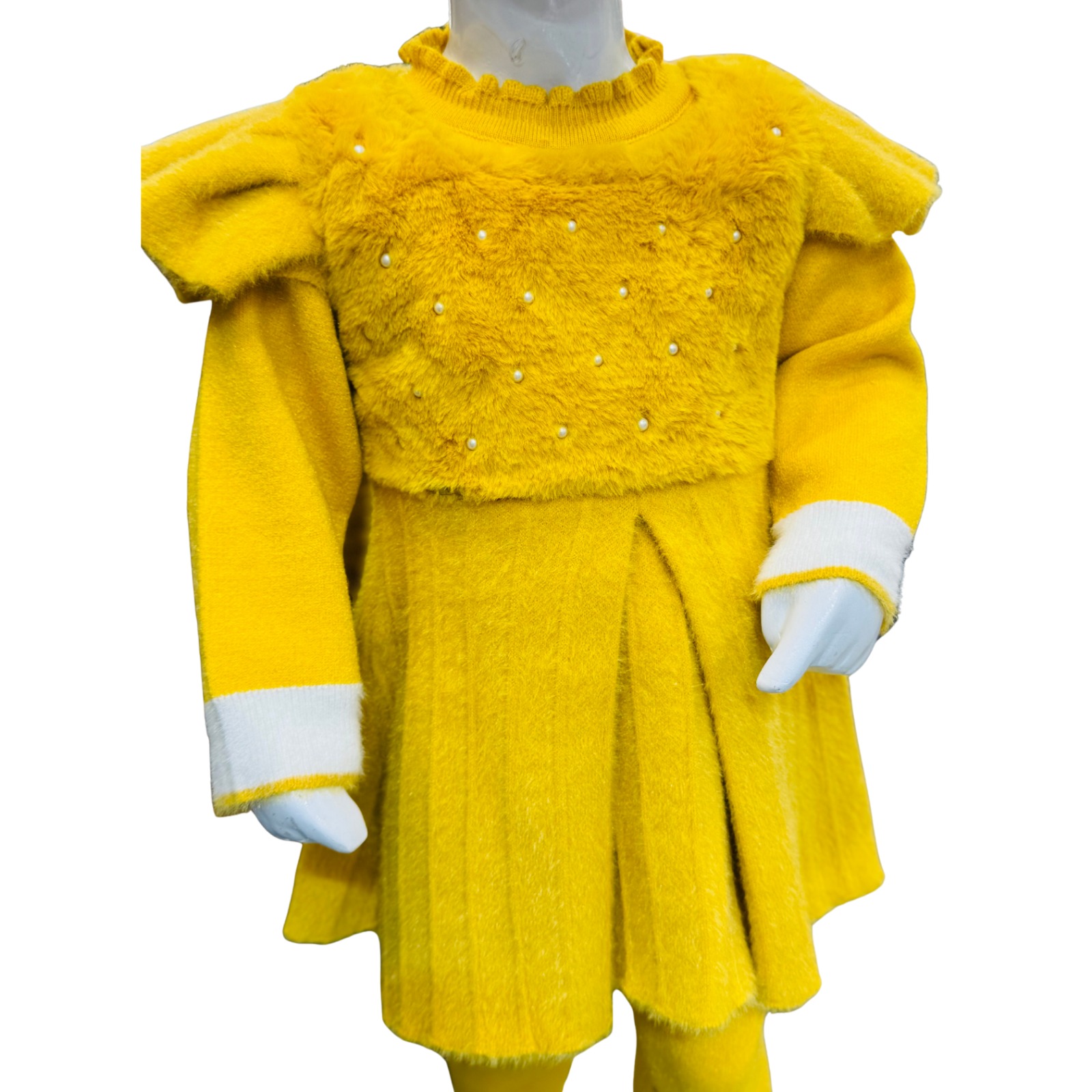 Elegant mustard yellow winter dress set featuring a soft fur-textured bodice with pearl accents and matching leggings for warmth and style.