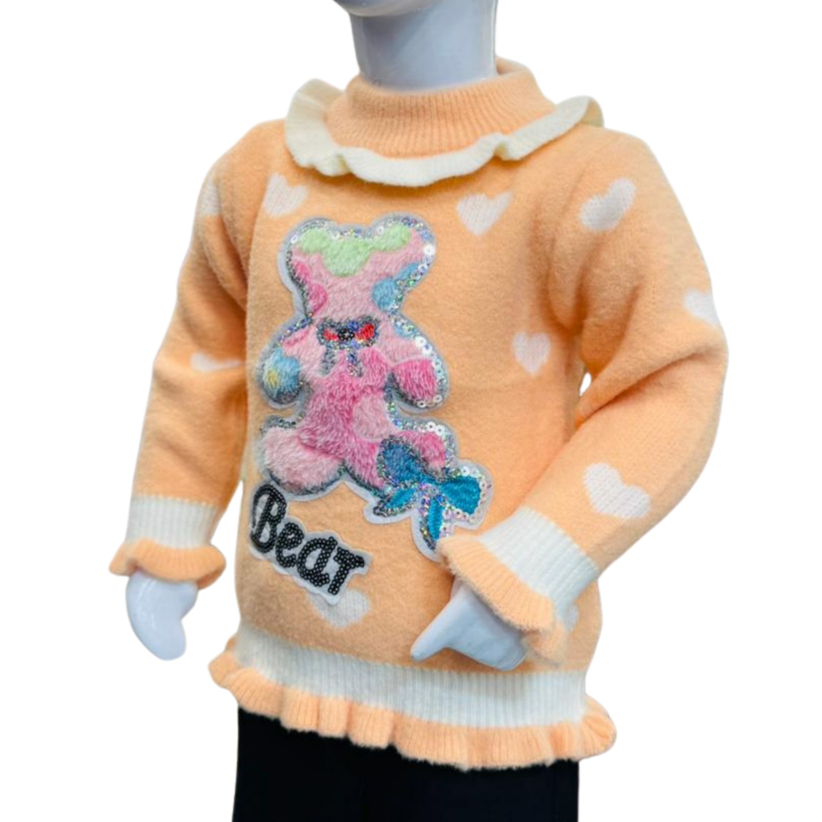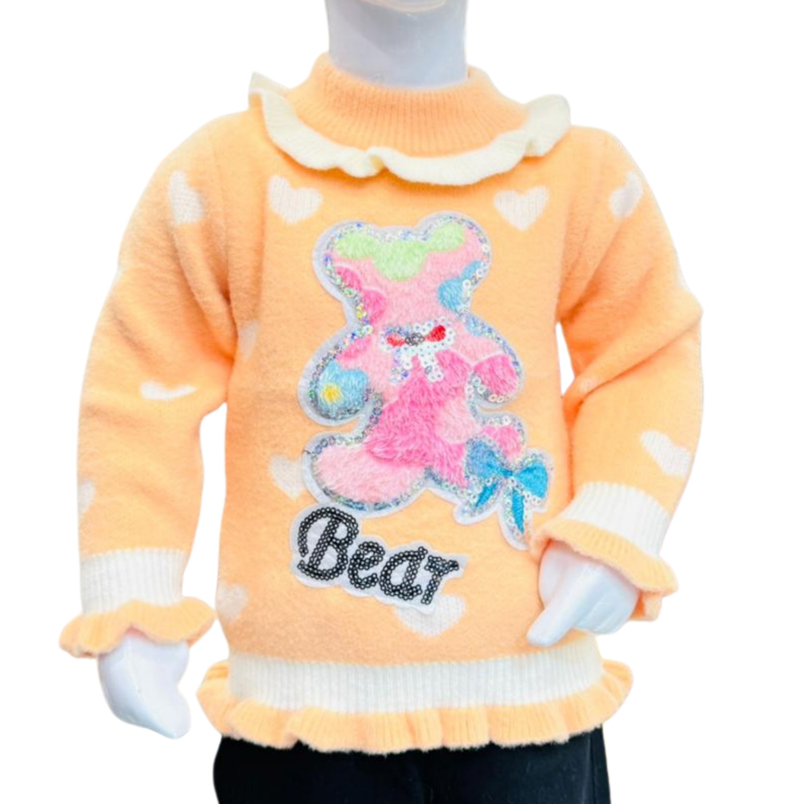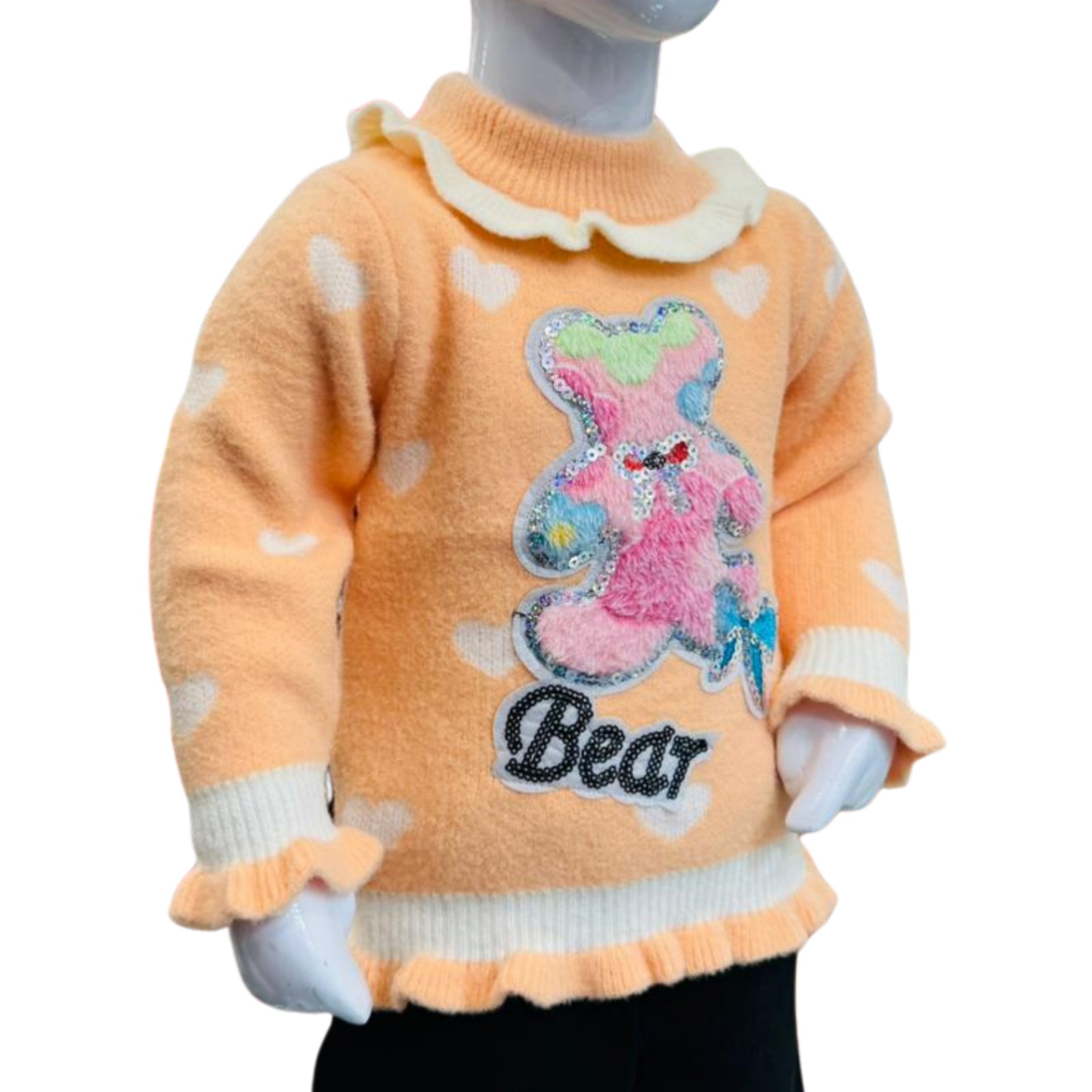 The sweater features a cute colorful bear design on the front, enhanced with delicate heart patterns and a stylish frill neckline that adds a charming touch. The peach color gives a soft and sweet winter look, perfect for young girls.