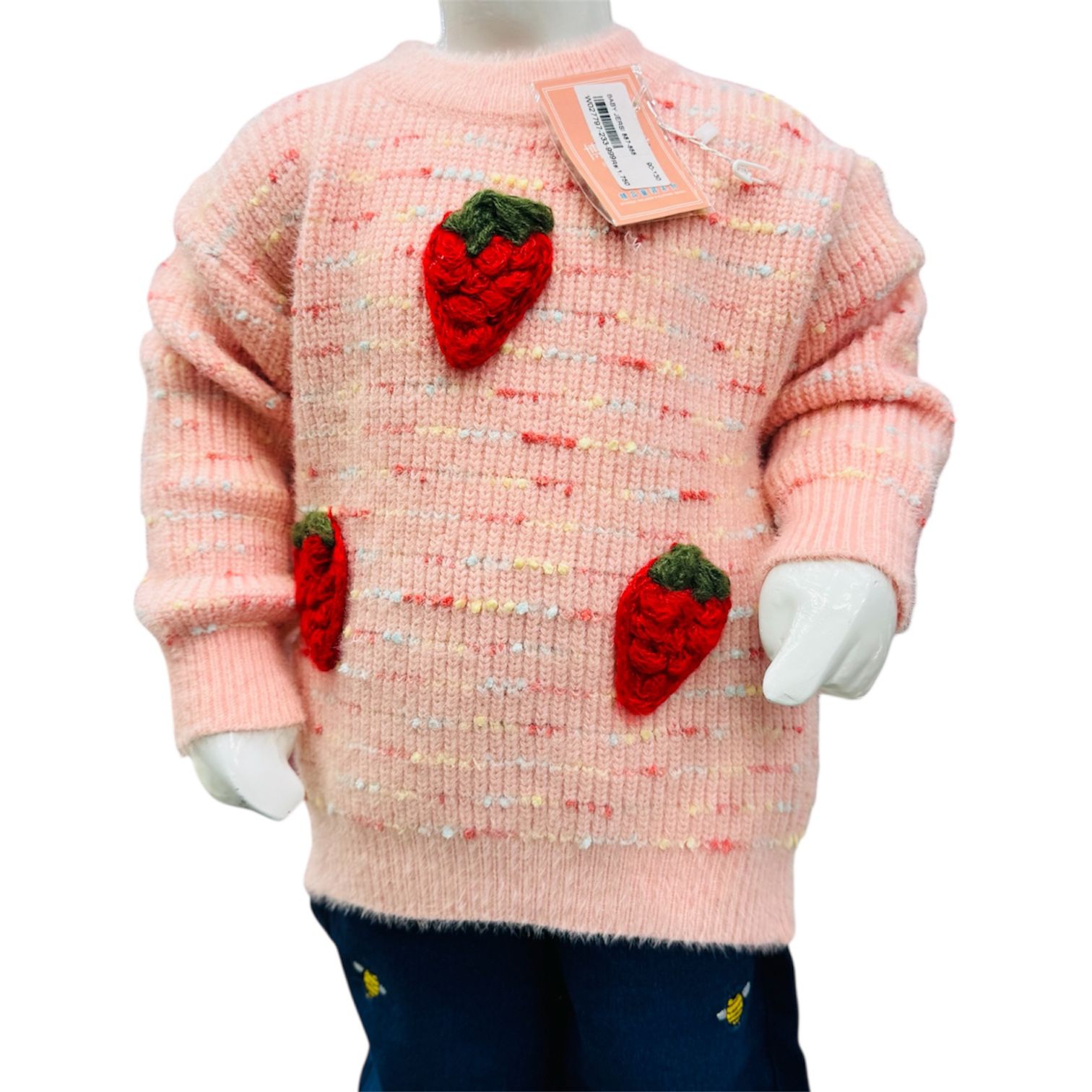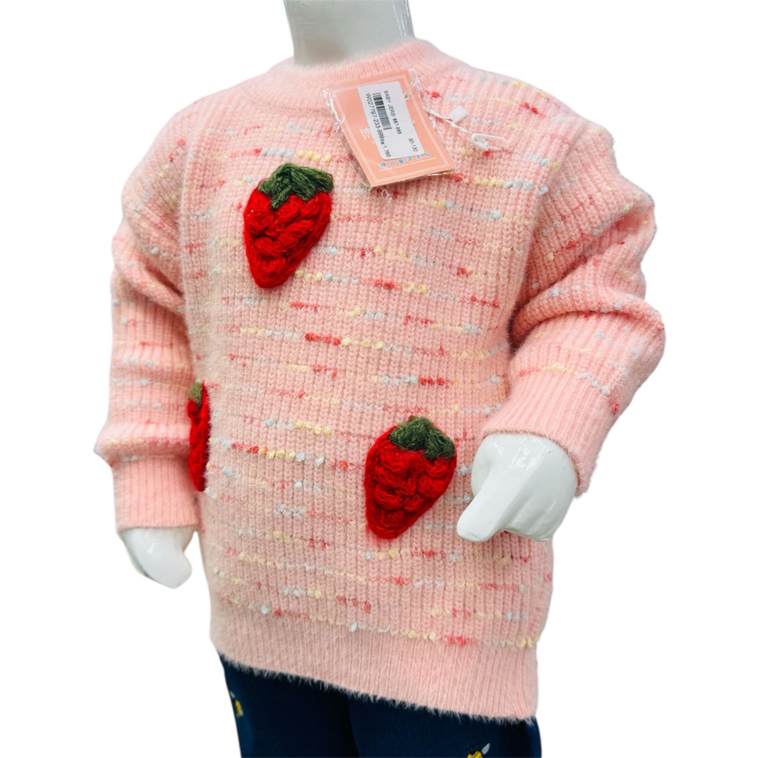 Adorable girls winter outfit featuring a soft pink knitted sweater with 3D strawberry design, paired with comfortable printed pants.