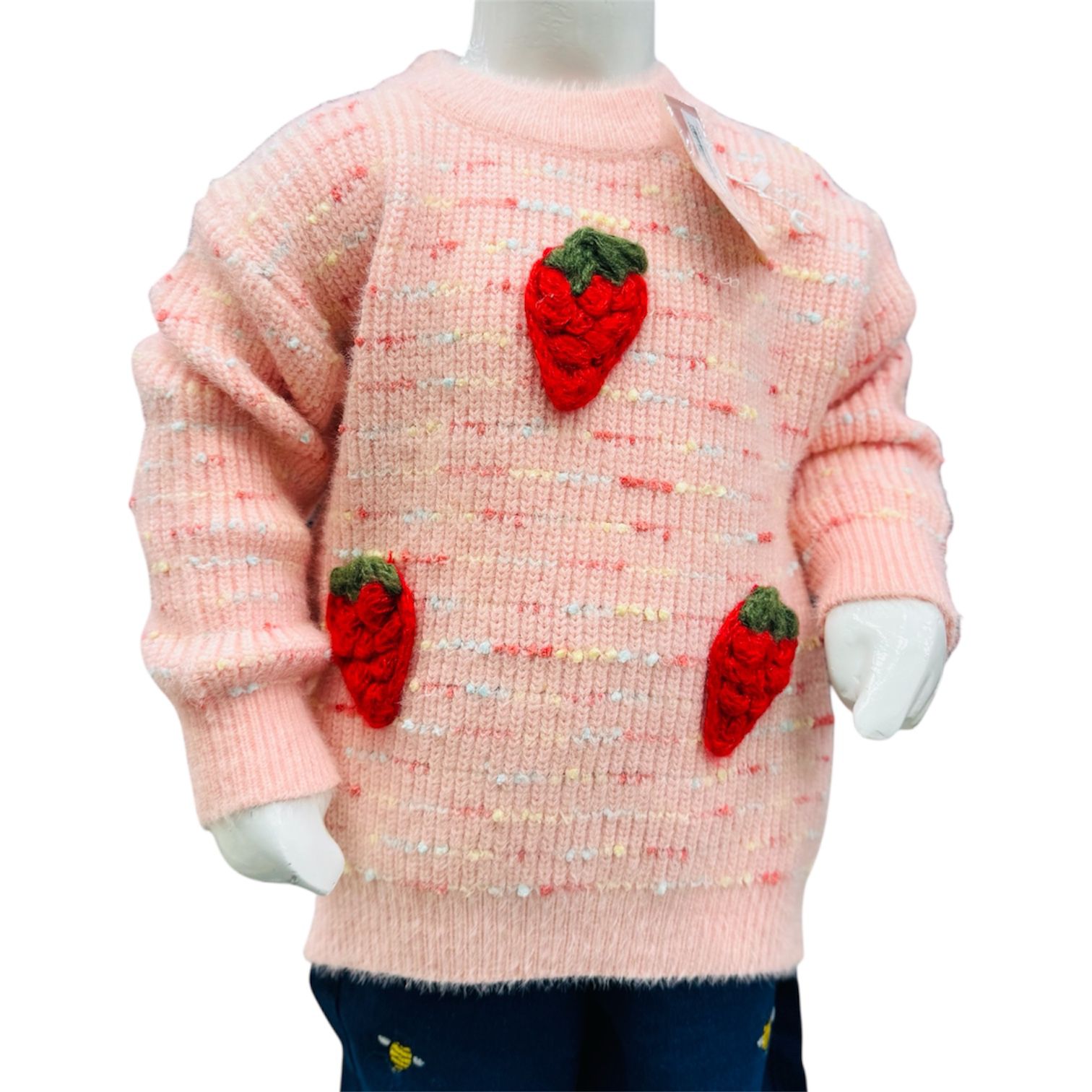The soft pink knitted sweater features beautiful 3D strawberry appliqué details on the front, giving it a unique handmade look. The sweater has a cozy texture with ribbed neckline, cuffs, and hem to ensure warmth and a comfortable fit.