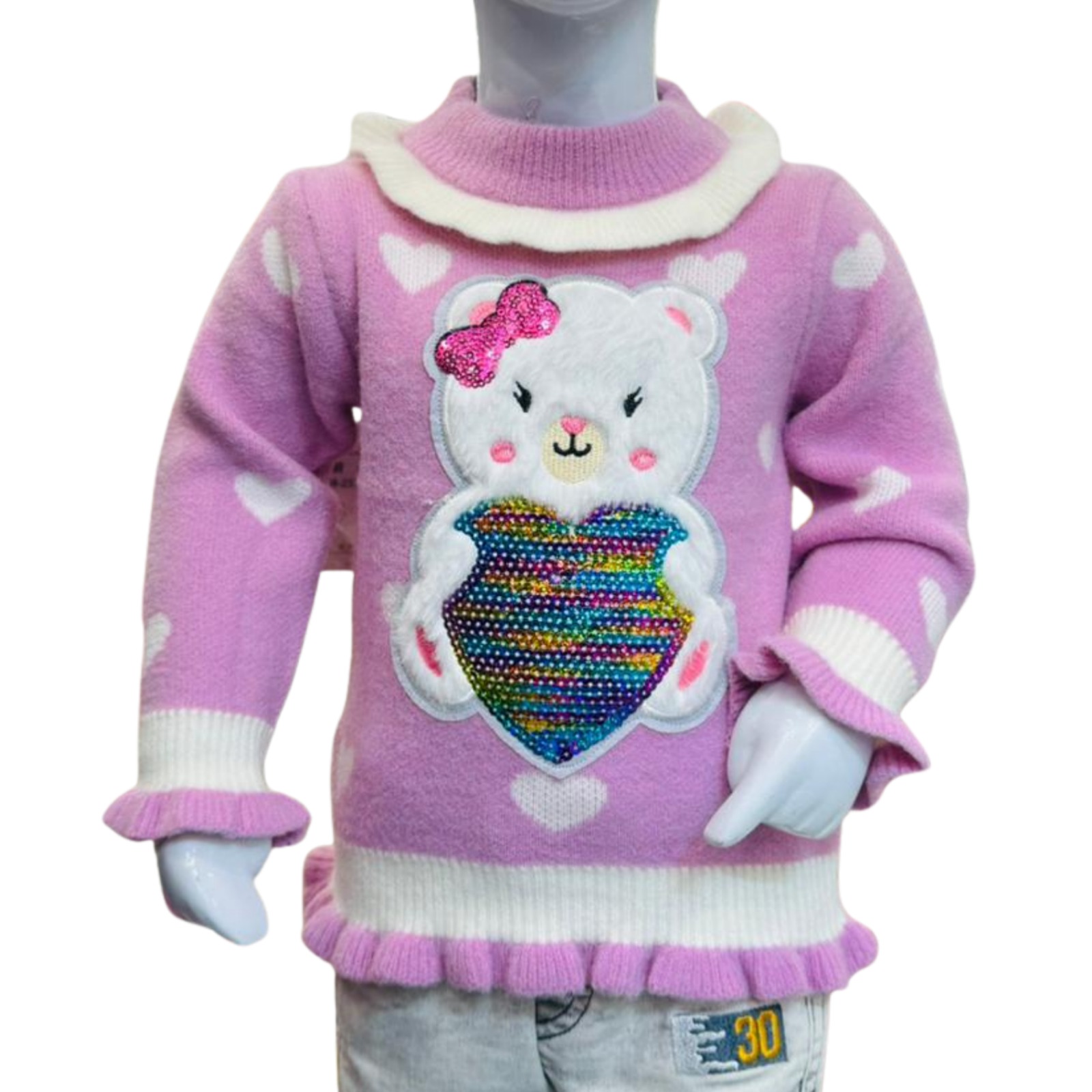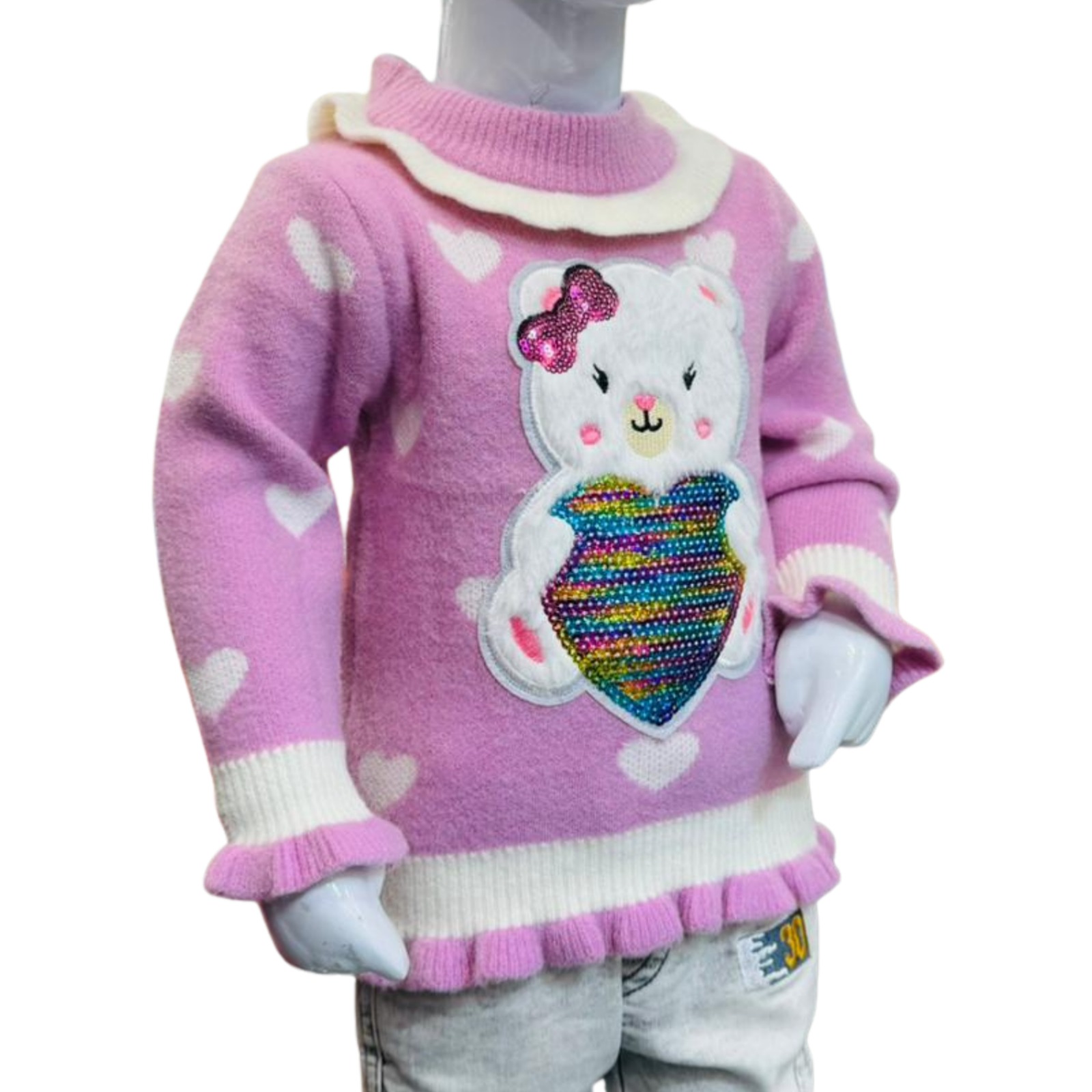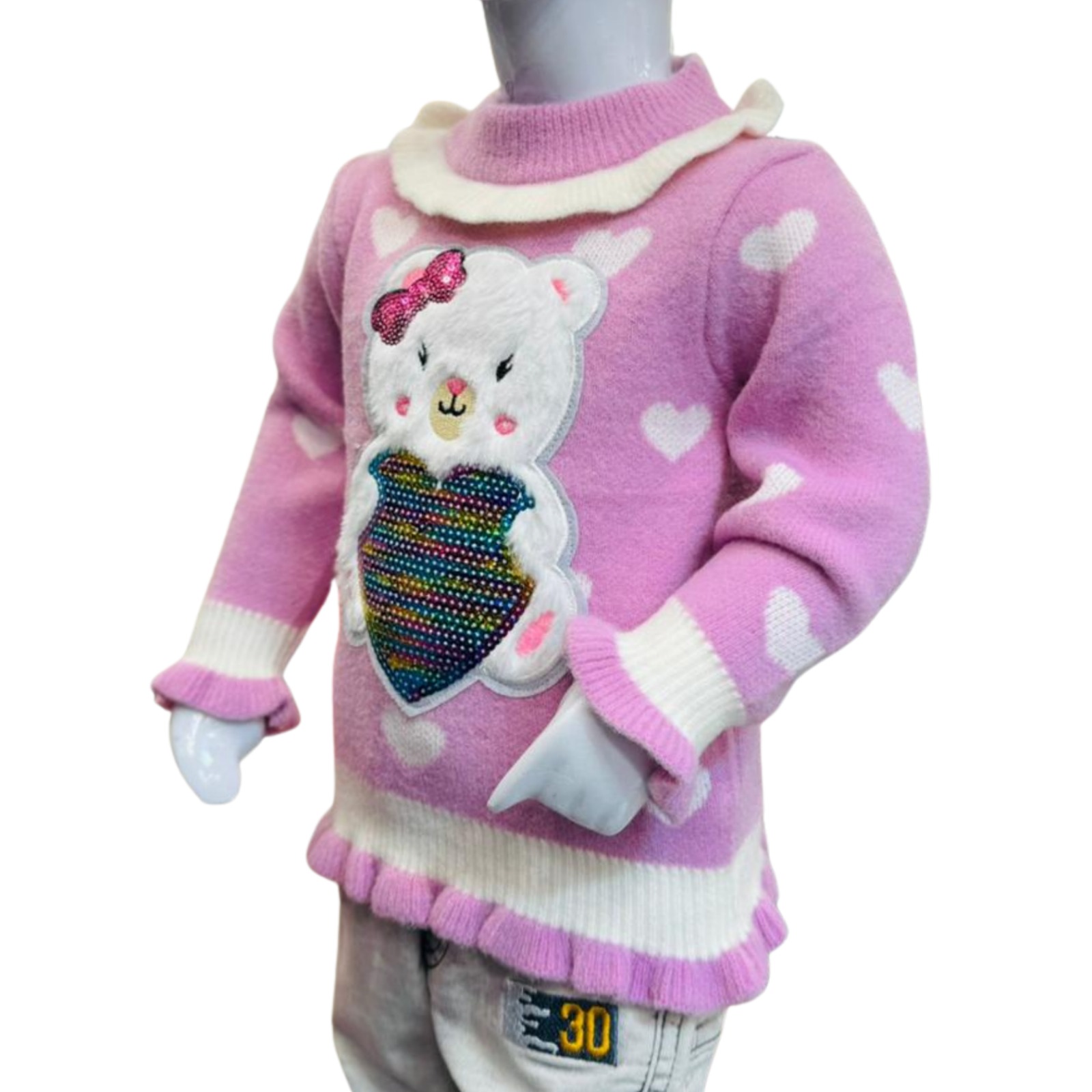 Adorable pink knit sweater for girls featuring a cute teddy bear design with colorful detailing, perfect for warm and stylish winter looks.