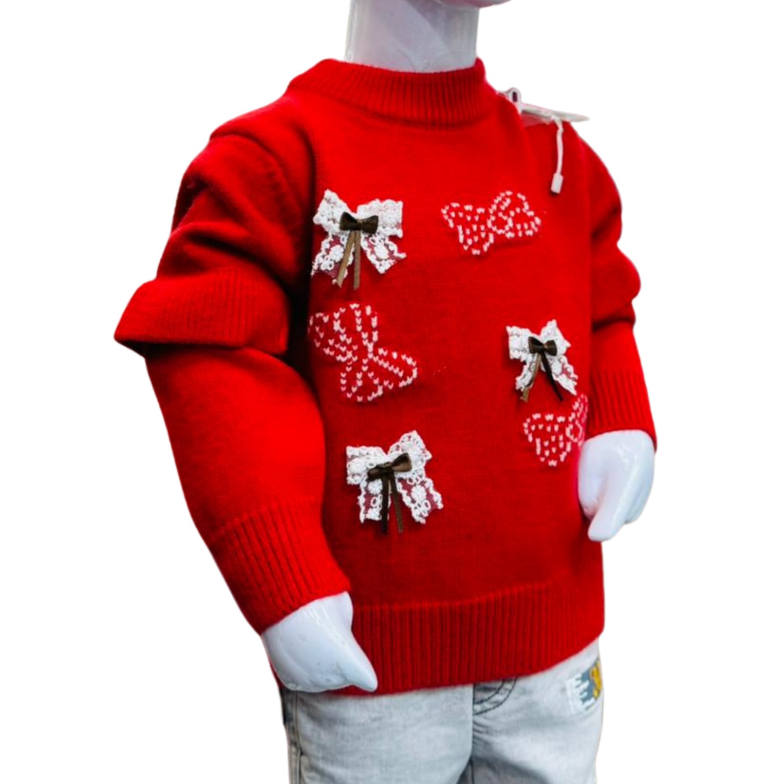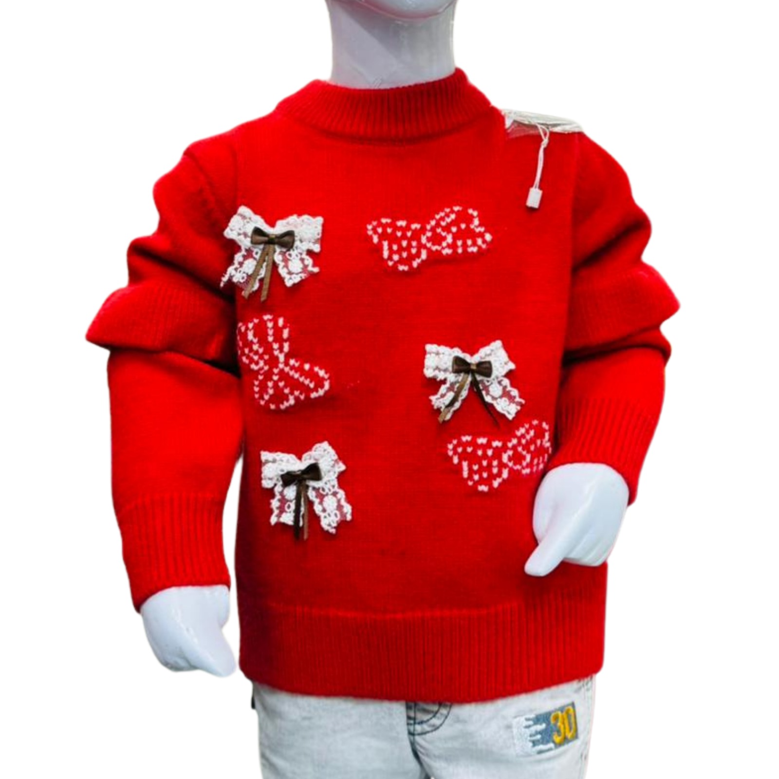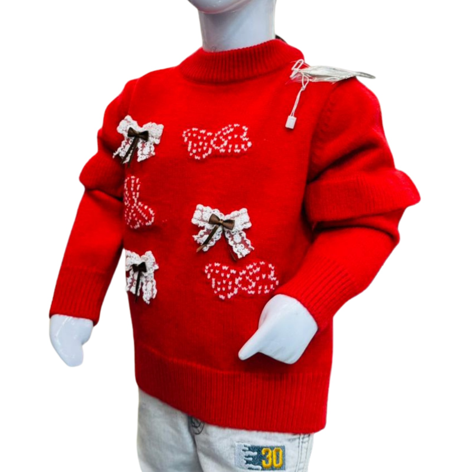 Stylish red knit sweater for girls featuring cute bow embellishments, perfect for cozy and fashionable winter outfits.