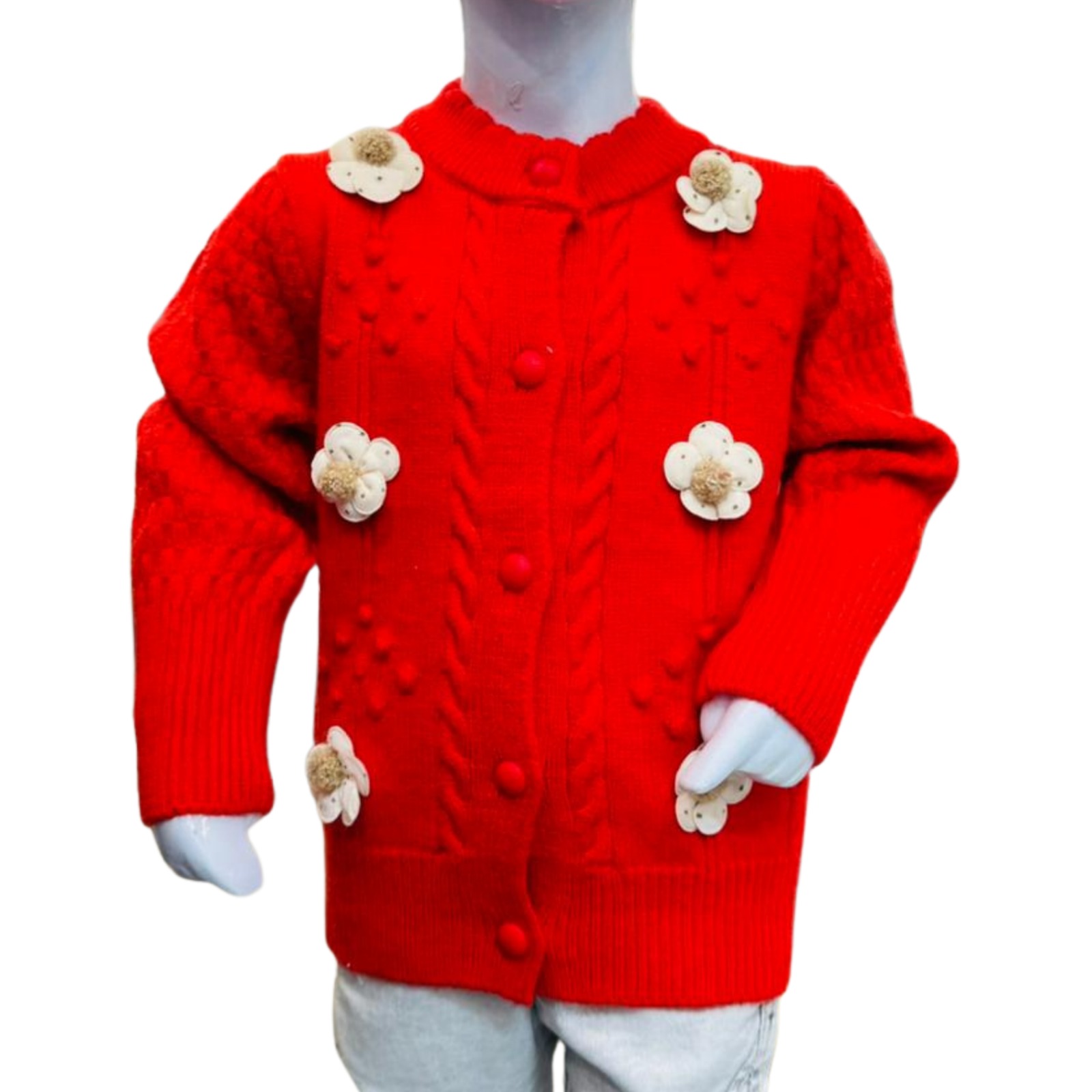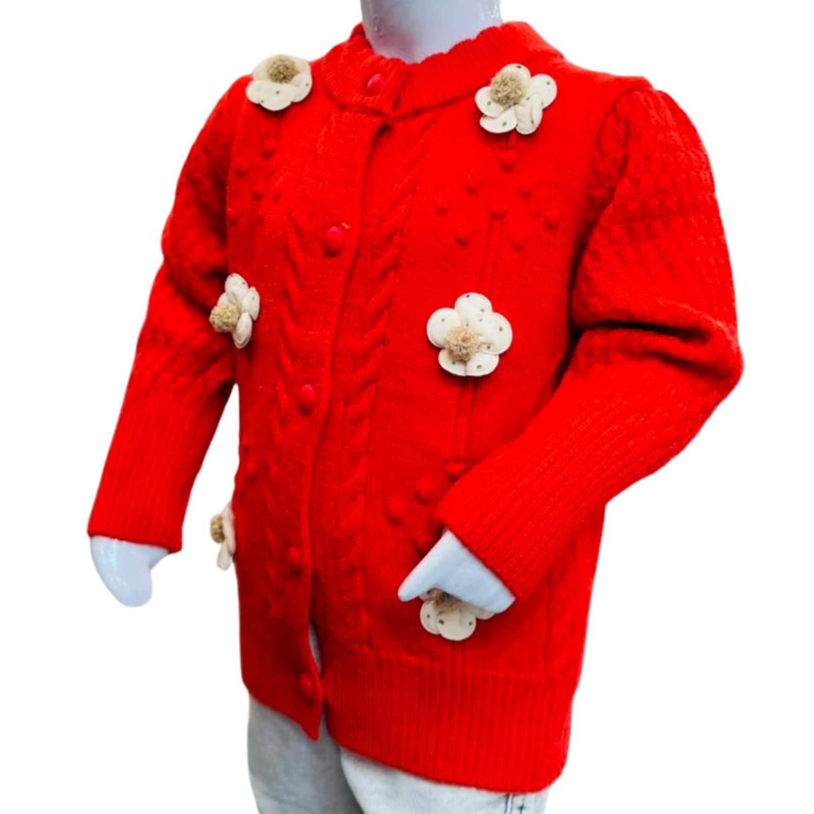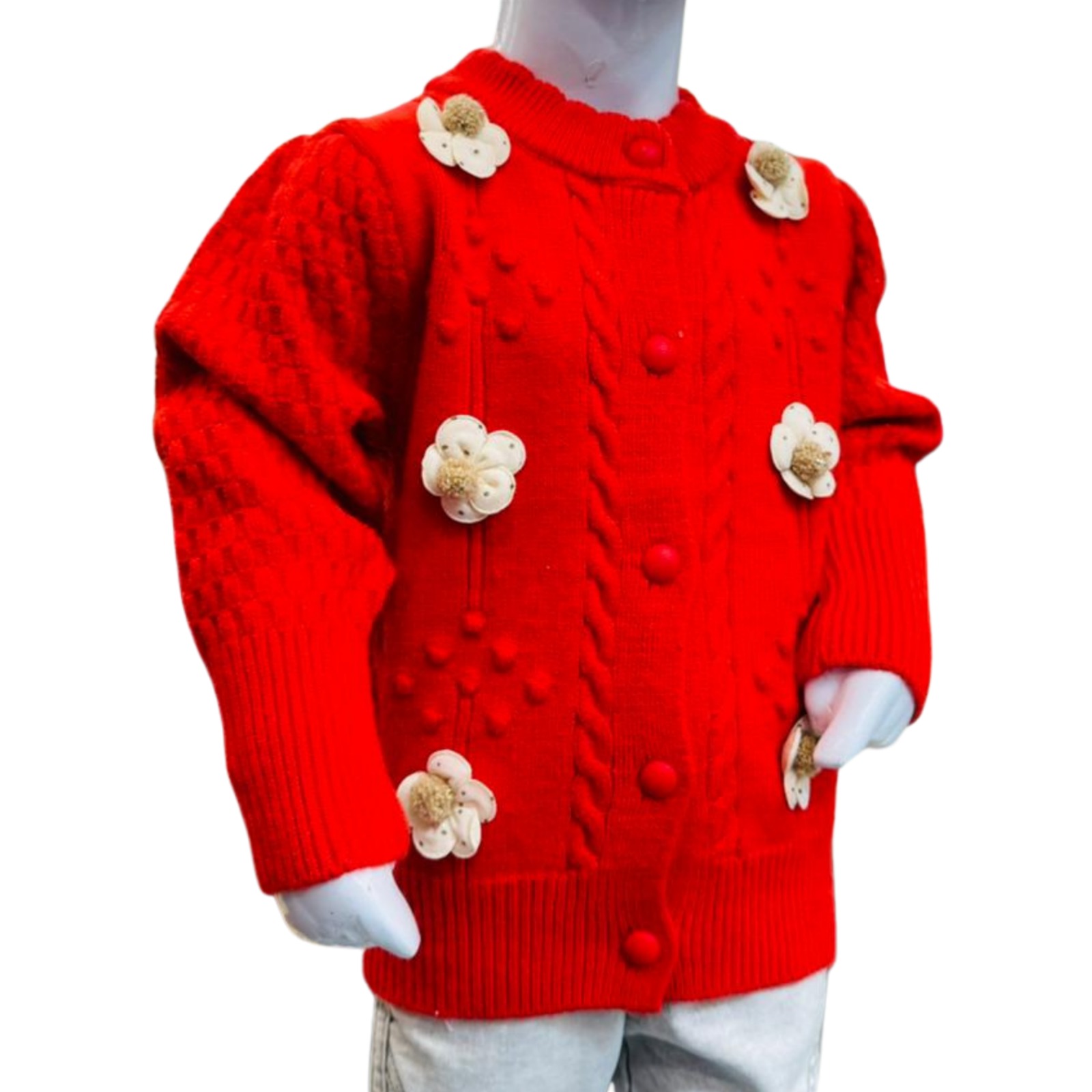 Elegant red knit cardigan for girls featuring delicate floral appliqués and front button closure, perfect for stylish winter layering.