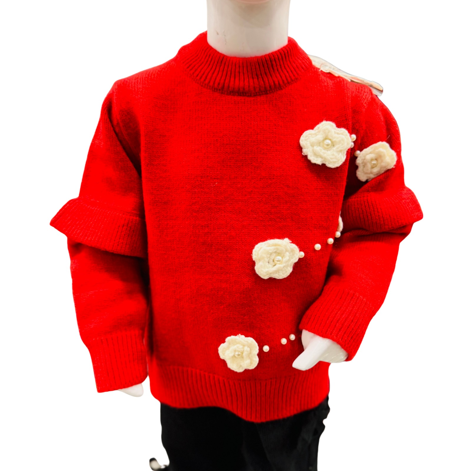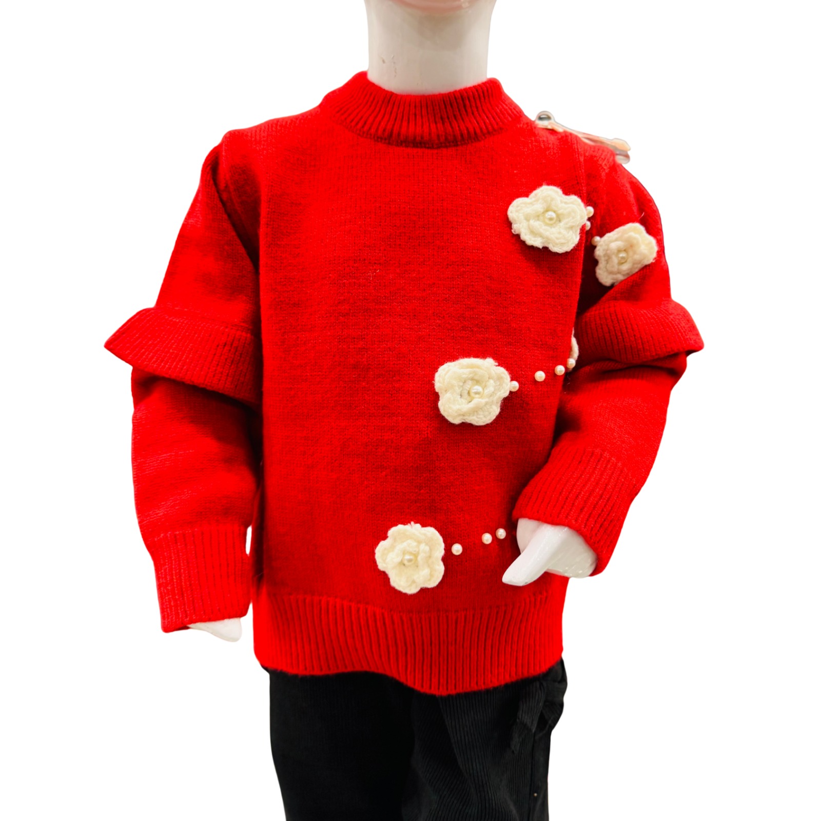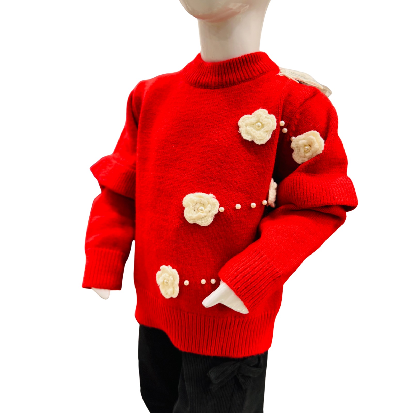 Keep your little girl warm and stylish this winter with our Girls Red Winter Sweater & Trouser Set. The soft knit sweater features elegant floral appliqué details with pearl accents, adding a cute and fashionable touch. Crafted from premium-quality knit fabric, the sweater provides cozy warmth while remaining gentle on delicate skin.