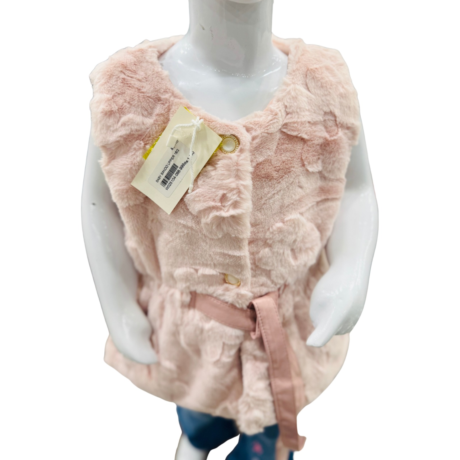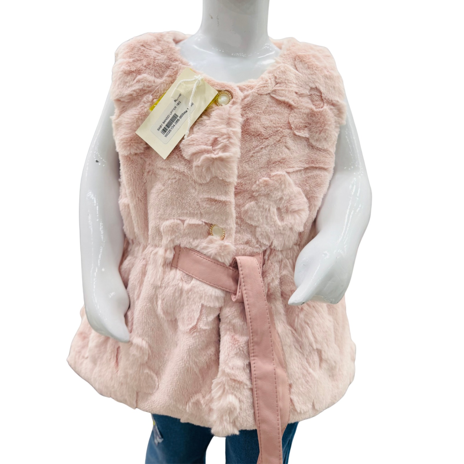 A stylish and cozy girls’ faux fur sleeveless winter coat featuring a soft plush texture and a matching belt — perfect for layering over winter outfits, parties, and casual wear.