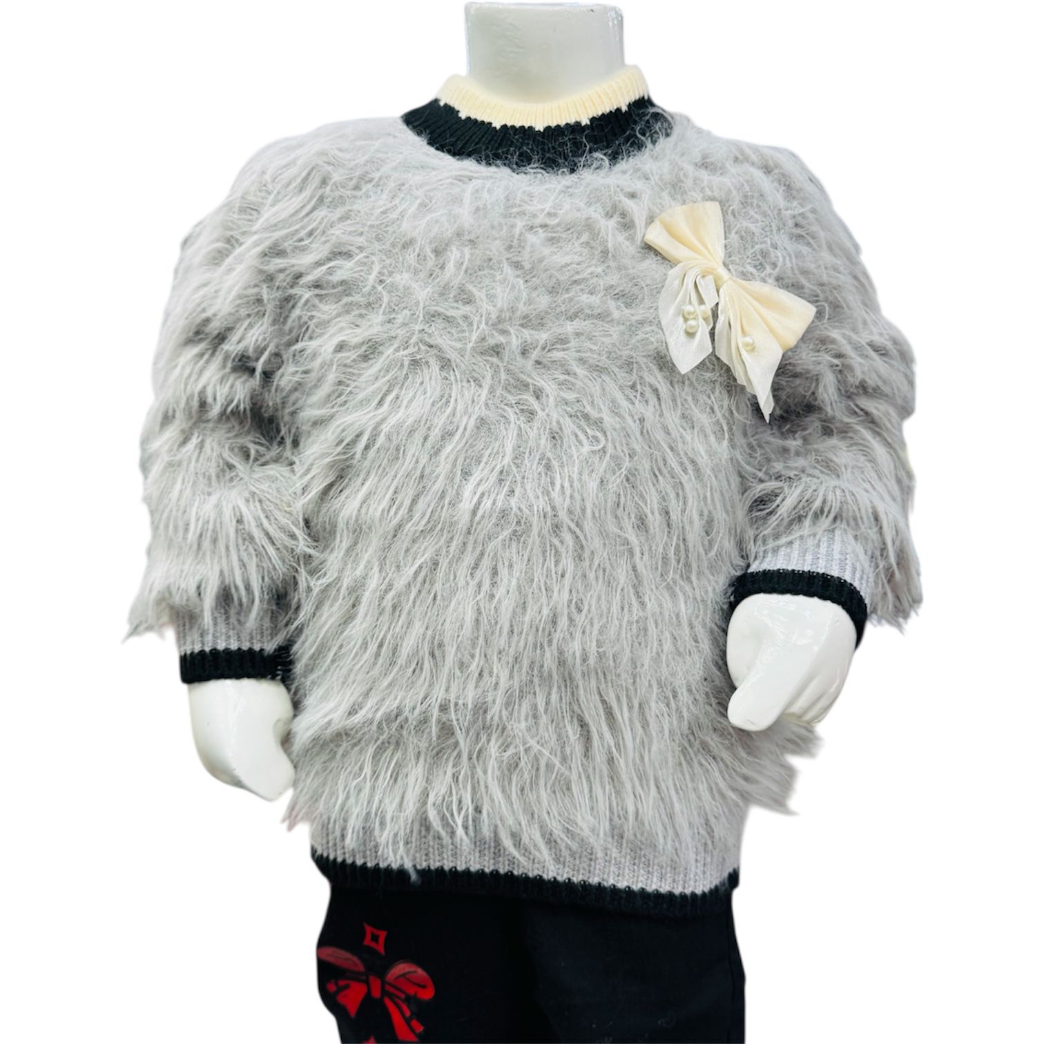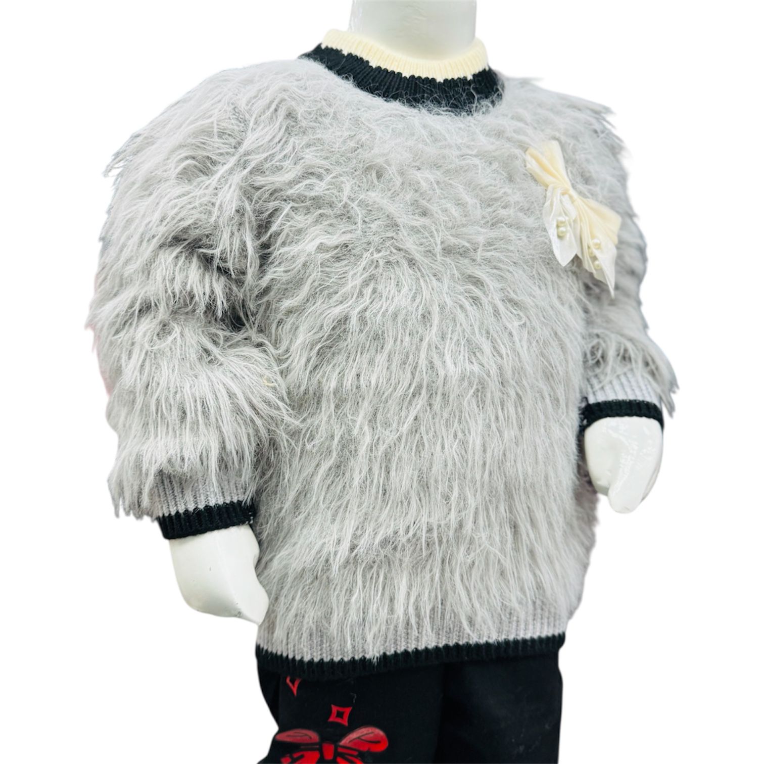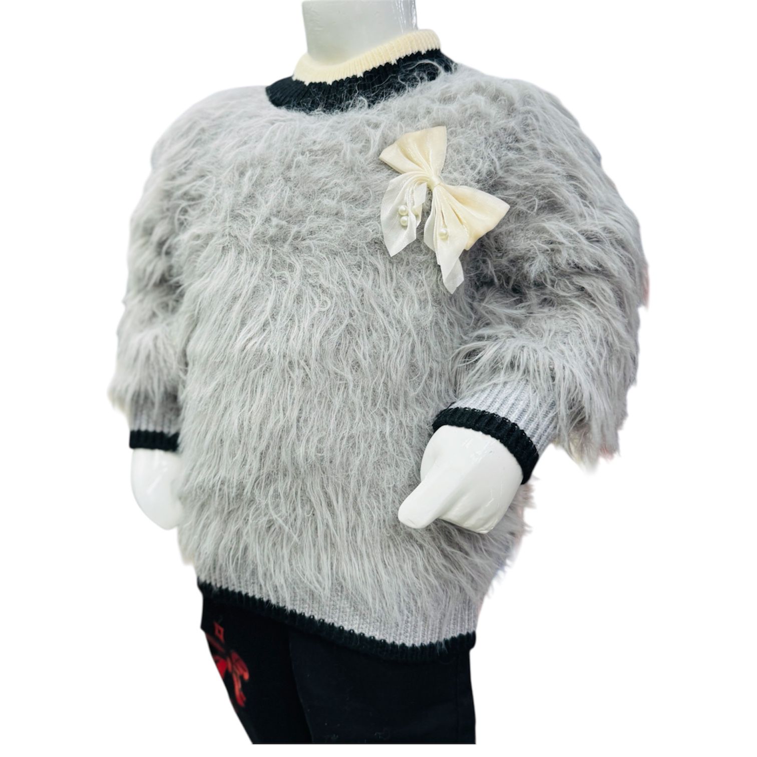 The grey furry sweater features a plush texture that feels soft on the skin, paired with elegant black ribbed cuffs, hem, and neckline for a neat finish. A delicate bow embellishment on the chest adds a charming and classy look, making this sweater stand out.