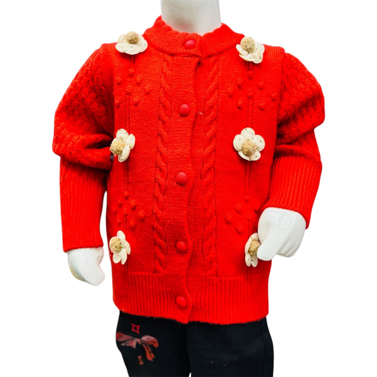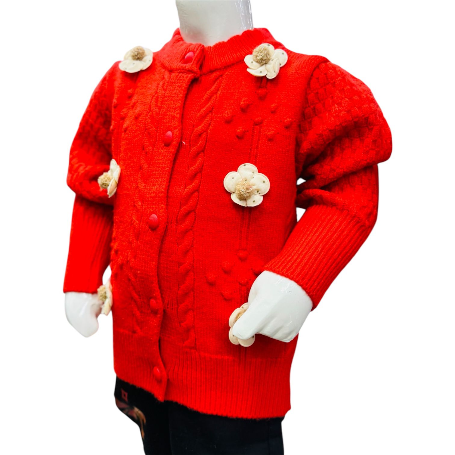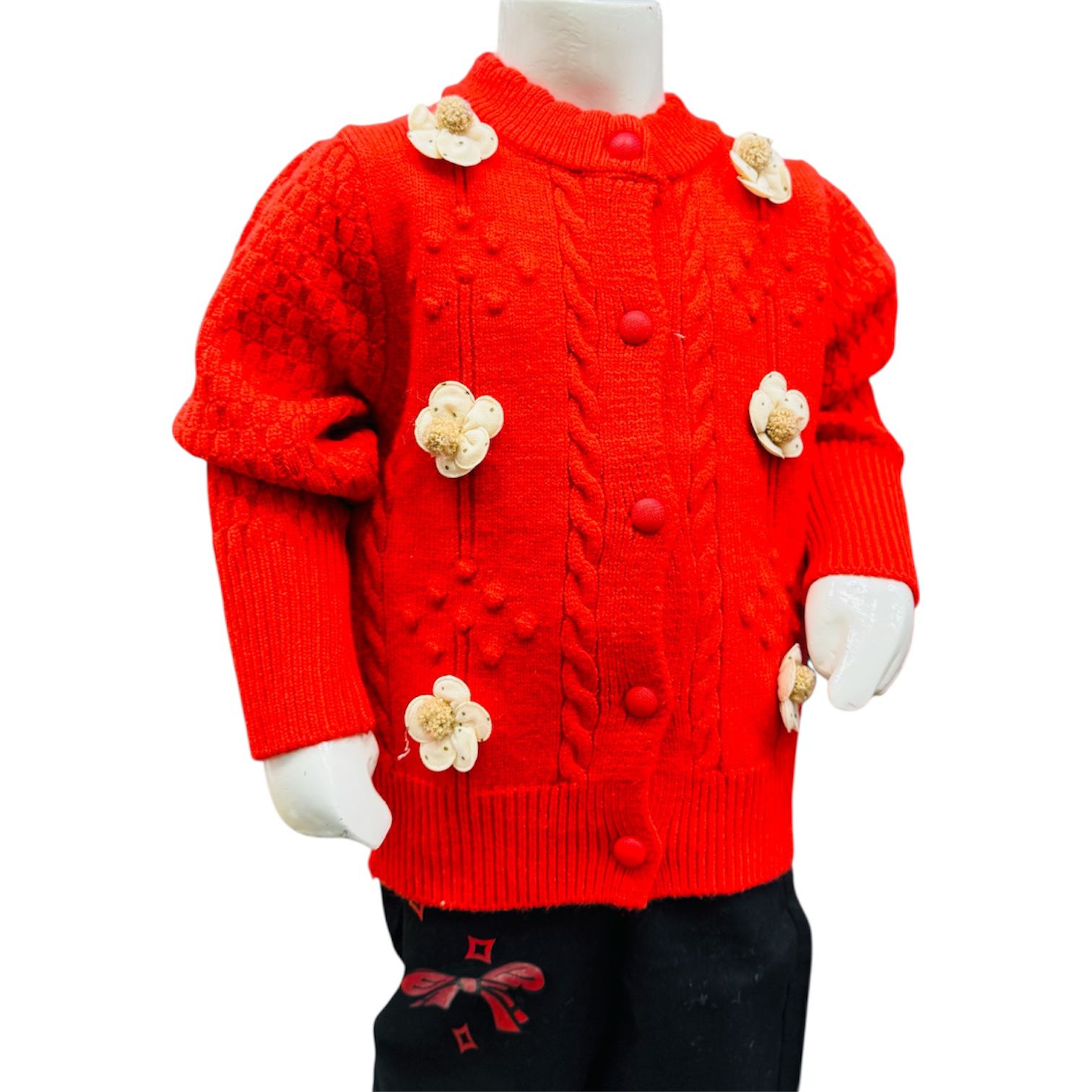 The bright red knitted cardigan features textured cable knit patterns, soft ribbed cuffs, and adorable floral appliqué details with matching buttons for a cute and classy finish. Designed to keep your child warm while looking stylish, the cardigan offers a snug yet comfortable fit.