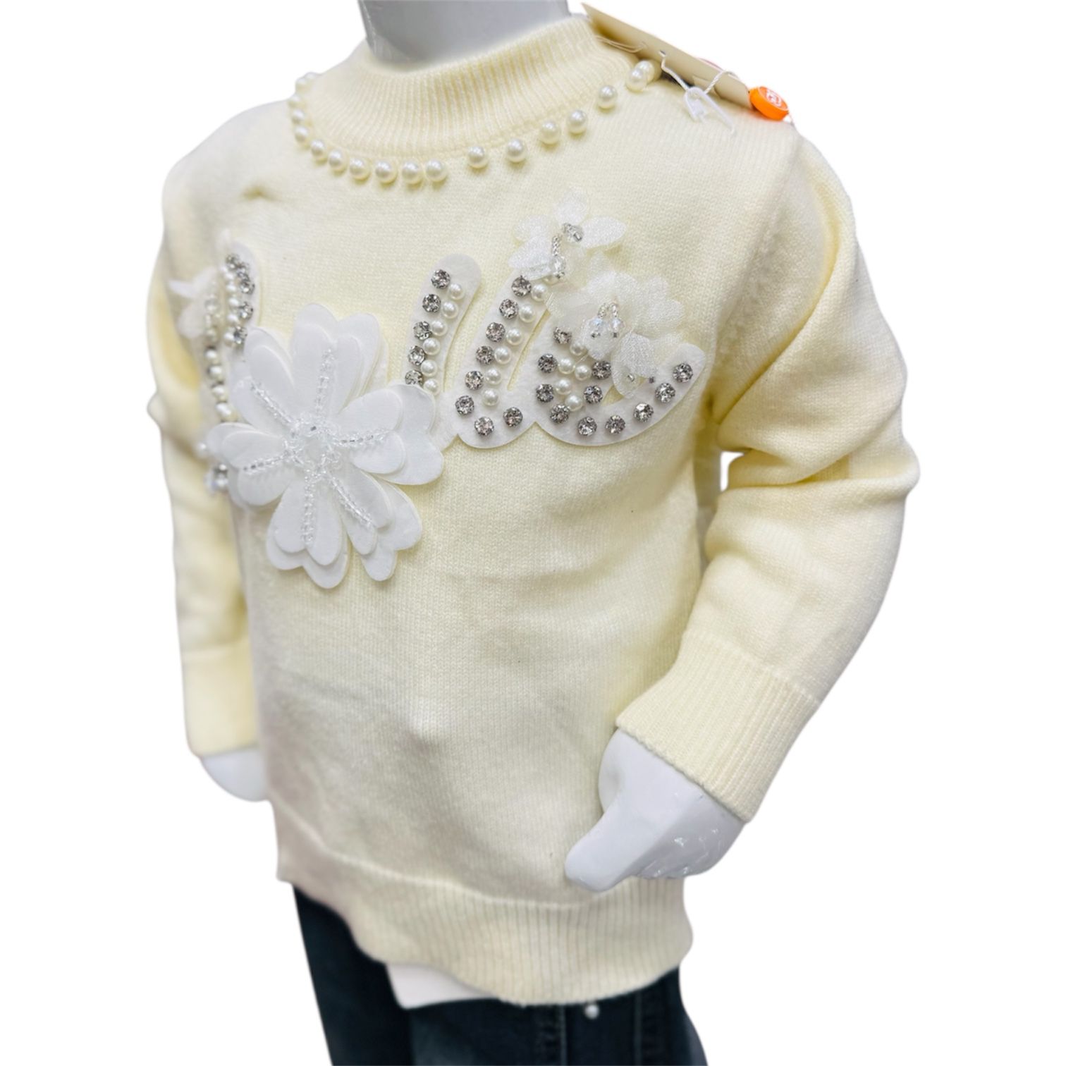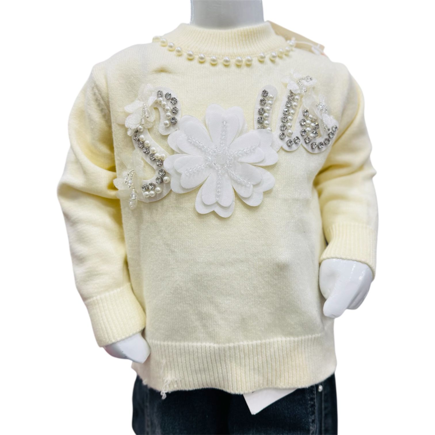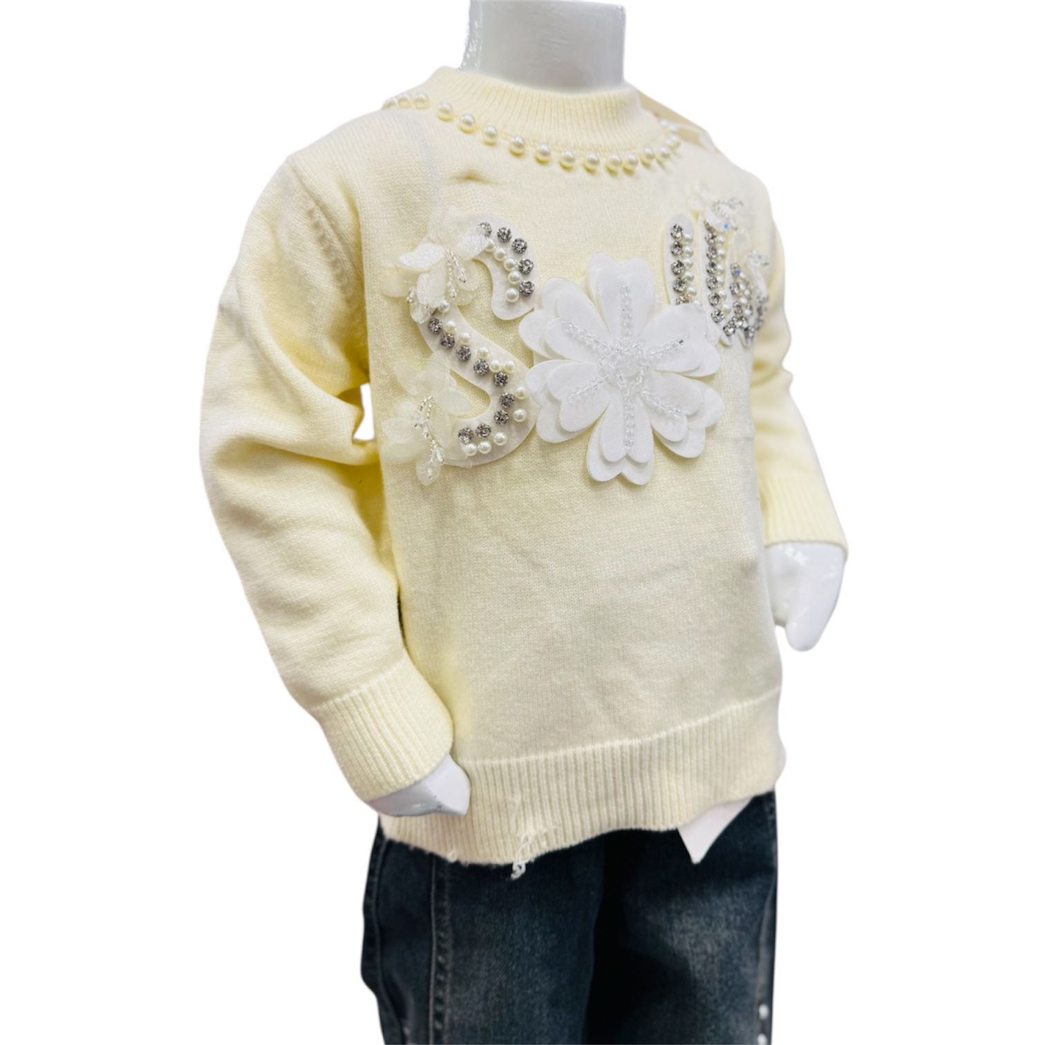 A graceful girls winter outfit featuring a pearl-embellished sweater with stylish denim jeans, perfect for casual wear and special occasions.