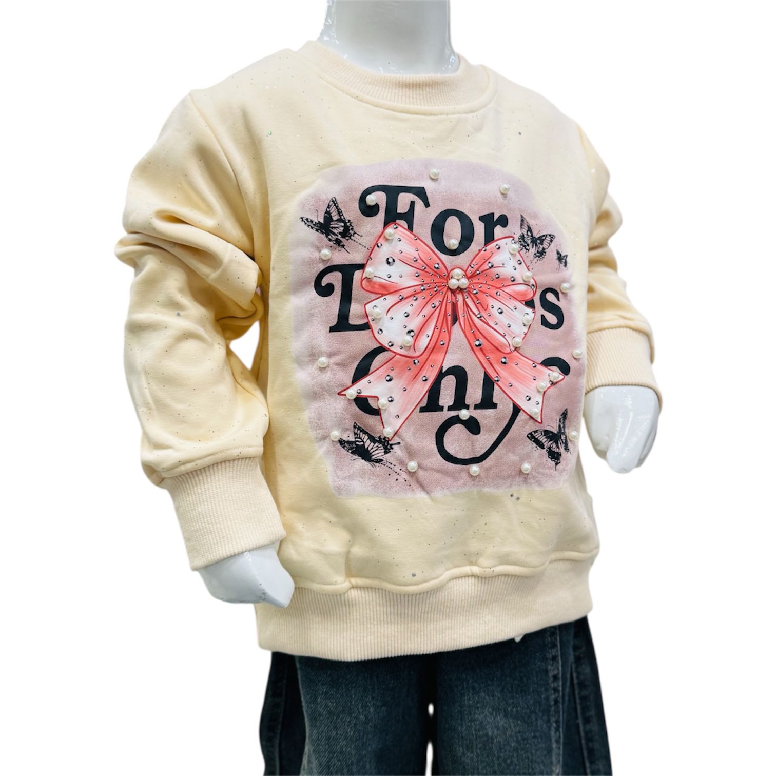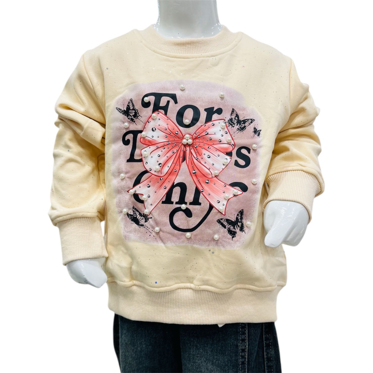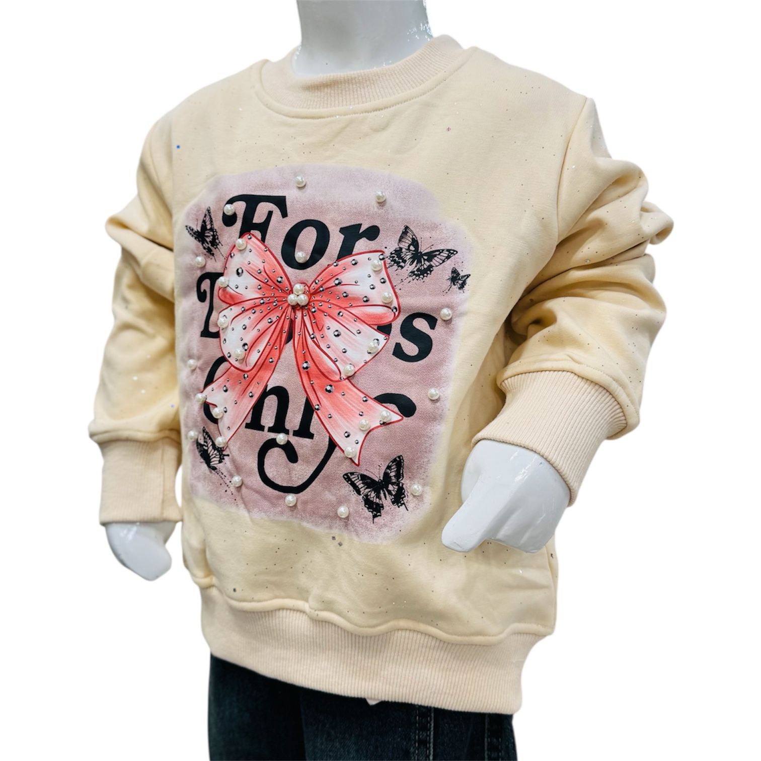 The soft cream-yellow sweatshirt features an eye-catching bow print with pearl embellishment and butterfly accents, giving it a fashionable and cute look. Ribbed cuffs, hem, and neckline ensure a snug and cozy fit during colder days.