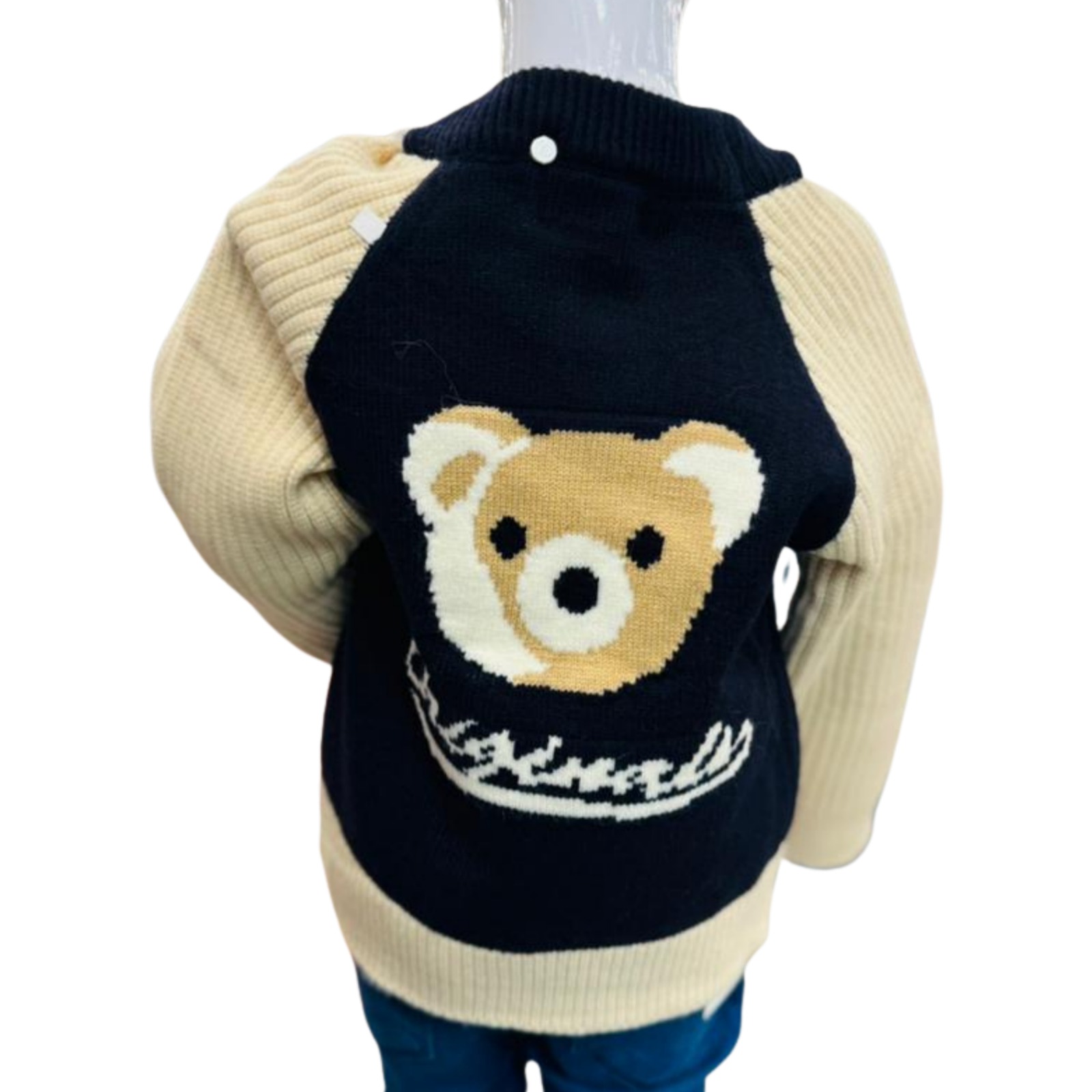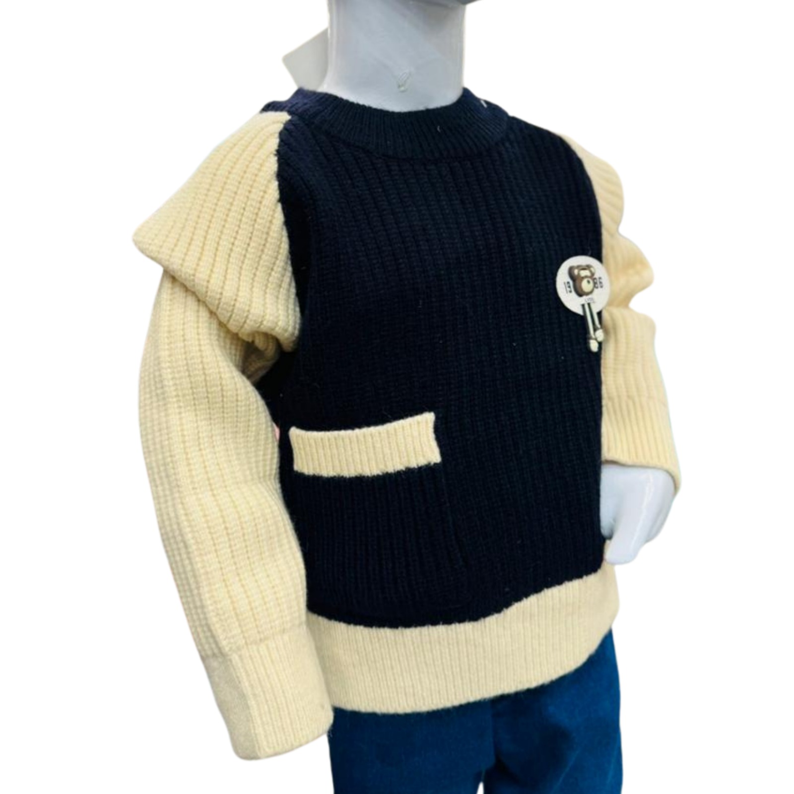 The black knit sweater features contrasting cream ribbed sleeves and hem, creating a smart color-block design. A cute decorative chest patch adds a playful touch, while the ribbed neckline and cuffs ensure a snug, cozy fit. The knit fabric is soft, breathable, and gentle on kids’ skin.