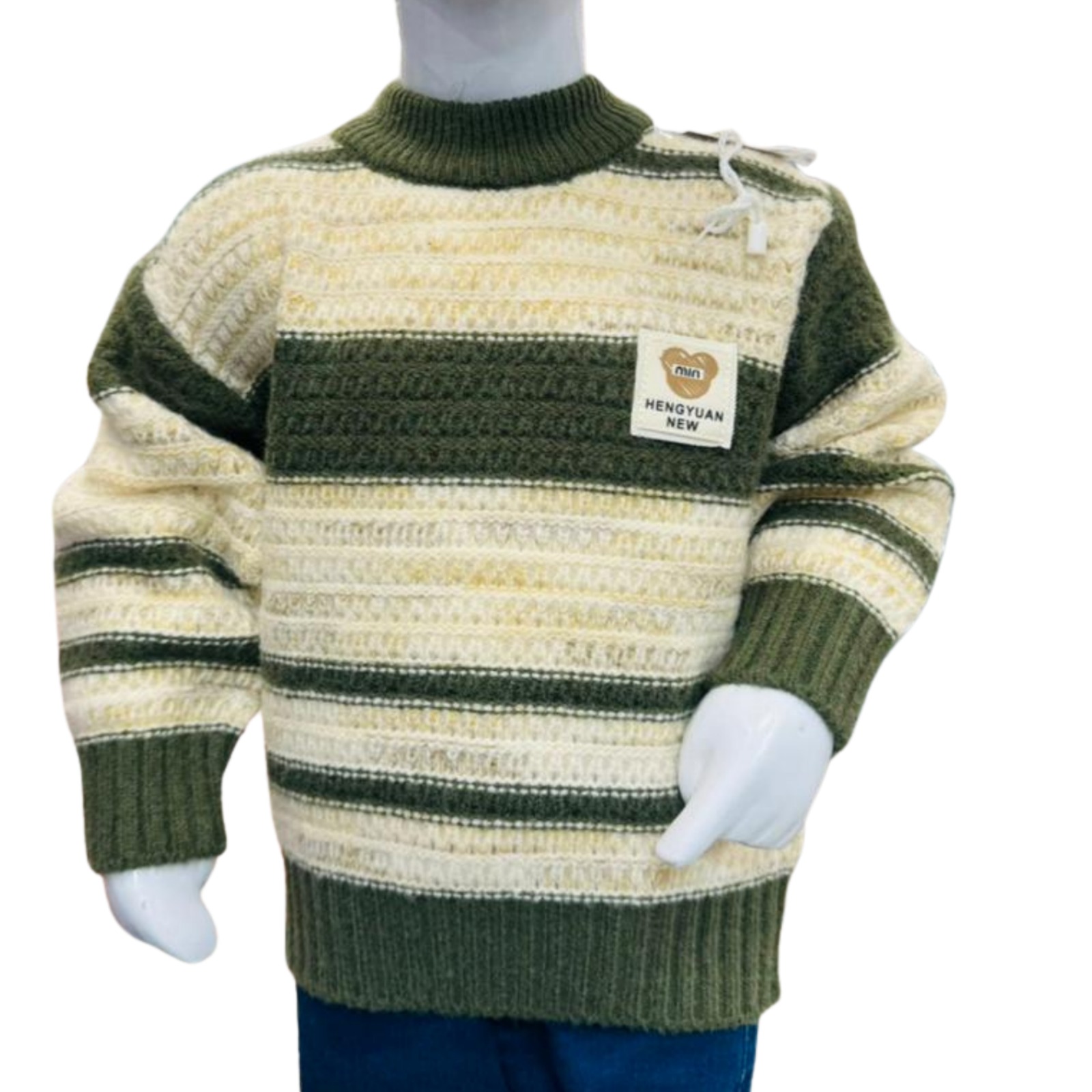 Warm and stylish striped winter sweater in green and cream tones, paired with comfortable blue denim pants for everyday kids wear.