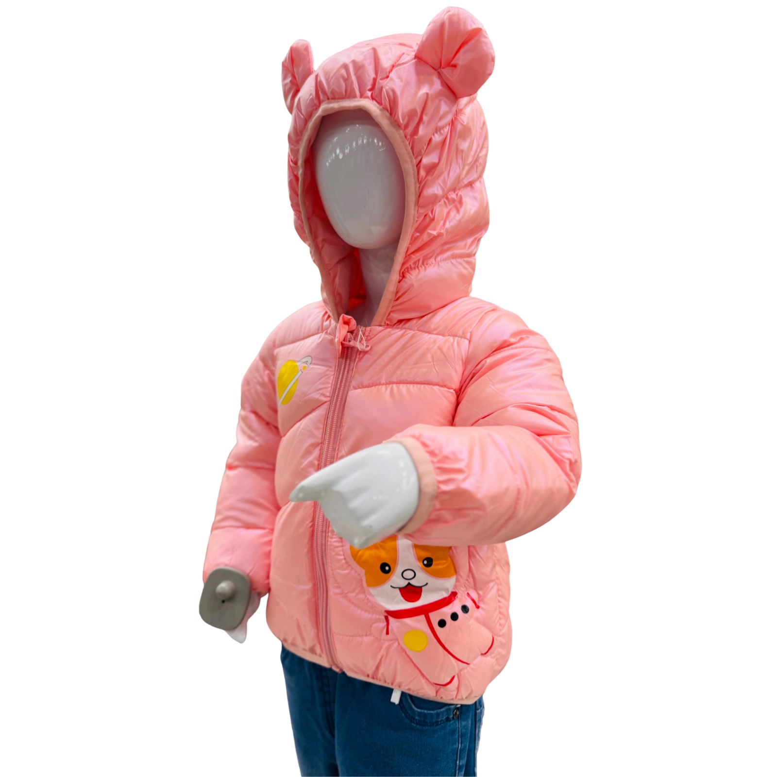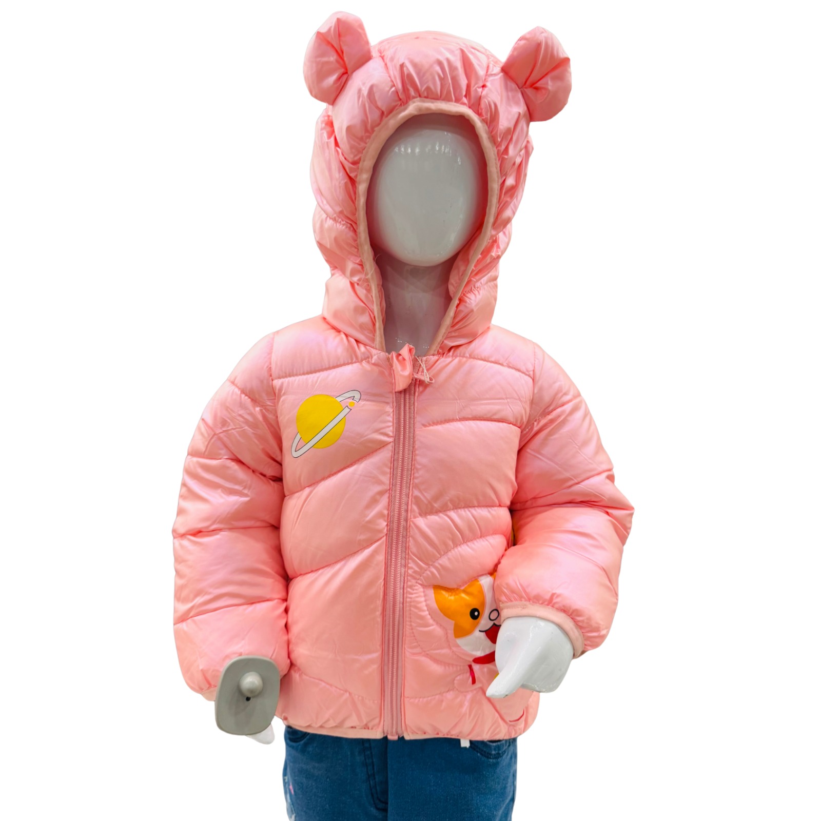 A cozy and adorable pink puffer jacket for kids, featuring a cute ear hood, soft padding, and playful cartoon details—perfect for winter warmth and style.
