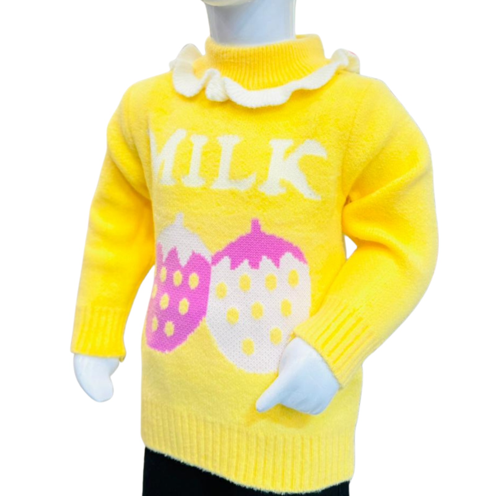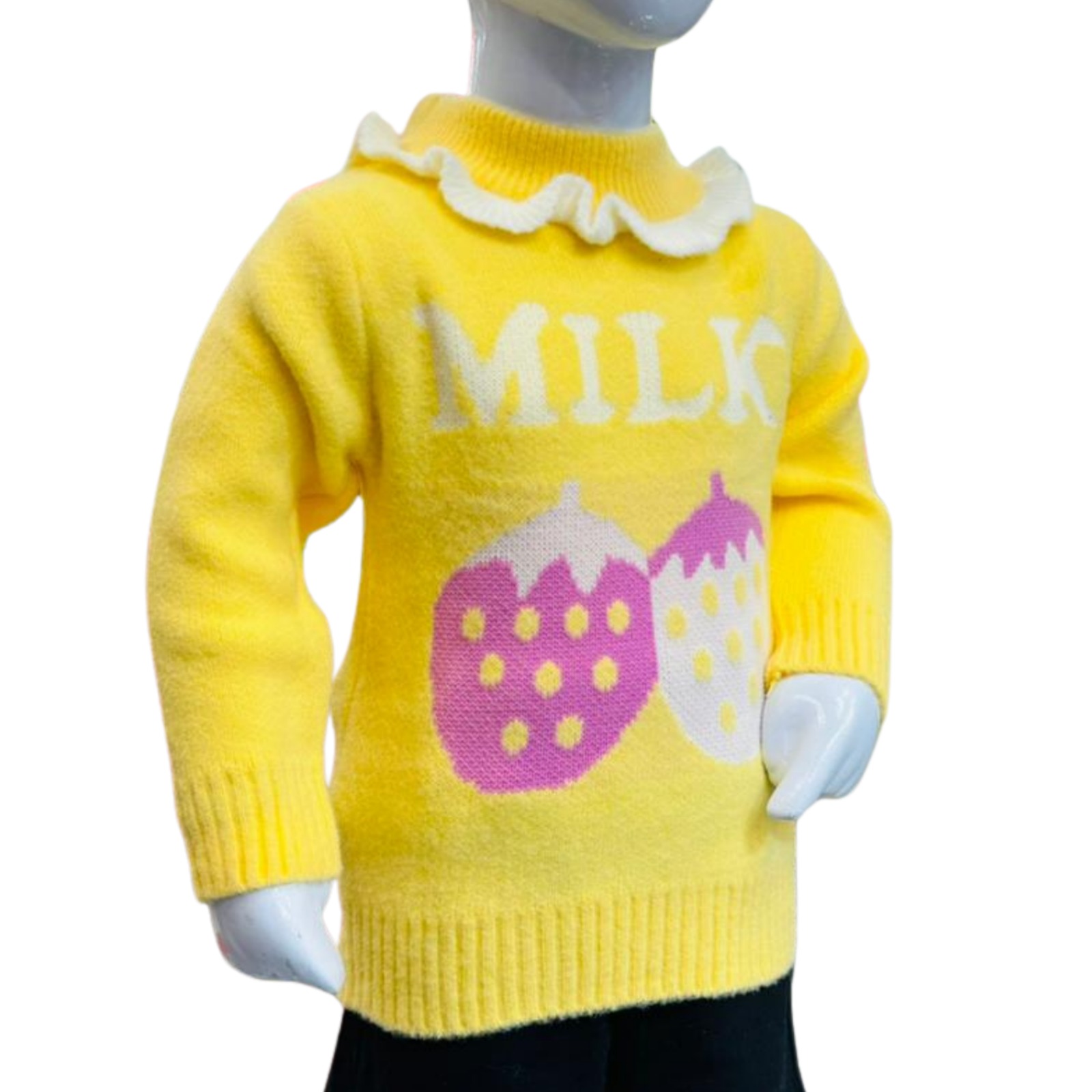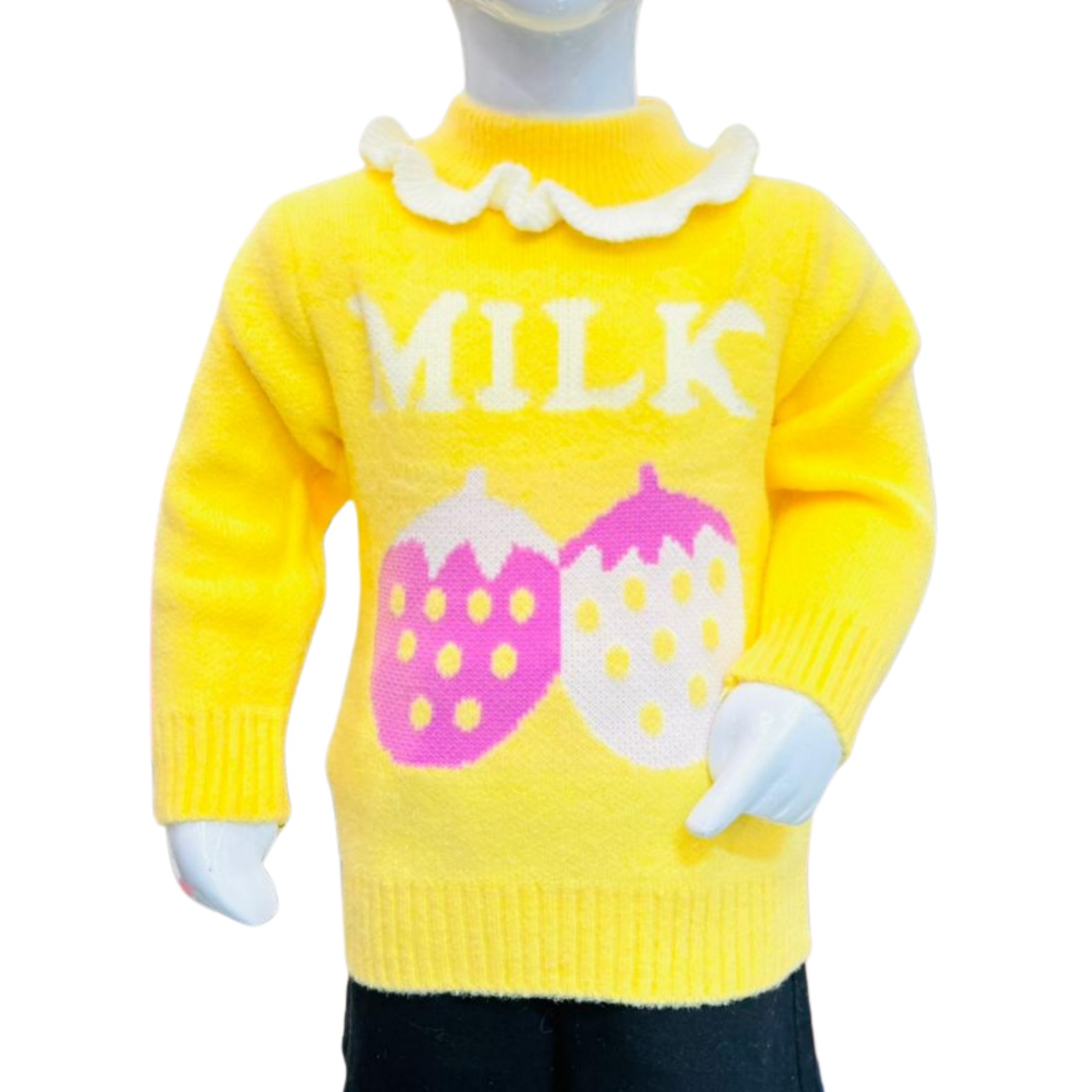 Bright and adorable yellow knit sweater for kids featuring a cute “MILK” print design, perfect for cozy and stylish winter days.